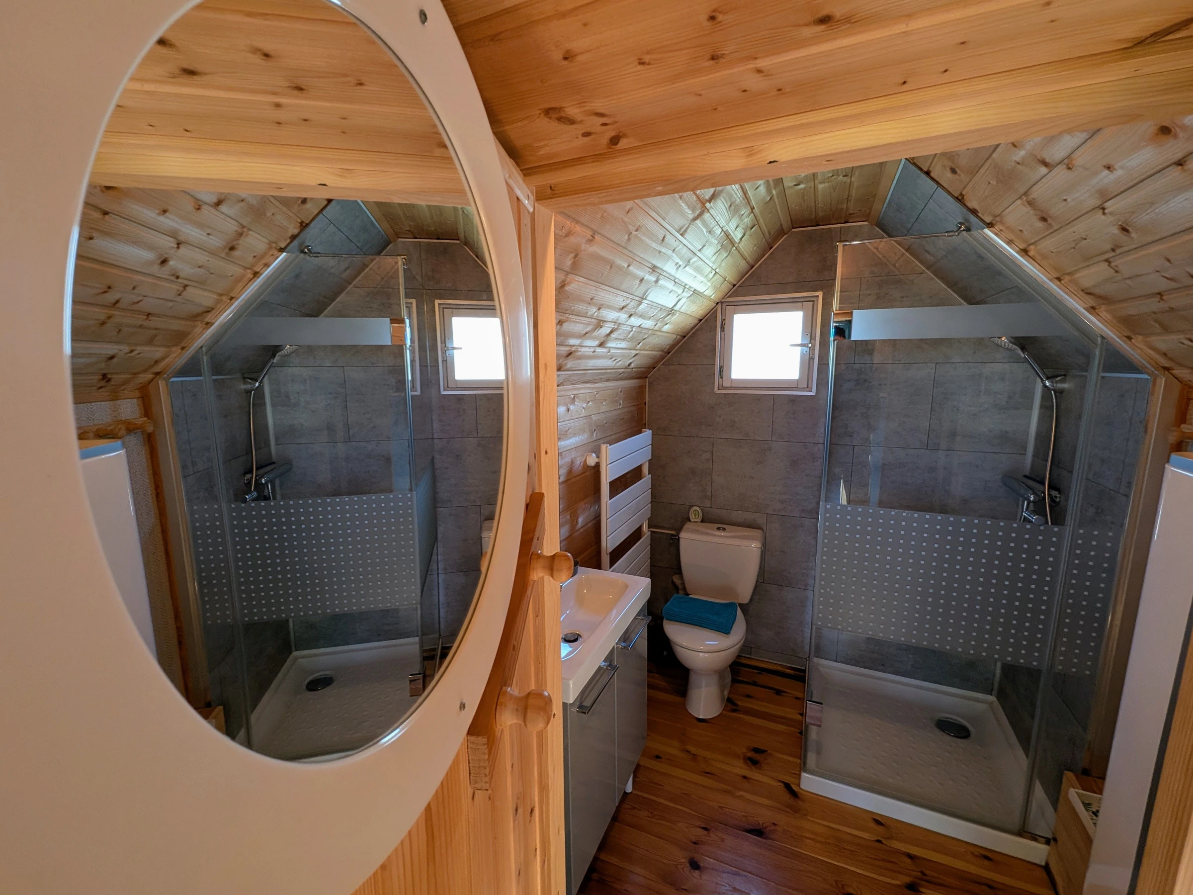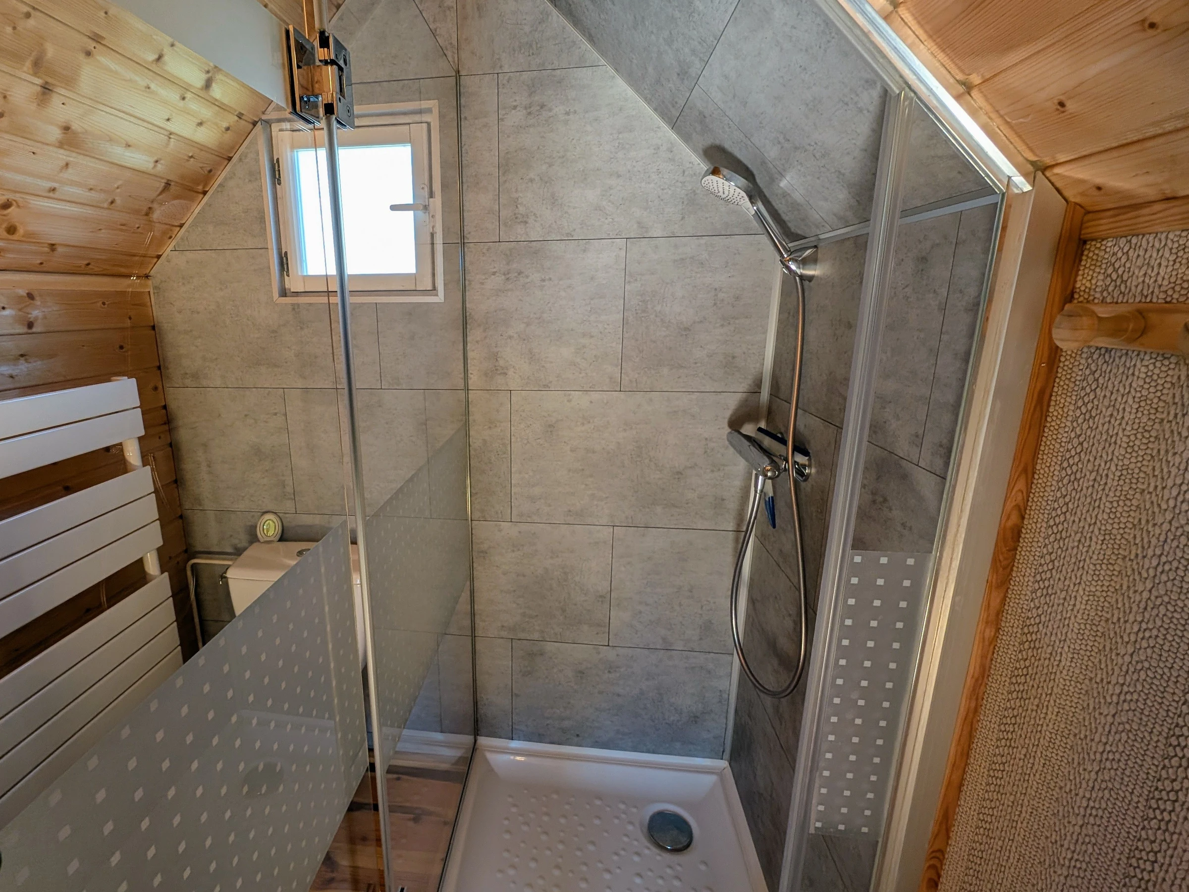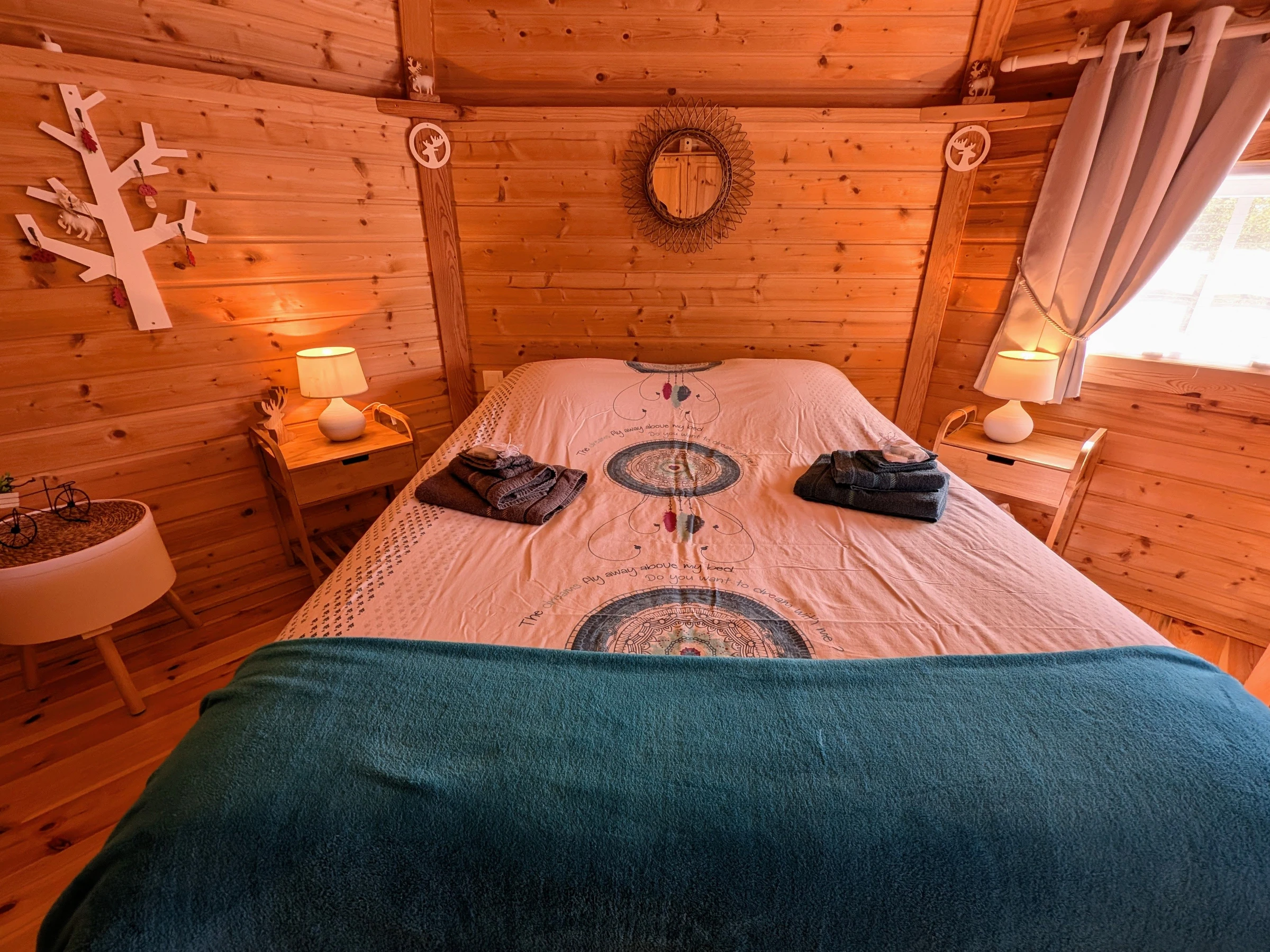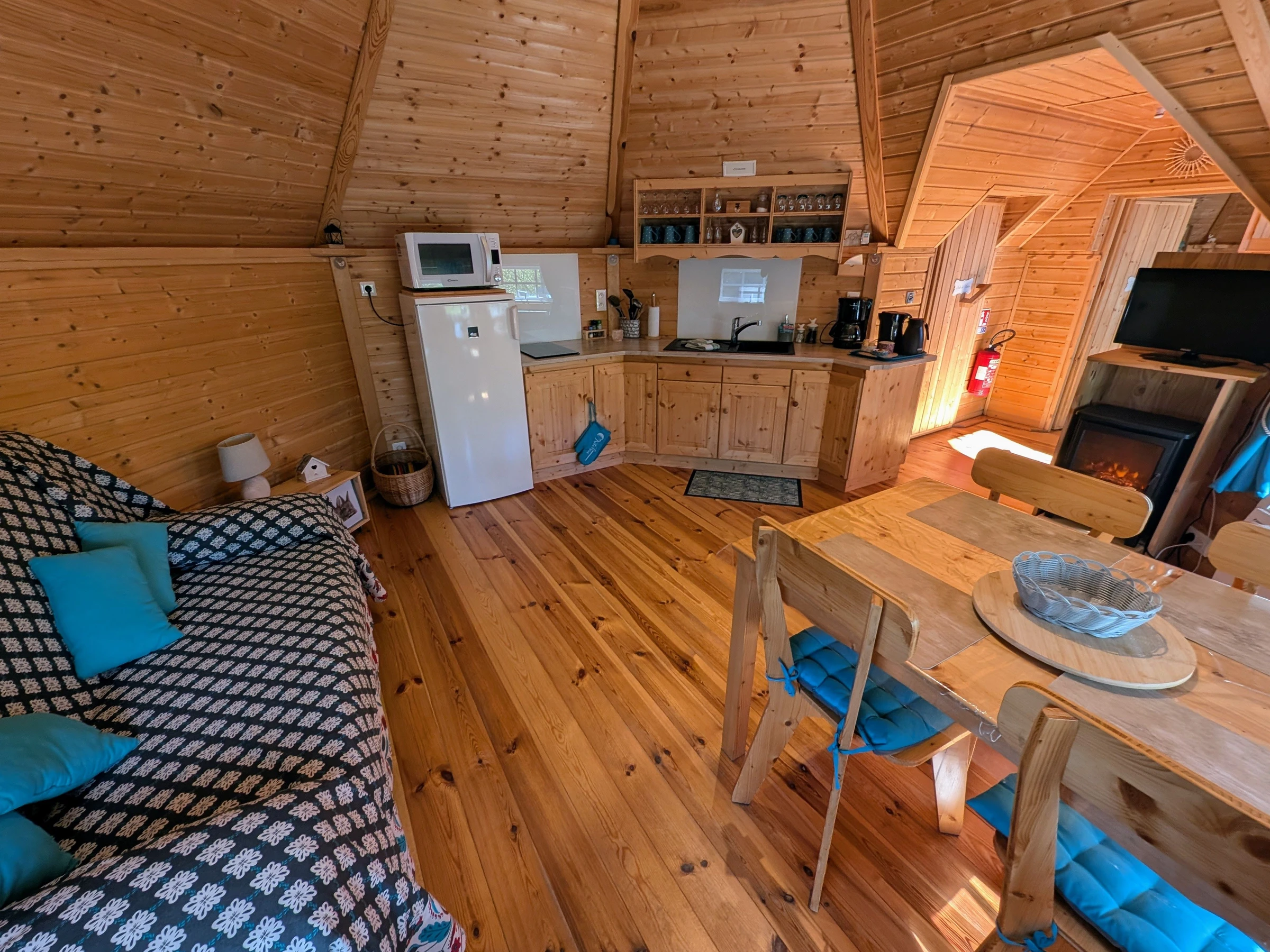 einem Doppelbett (140 x 190), einer funktionalen Küchenzeile (Herd, Kühlschrank, Spüle), einem Badezimmer mit Dusche, Waschbecken und WC sowie einer privaten Terrasse mit Grillplatz, geschützt vor der Vegetation.
