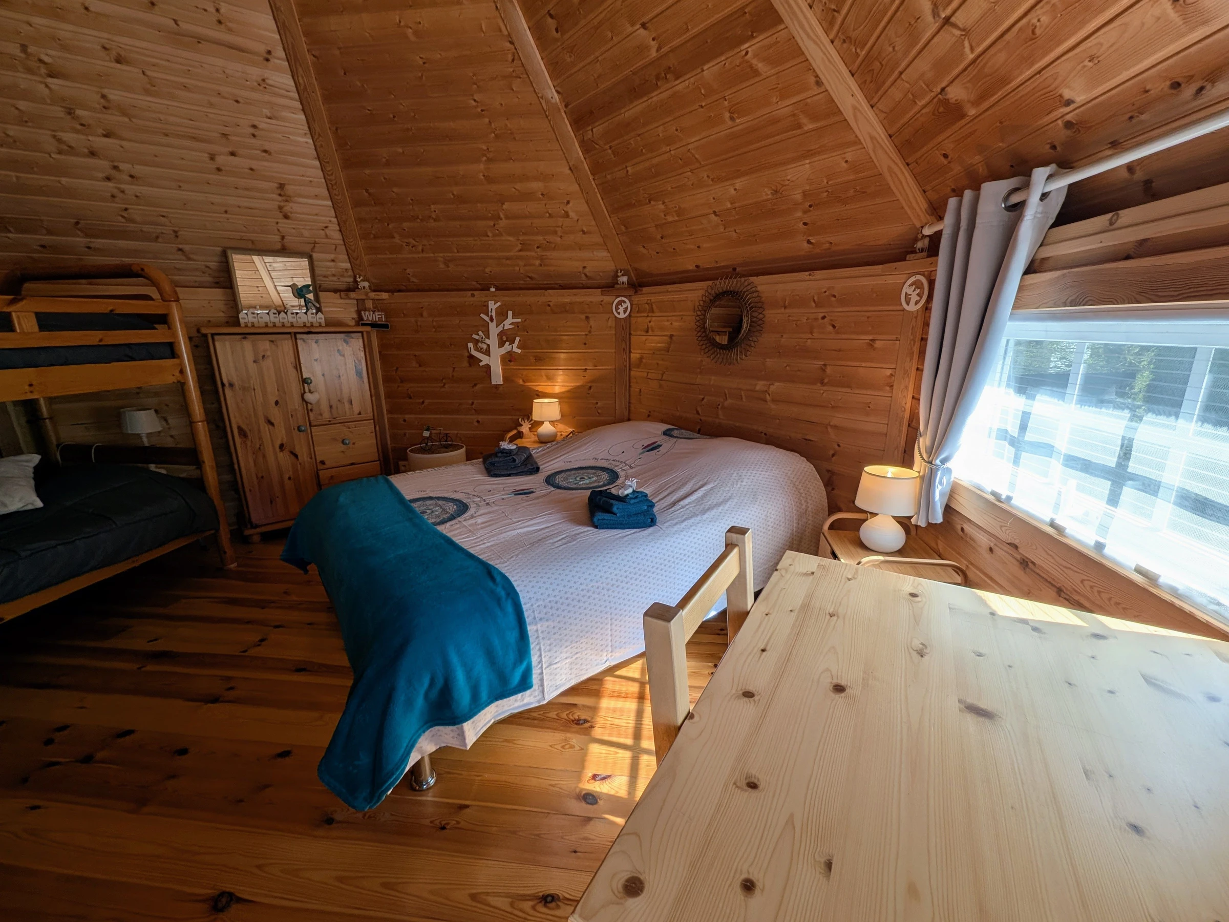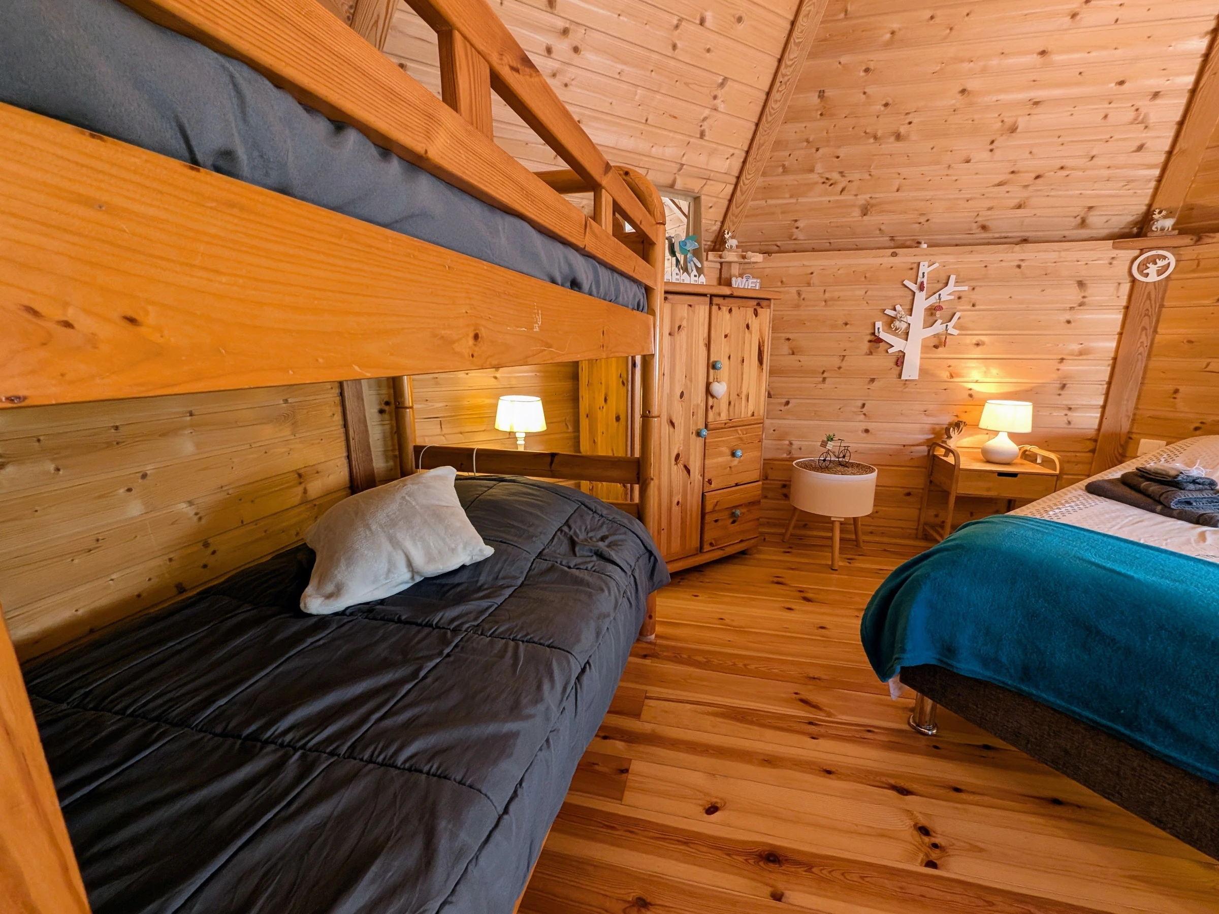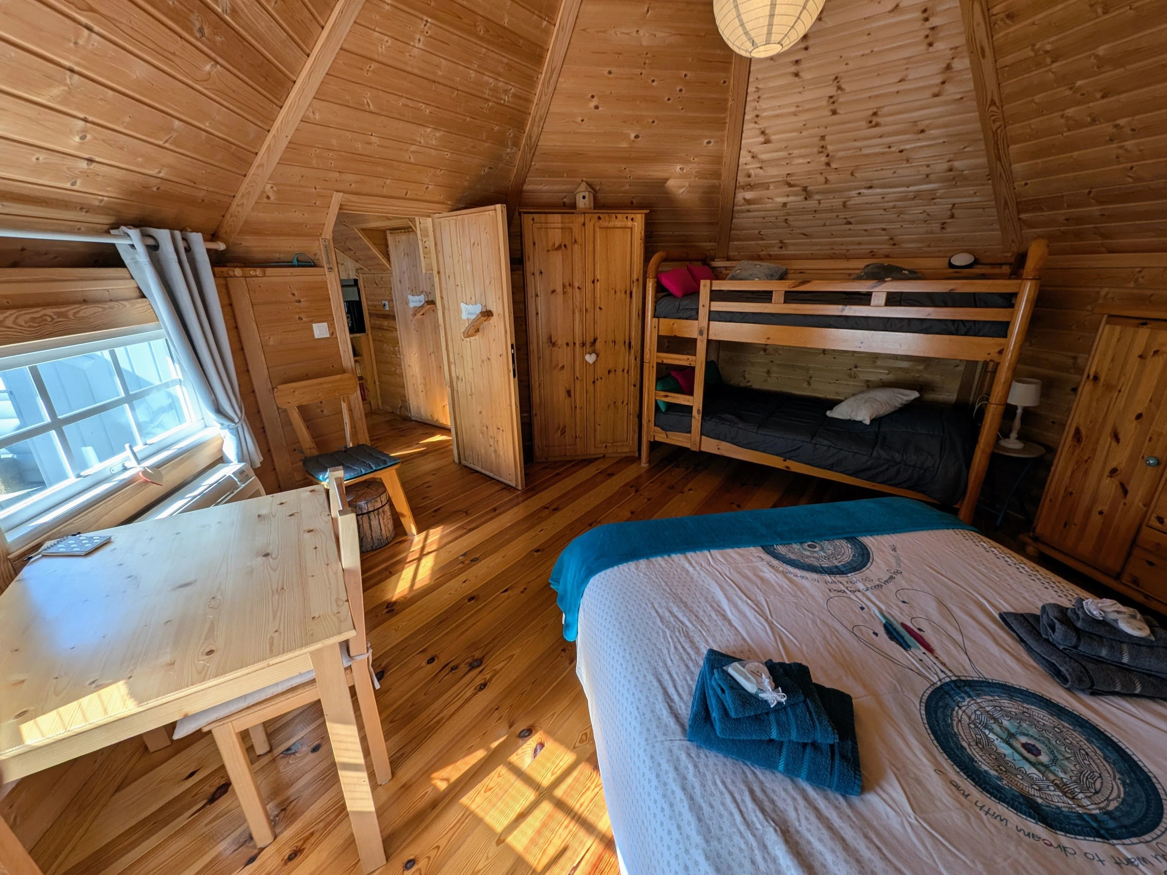 ein Schlafzimmer mit einem Doppelbett (140 x 190) und zwei Etagenbetten (90 x 190), ein Wohnzimmer mit voll ausgestatteter Küche (Herd, Kühlschrank, Spüle, Mikrowelle oder Minibackofen je nach Modell), ein Badezimmer mit Dusche, Waschbecken und WC sowie eine große private Terrasse mit Gartenmöbeln und Grill.