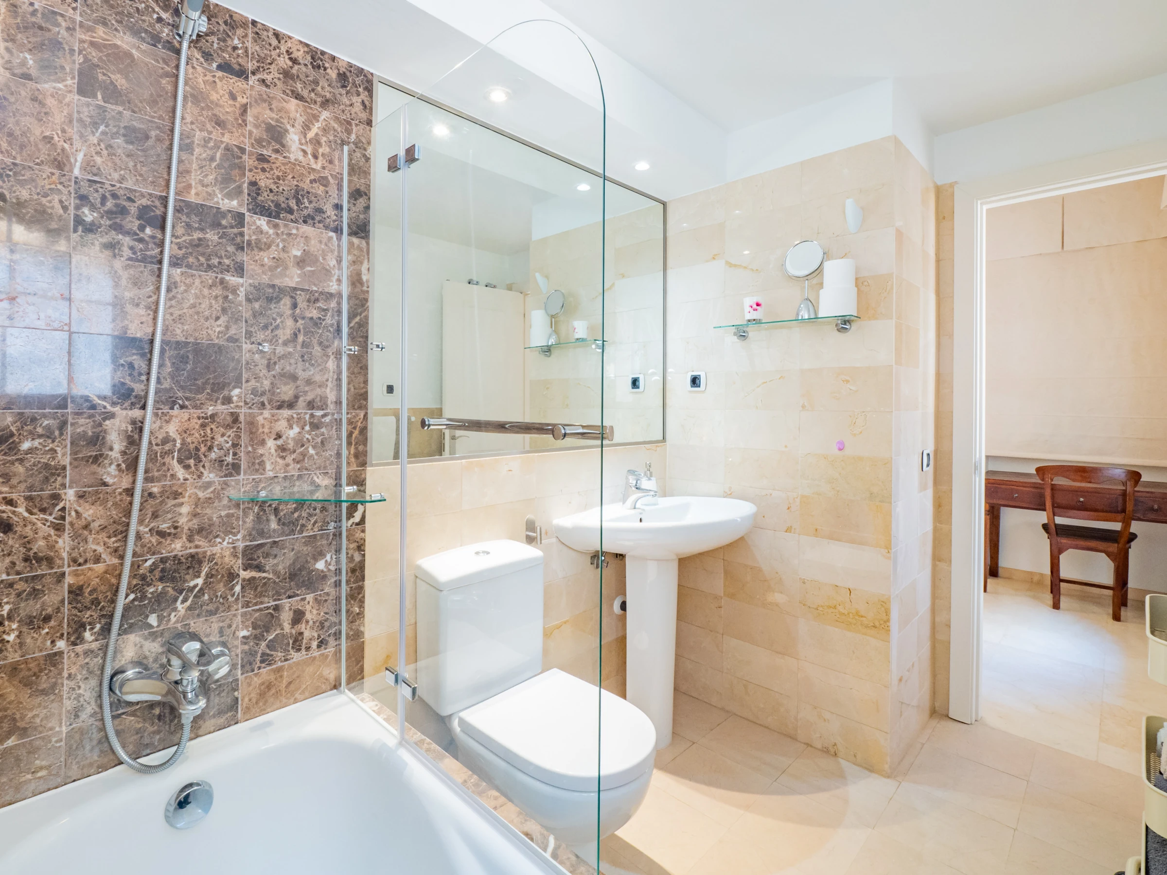 Es verfügt über zwei Schlafzimmer: das Hauptschlafzimmer mit einem Doppelbett und einem Badezimmer en suite mit Badewanne sowie ein zweites Schlafzimmer mit zwei Einzelbetten. Zusätzlich gibt es ein weiteres Badezimmer mit Badewanne im Flur für mehr Komfort 🛏️🛁.