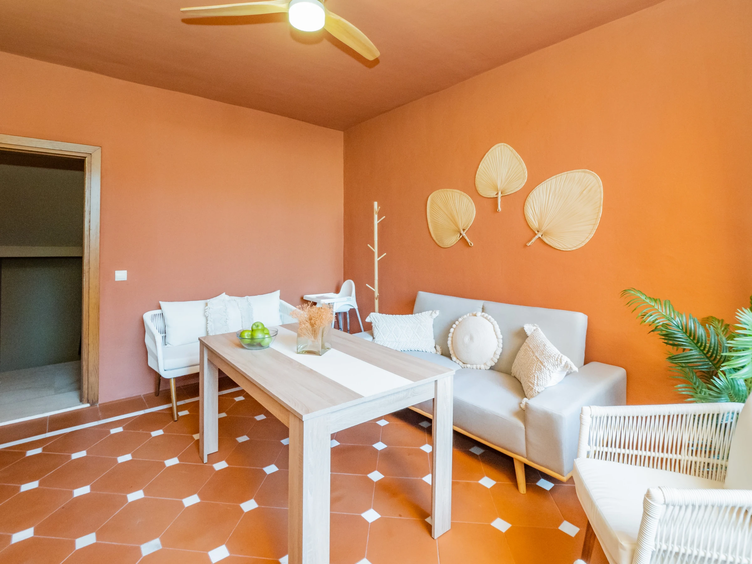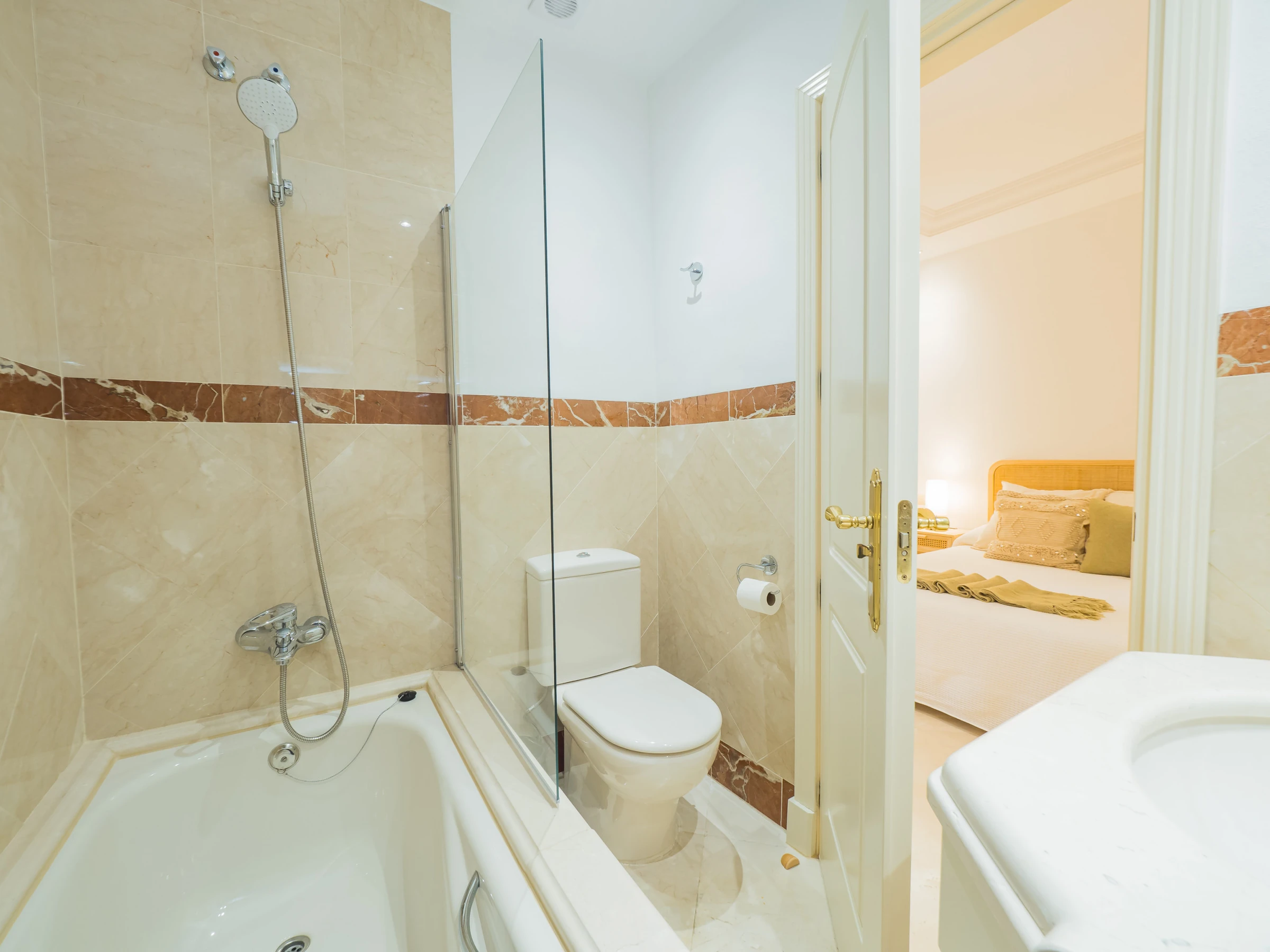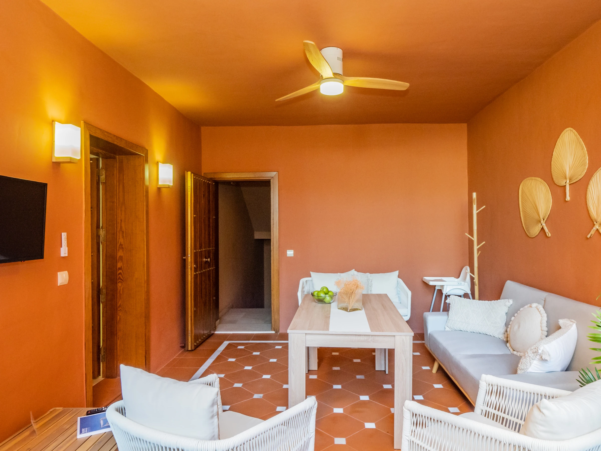 Die beiden Schlafzimmer verfügen über Doppelbetten, geräumige Kleiderschränke und Fenster oder direkten Zugang zur Terrasse, was das Eindringen von natürlichem Licht erleichtert. Eines der Schlafzimmer verfügt über ein privates Badezimmer en suite, während das zweite Badezimmer sich in einem gemeinsamen Bereich befindet und vom Flur aus zugänglich ist. Das Einzelschlafsofa im verglasten Wohnzimmer kann die fünfte Person beherbergen, obwohl in einigen Zeiträumen möglicherweise ein Aufpreis erhoben wird. 📺🛏️