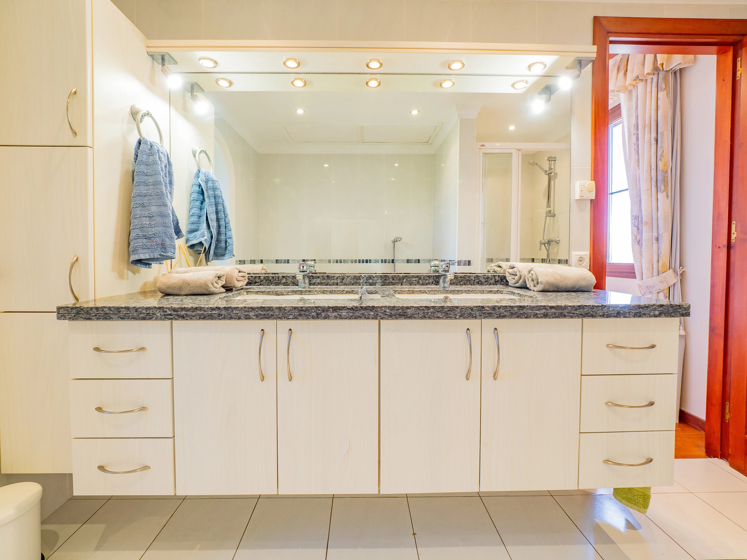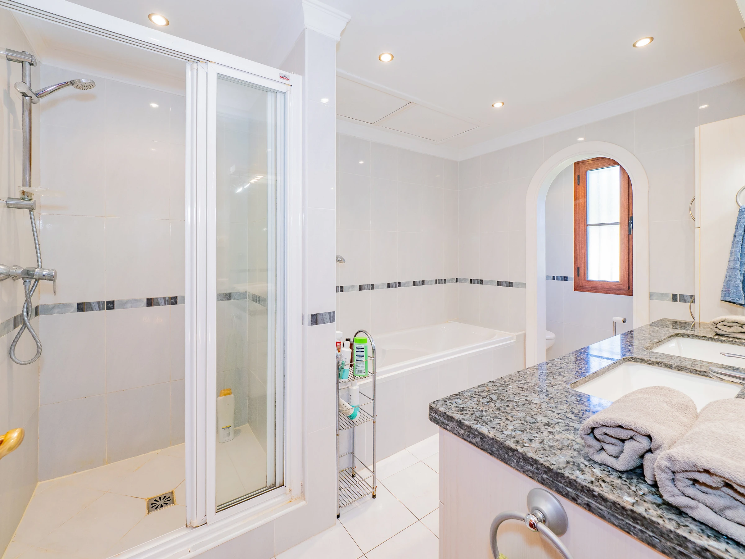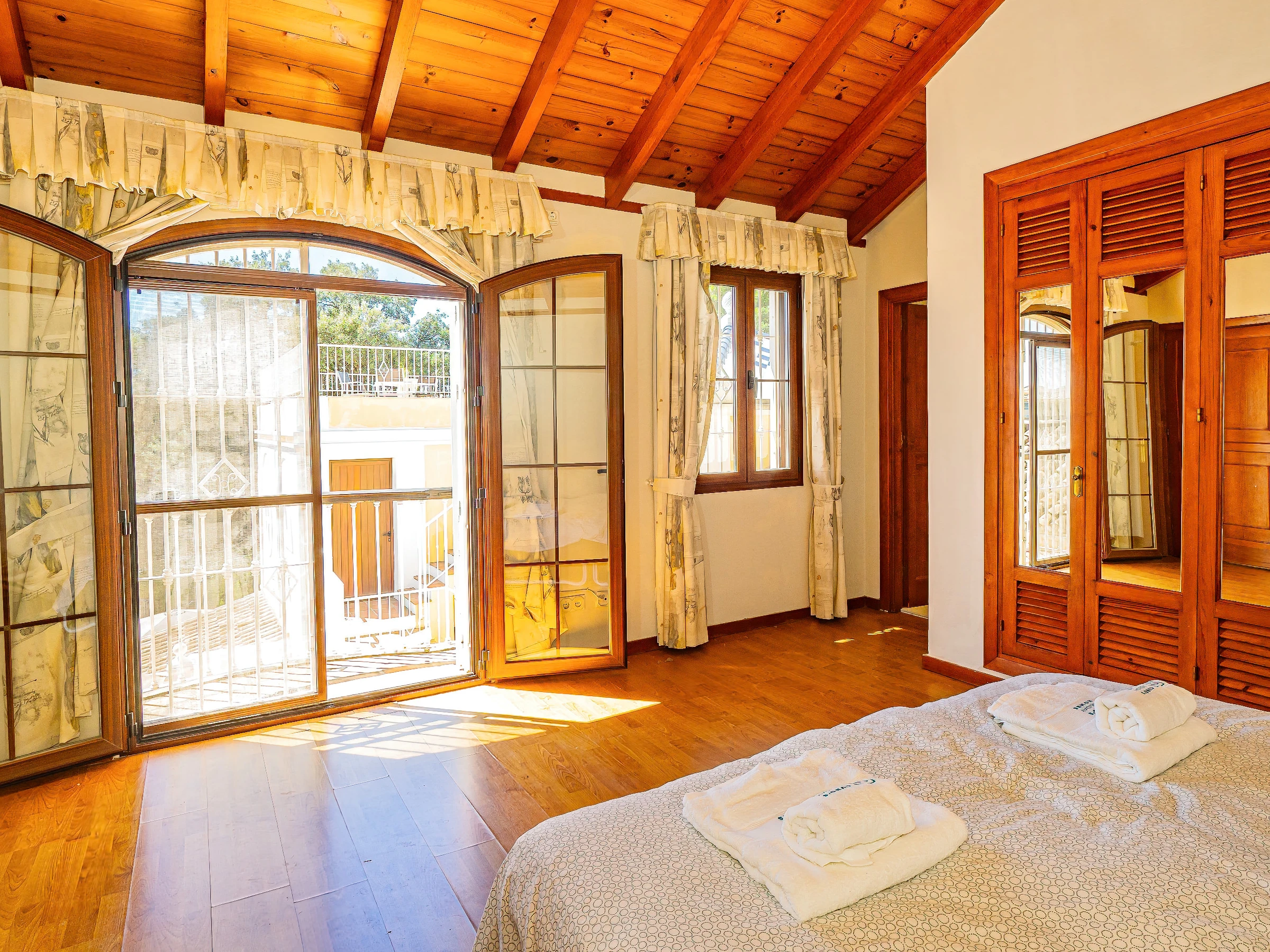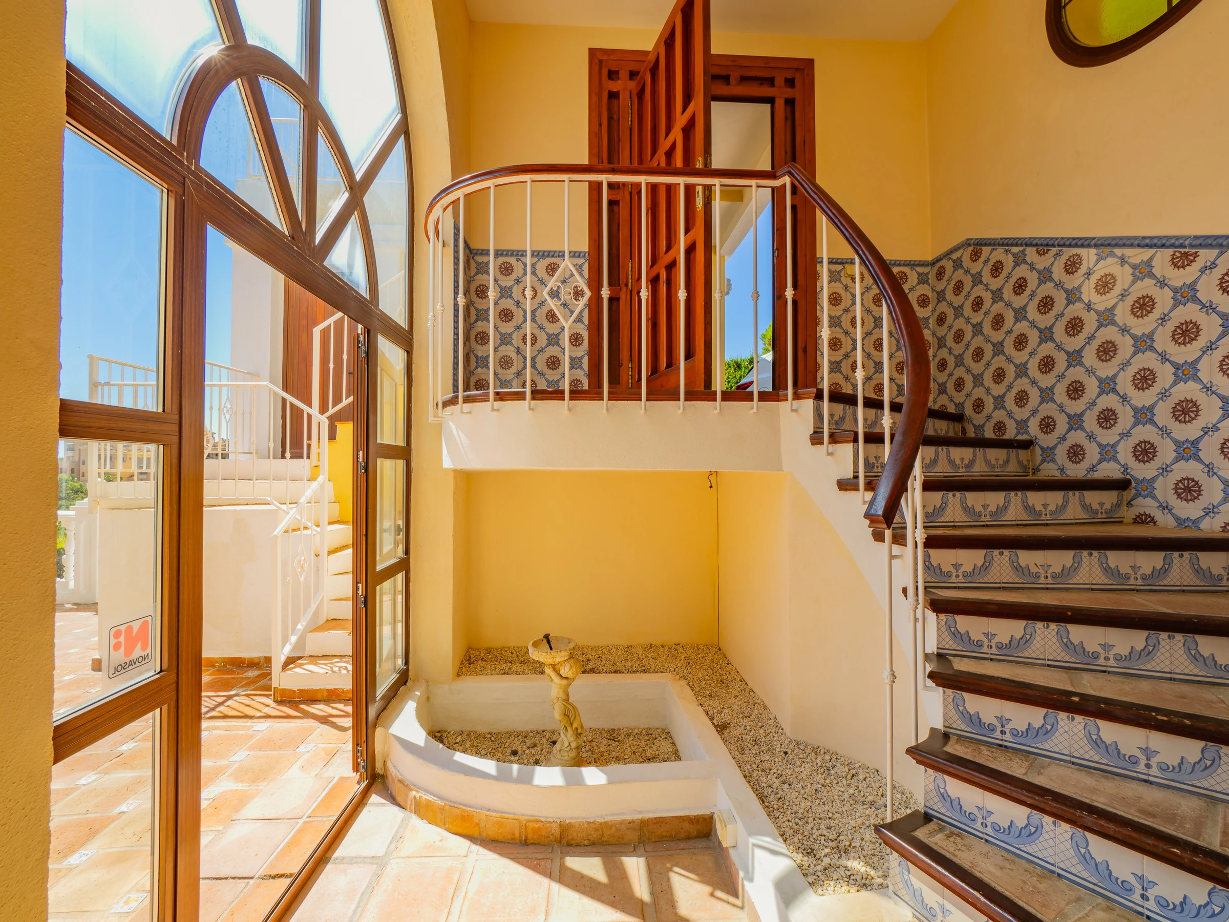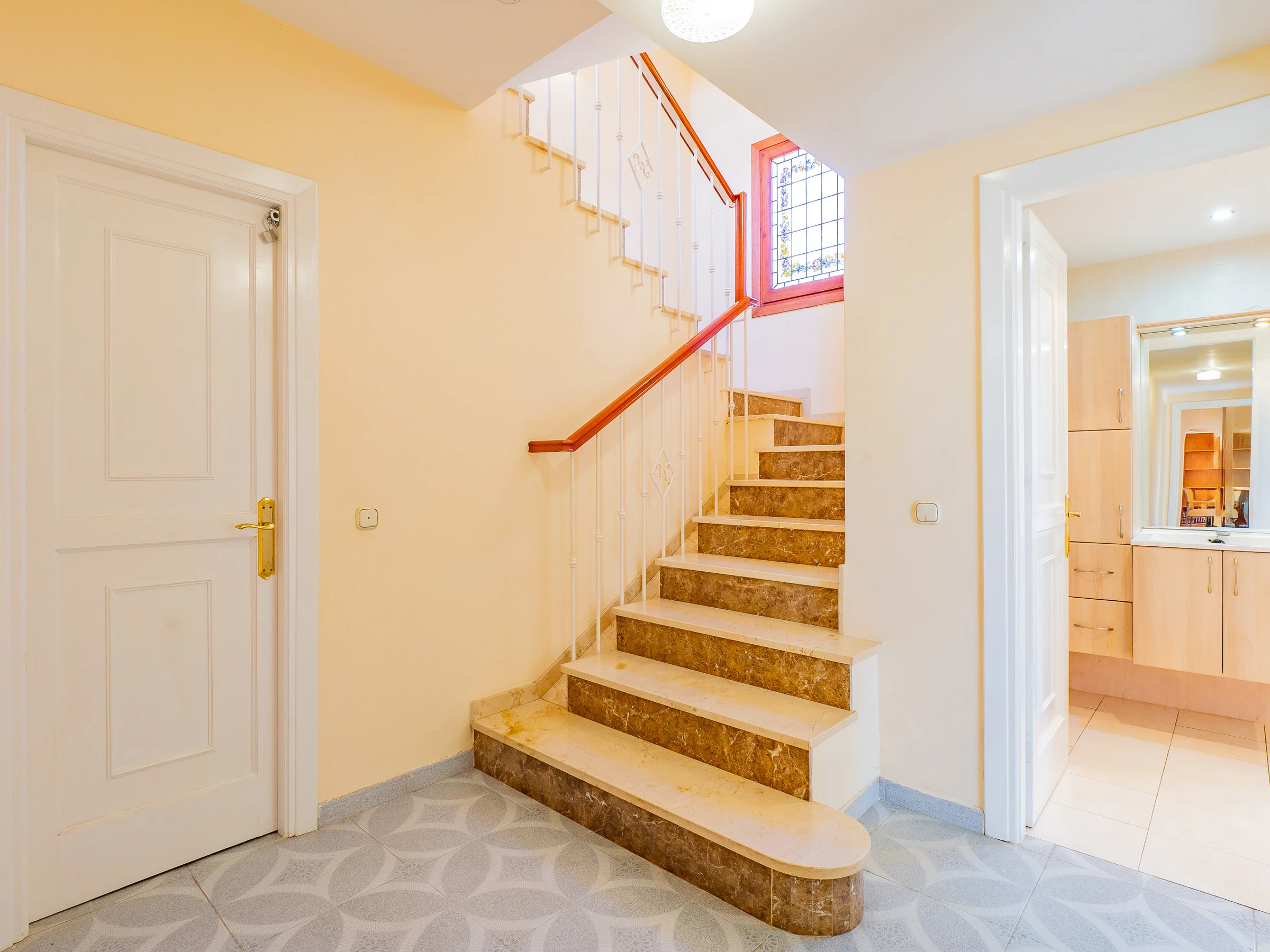 Die Innentreppe verbindet das Untergeschoss, in dem sich die meisten Schlafzimmer befinden, mit dem Obergeschoss, das ein Hauptschlafzimmer mit Ensuite-Bad beherbergt. Vom Innenhof aus führen zwei Außentreppen: Eine führt zu einer Terrasse mit Ausblick und Mobiliar, perfekt zum Entspannen, und die andere verbindet direkt mit dem Poolbereich, der auch von zwei Schlafzimmern aus zugänglich ist. 🛌🌅