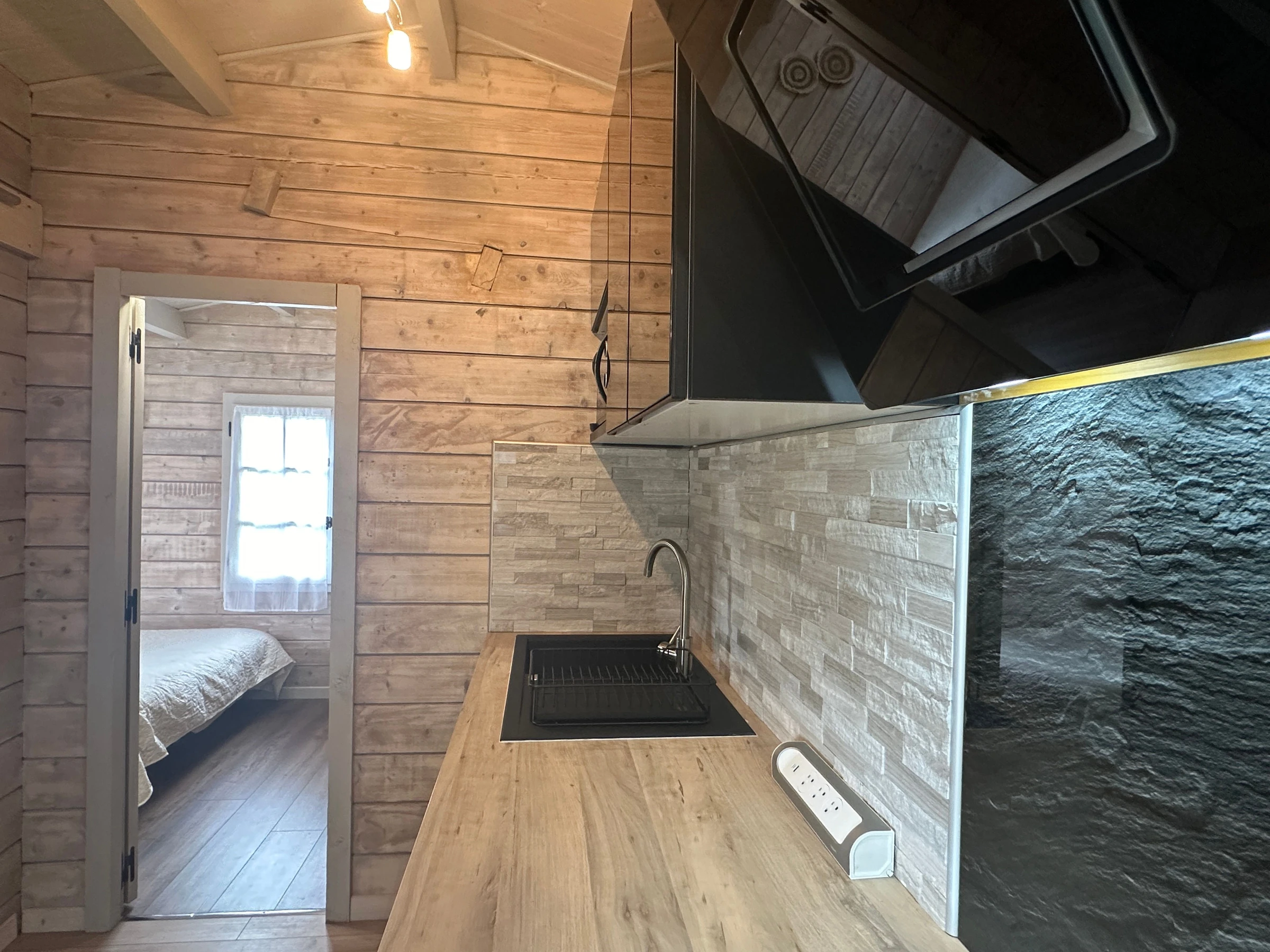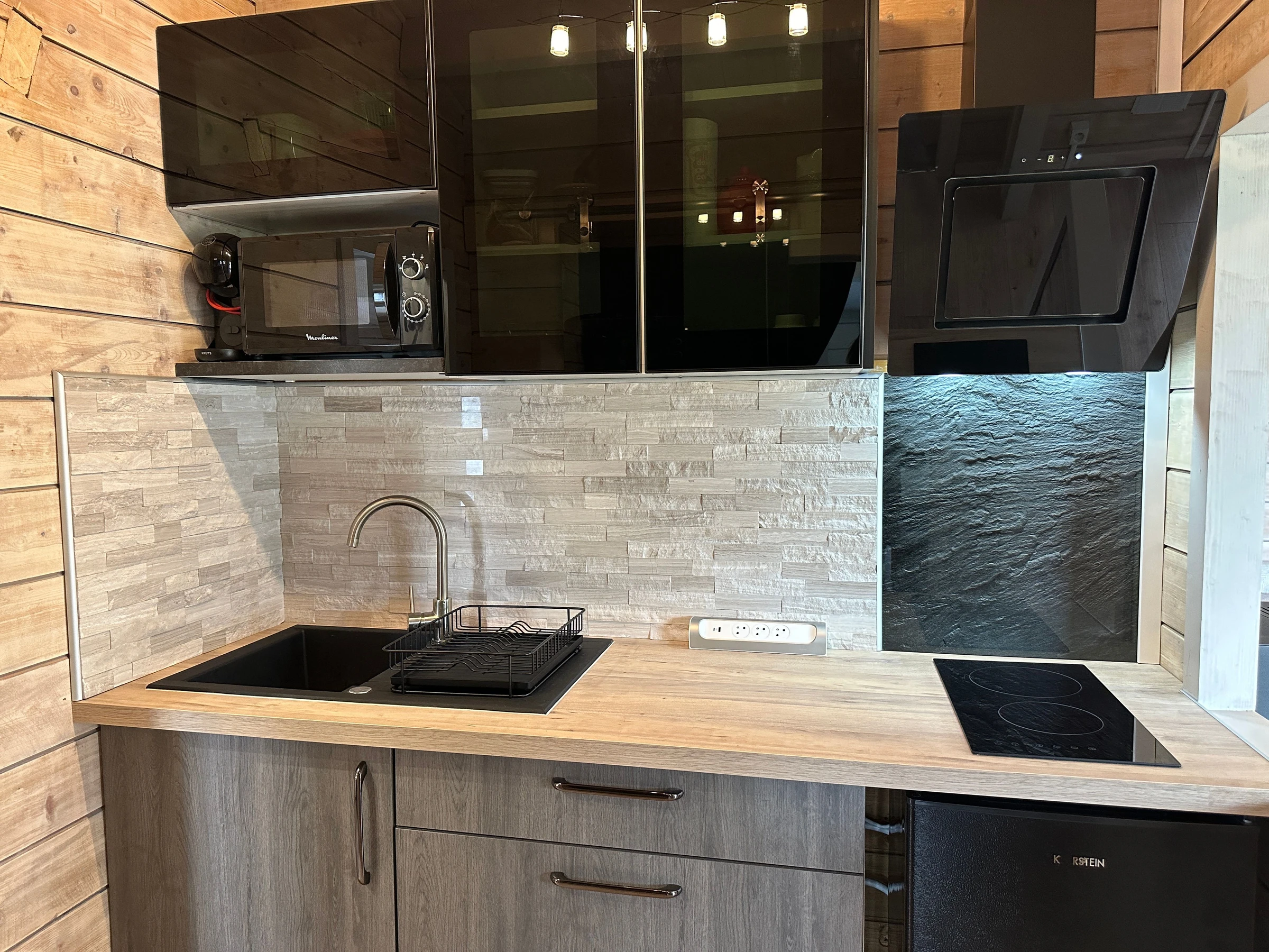 Offene Küche mit Kochfeld, Dunstabzugshaube, Mikrowelle usw. (kein Backofen oder Geschirrspüler).