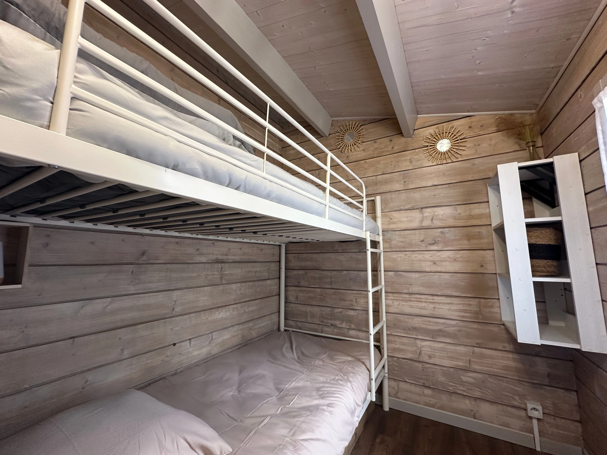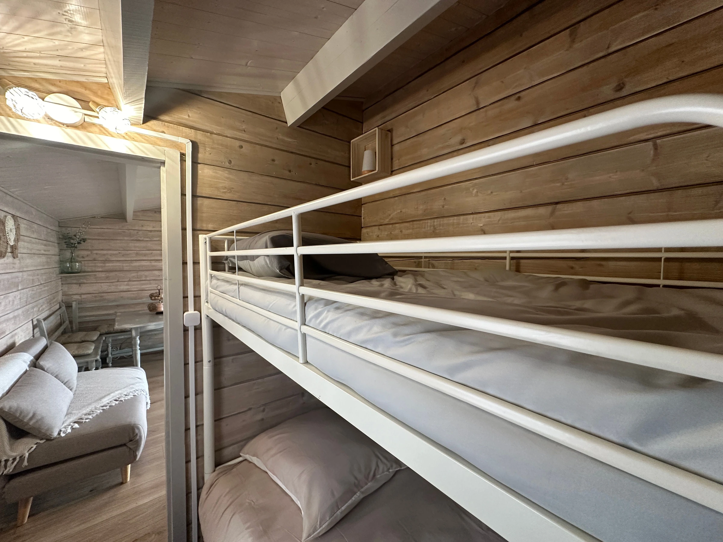 Es gibt zwei Schlafzimmer: eines mit einem Doppelbett (140 x 190 cm) und das andere mit zwei Einzelbetten (Etagenbett). Bitte beachten Sie, dass das obere Bett nicht für Kinder unter 6 Jahren geeignet ist. Ein Hochstuhl und ein Kinderbett sind vorhanden.