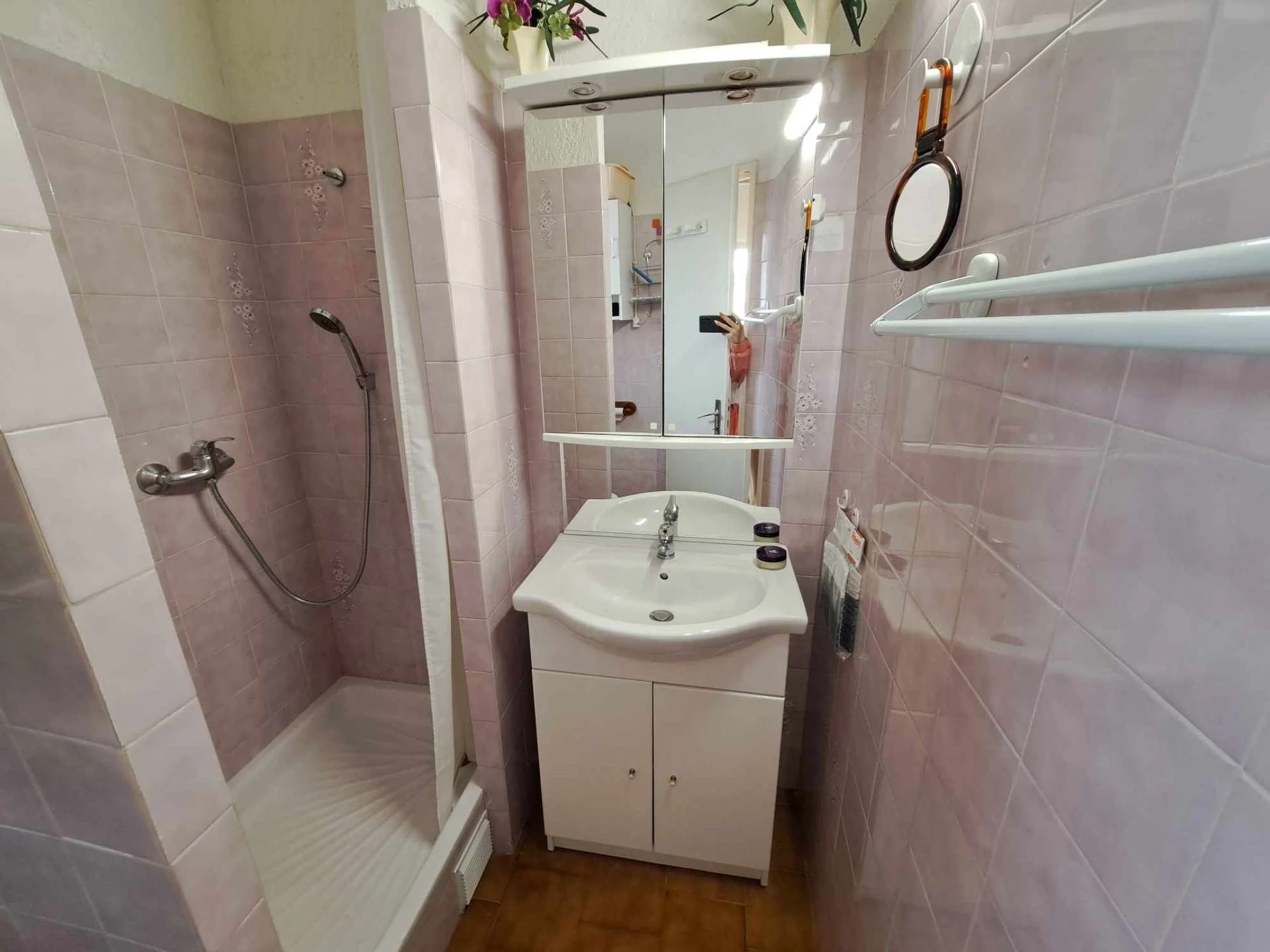 Das Badezimmer ist mit Dusche, Waschbecken und WC ausgestattet.