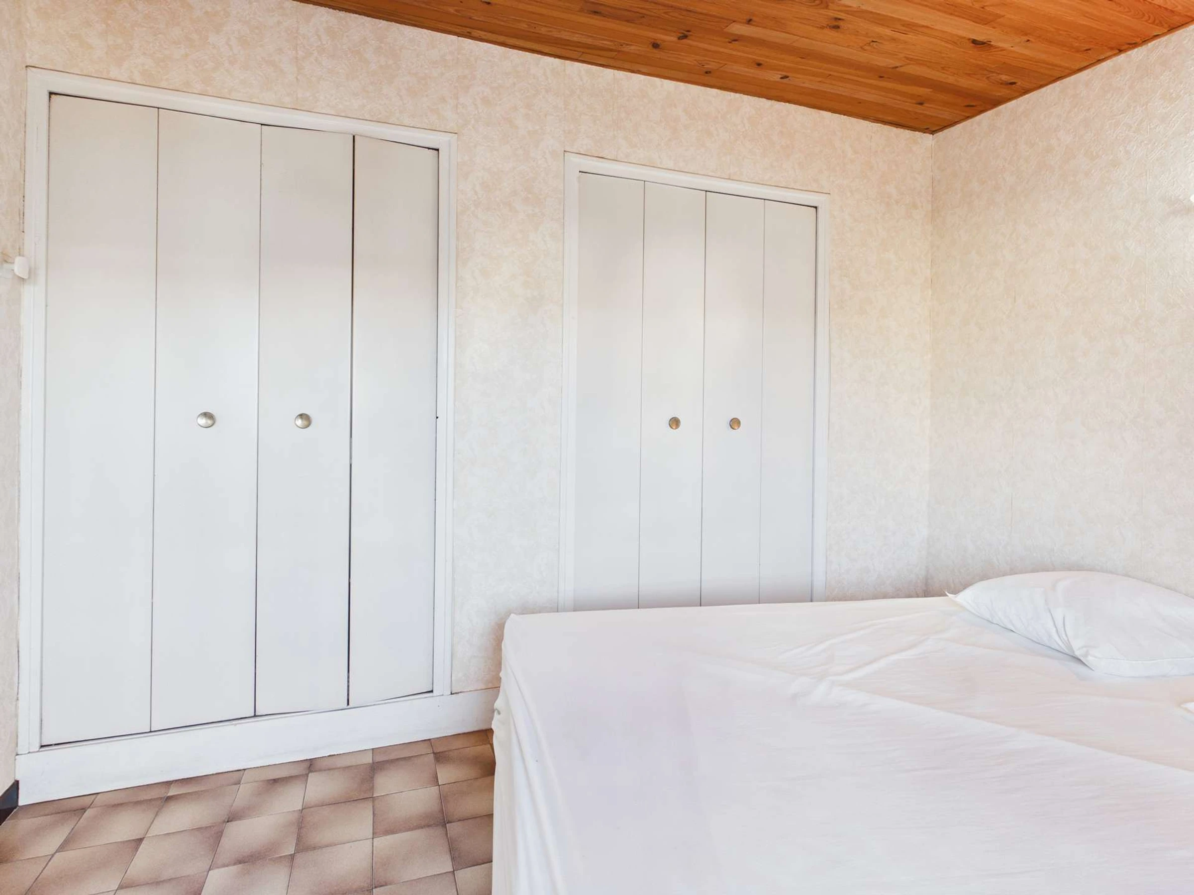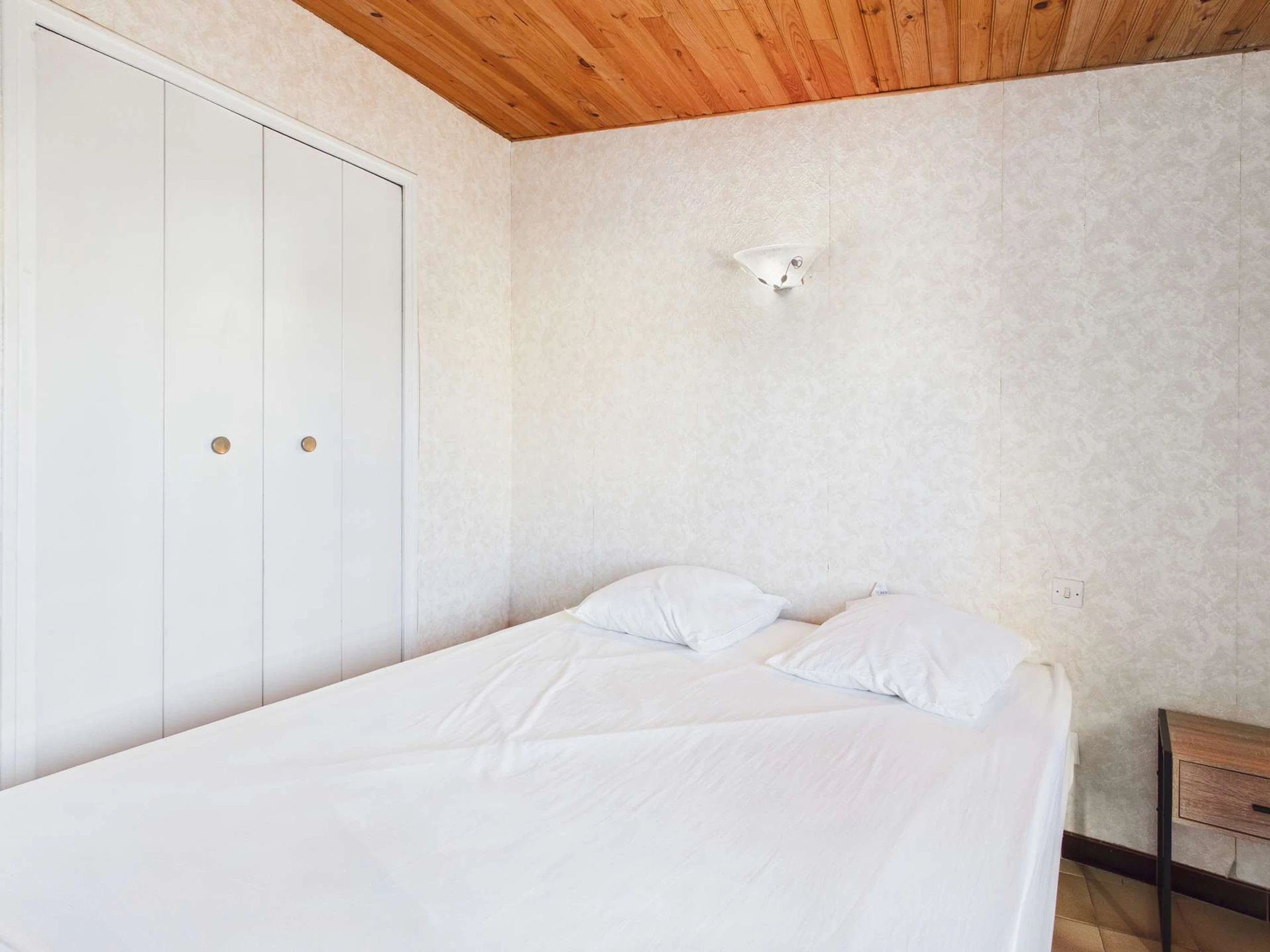 Schlafzimmer mit 140 cm breitem Bett und Kleiderschrank.
