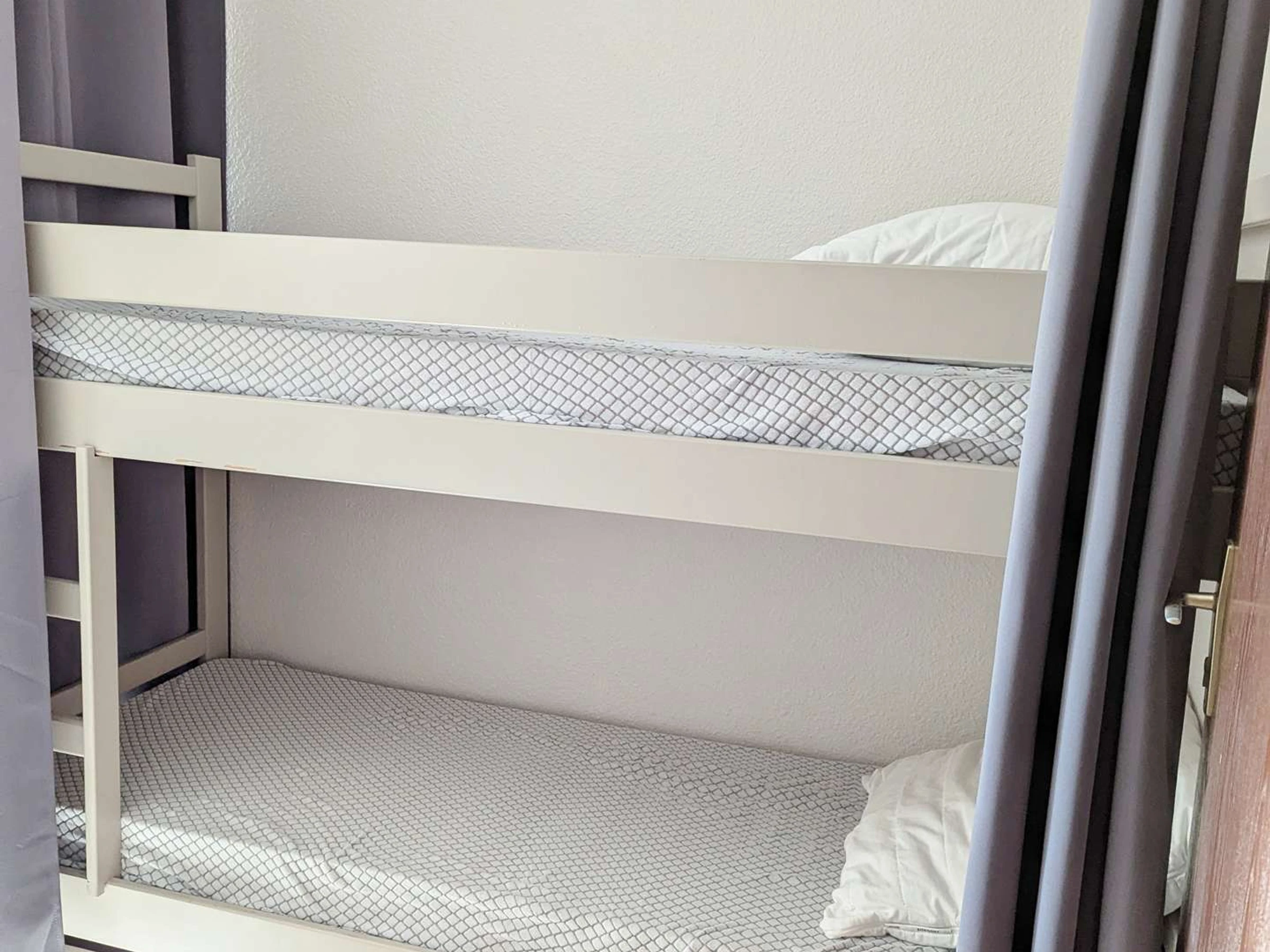 Es verfügt über ein helles, klimatisiertes Wohnzimmer mit Sofa (kein Schlafsofa), Tisch und Stühlen sowie einem Fernseher. Die voll ausgestattete Küchenzeile umfasst ein Cerankochfeld, einen Kühl-/Gefrierschrank, eine Waschmaschine, einen Geschirrspüler, eine Mikrowelle, eine Kaffeemaschine und einen Wasserkocher. Das Schlafzimmer ist mit einem Doppelbett, einem Fernseher und Stauraum ausgestattet. Eine Schlafnische mit zwei Etagenbetten bietet Kindern bequem Platz.