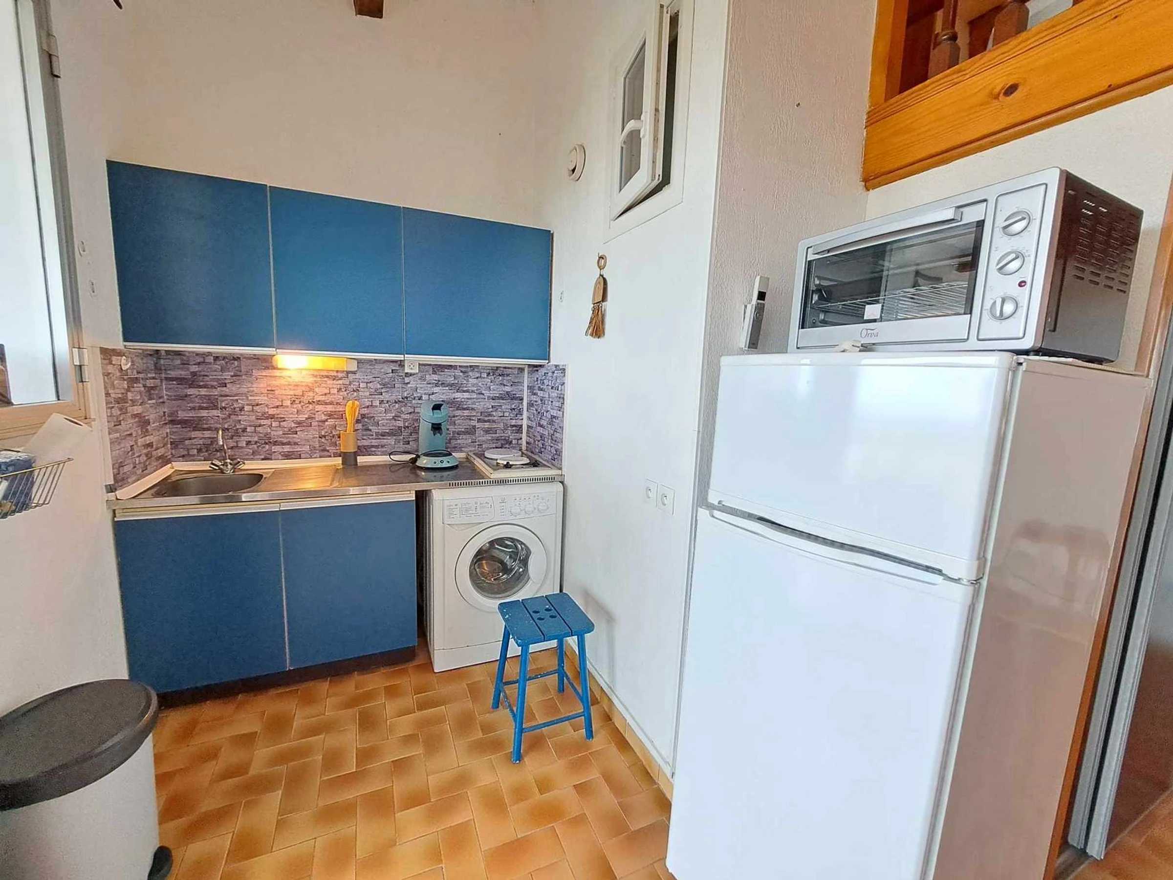 Küchenzeile mit Elektroherd, Mikrowelle, Kühl-/Gefrierschrank, Minibackofen und Kaffeemaschine.