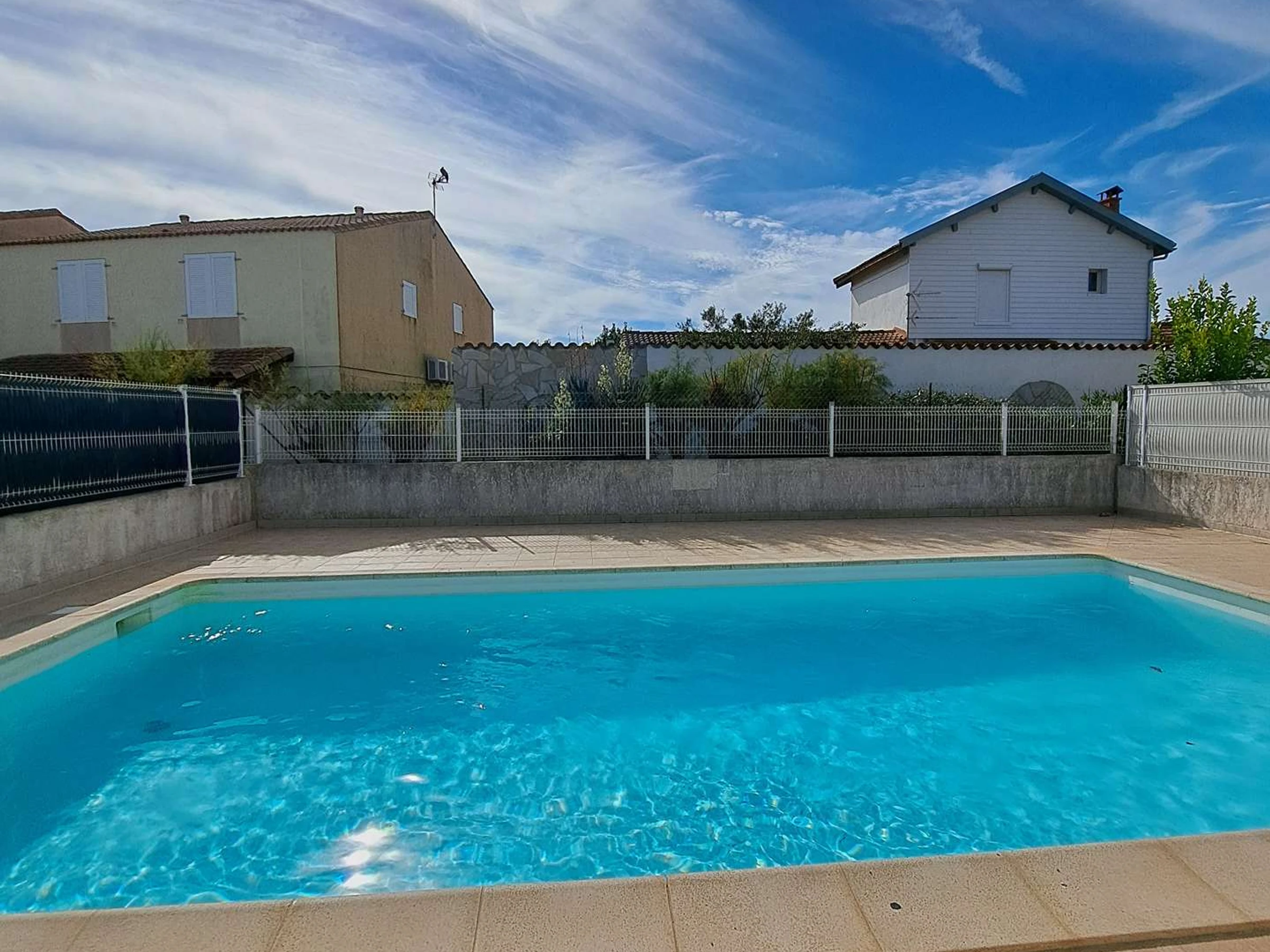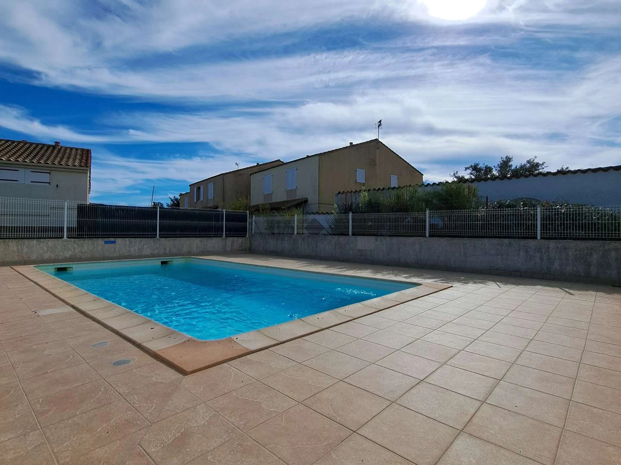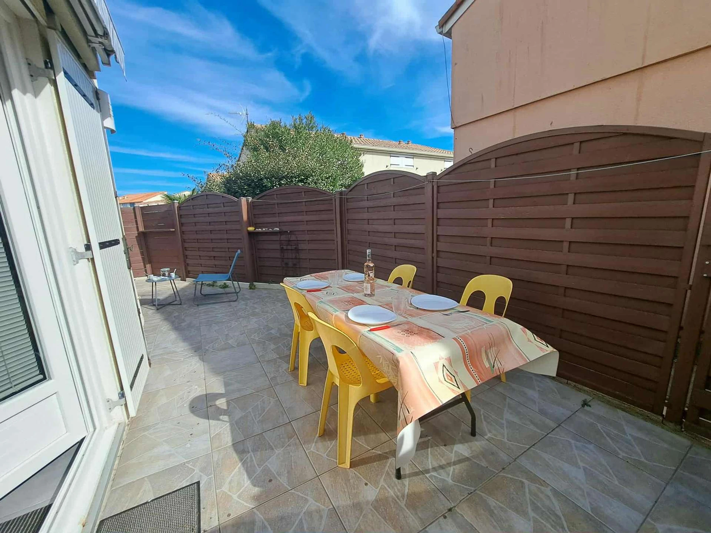Kleines Doppelhaus in der sicheren Wohnanlage Mas de la Plage mit Gemeinschaftspool. Im Erdgeschoss befinden sich ein Wohnzimmer mit 140 cm Schlafcouch und Fernseher, eine Küchenzeile mit Kühl-/Gefrierkombination, zwei Induktionskochfeldern, Mikrowelle und Waschmaschine sowie ein Duschbad mit Dusche und WC. Im Obergeschoss gibt es eine 120 cm Schlafcouch im Flur und ein Schlafzimmer mit einem 140 cm Bett. Klimaanlage ist nur im Obergeschoss in den Schlafzimmern vorhanden. Draußen lädt eine große Terrasse mit Gartenmöbeln und Markise zum Verweilen und Entspannen ein. Private Parkplätze stehen auf dem Gelände zur Verfügung.