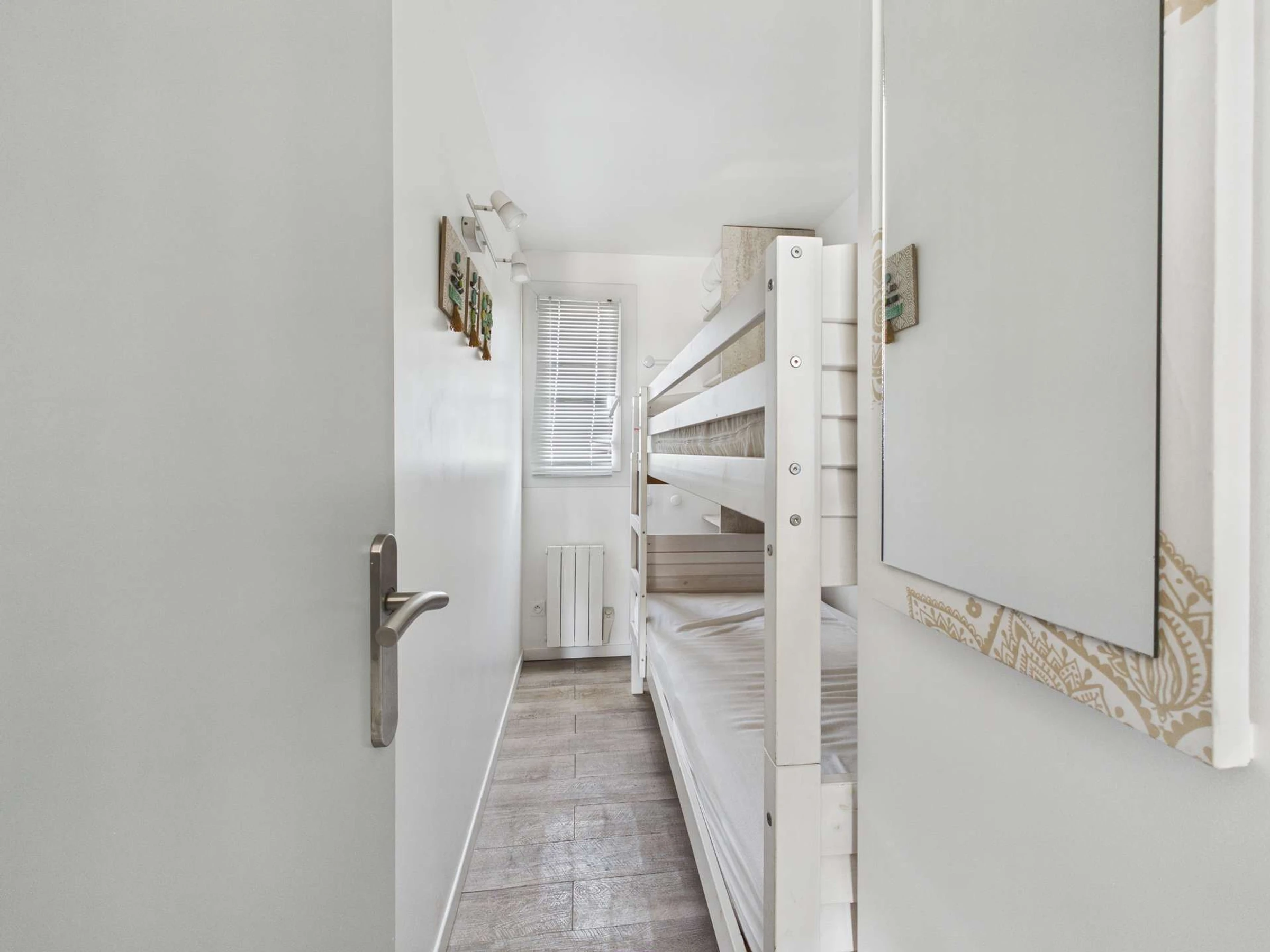 Schlafzimmer mit Doppelbett. Geschlossene Kabine (Fenster) mit Etagenbetten.