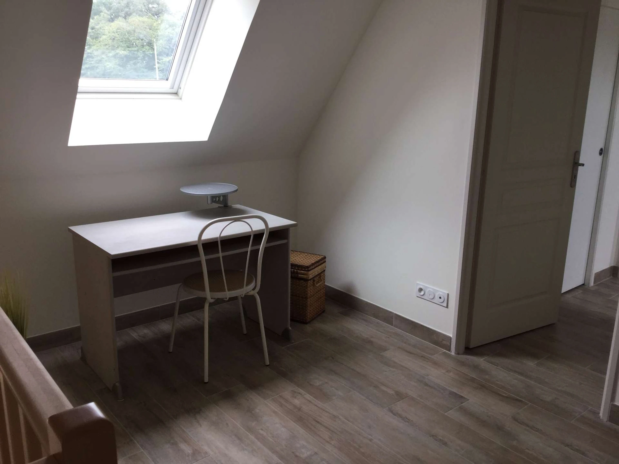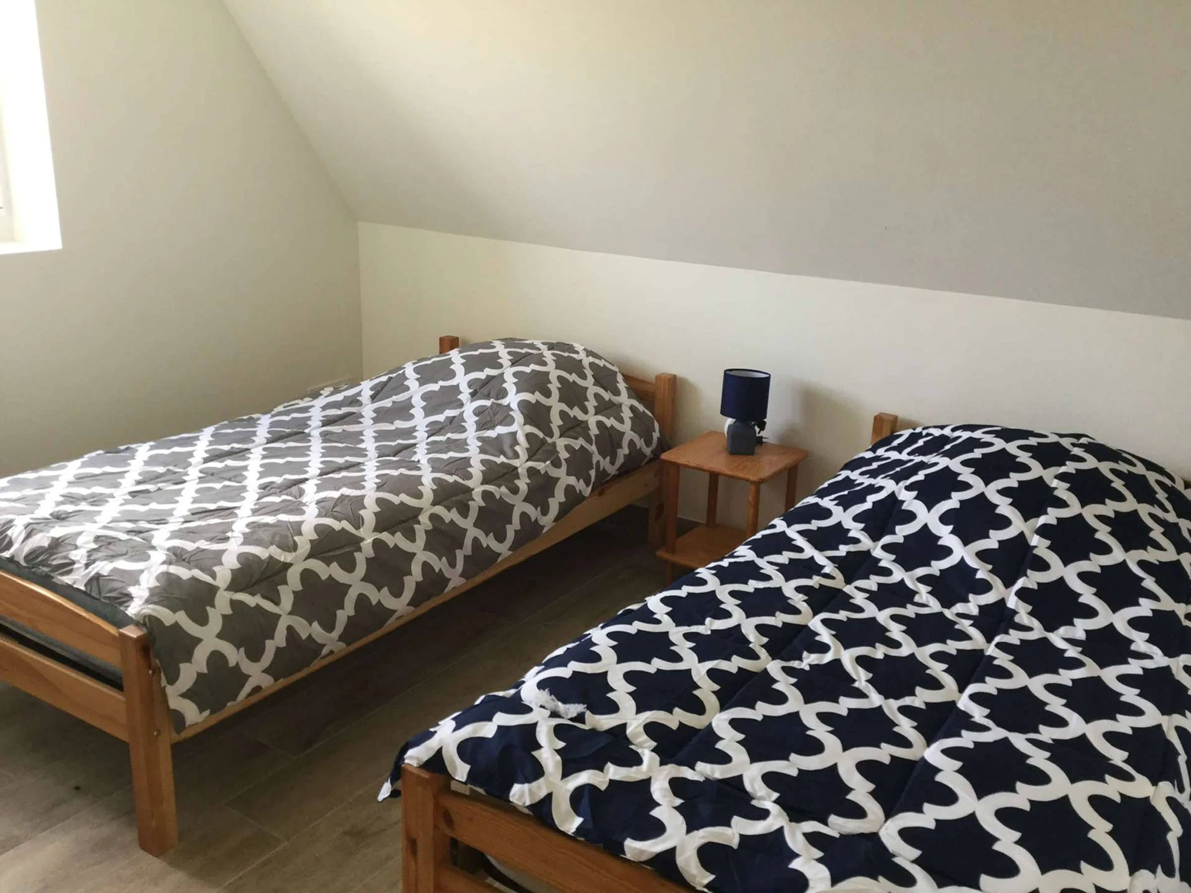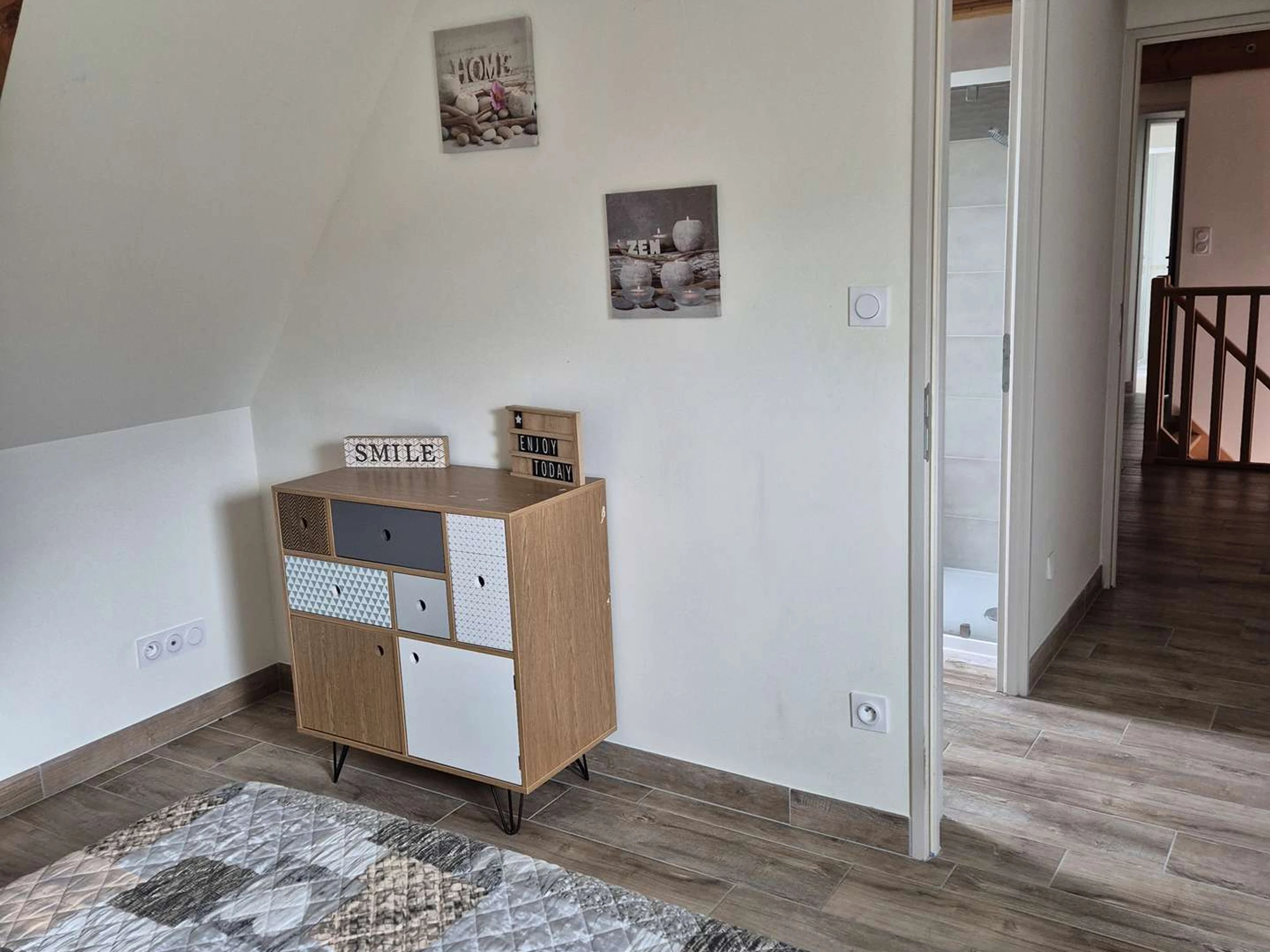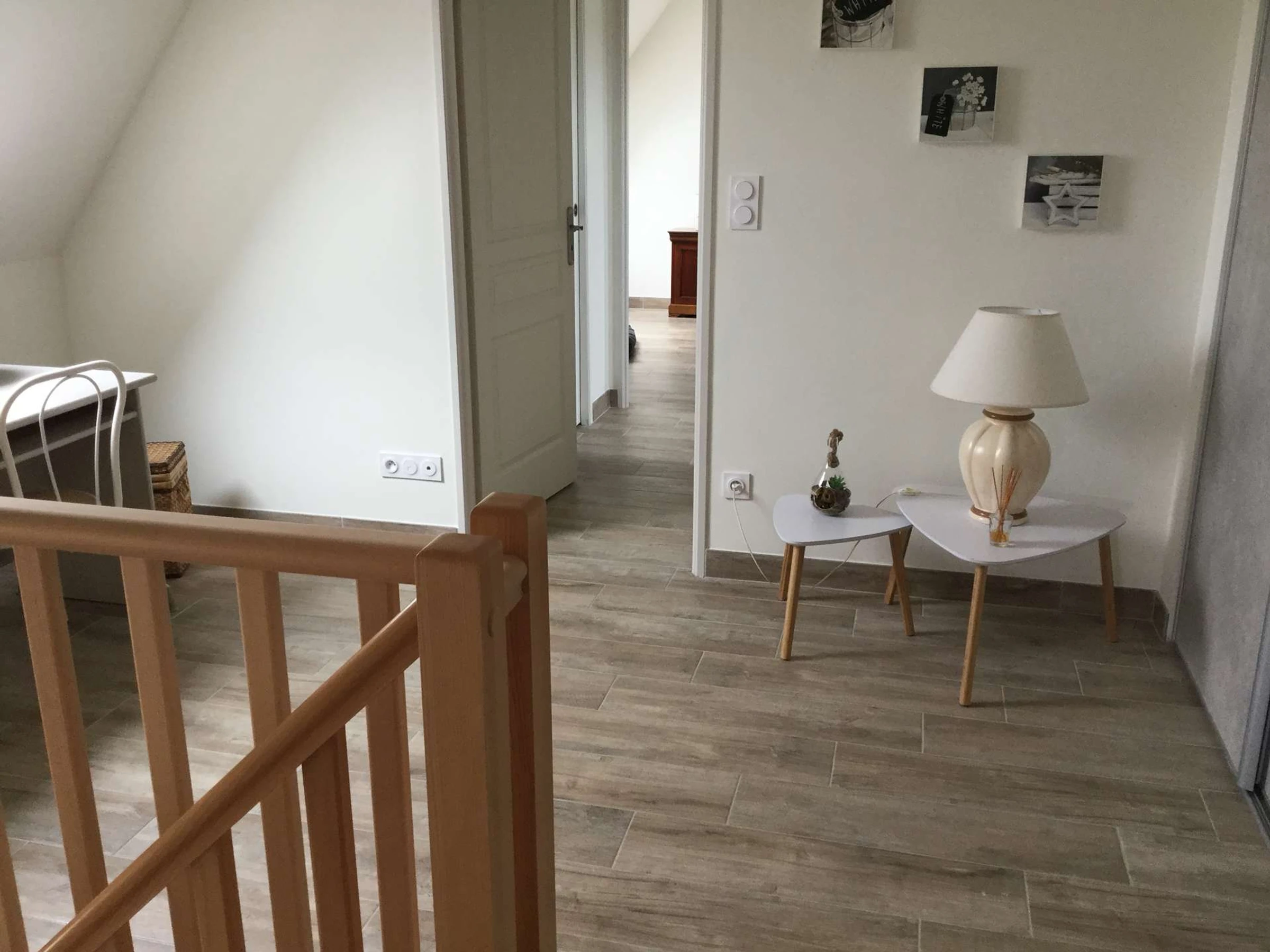 Im Obergeschoss, erreichbar über eine Treppe vom Esszimmer, befindet sich ein helles Zwischengeschoss mit einem Arbeitsbereich. Von hier aus gelangt man zu zwei weiteren Schlafzimmern – einem Doppelzimmer und einem Zweibettzimmer – jeweils mit eigenem Duschbad und WC.