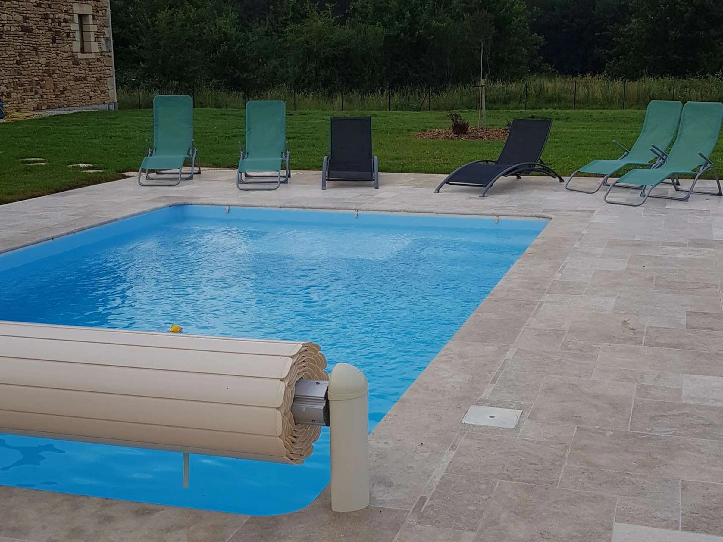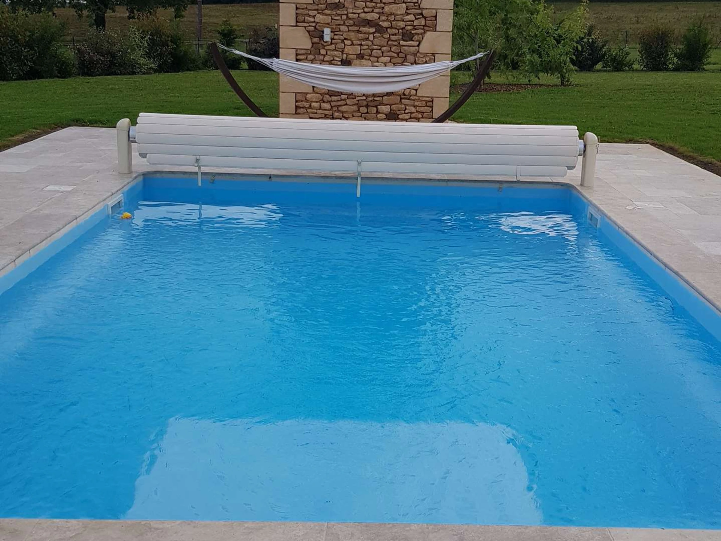 Die überdachte Terrasse mit Gasgrill ist ideal für Mahlzeiten im Freien. Das weitläufige, umzäunte Grundstück von einem Hektar bietet ein seltenes Gefühl von Freiheit. Ein privater, sicherer Swimmingpool, der von Mitte Mai bis September geöffnet ist, rundet das Angebot ab.