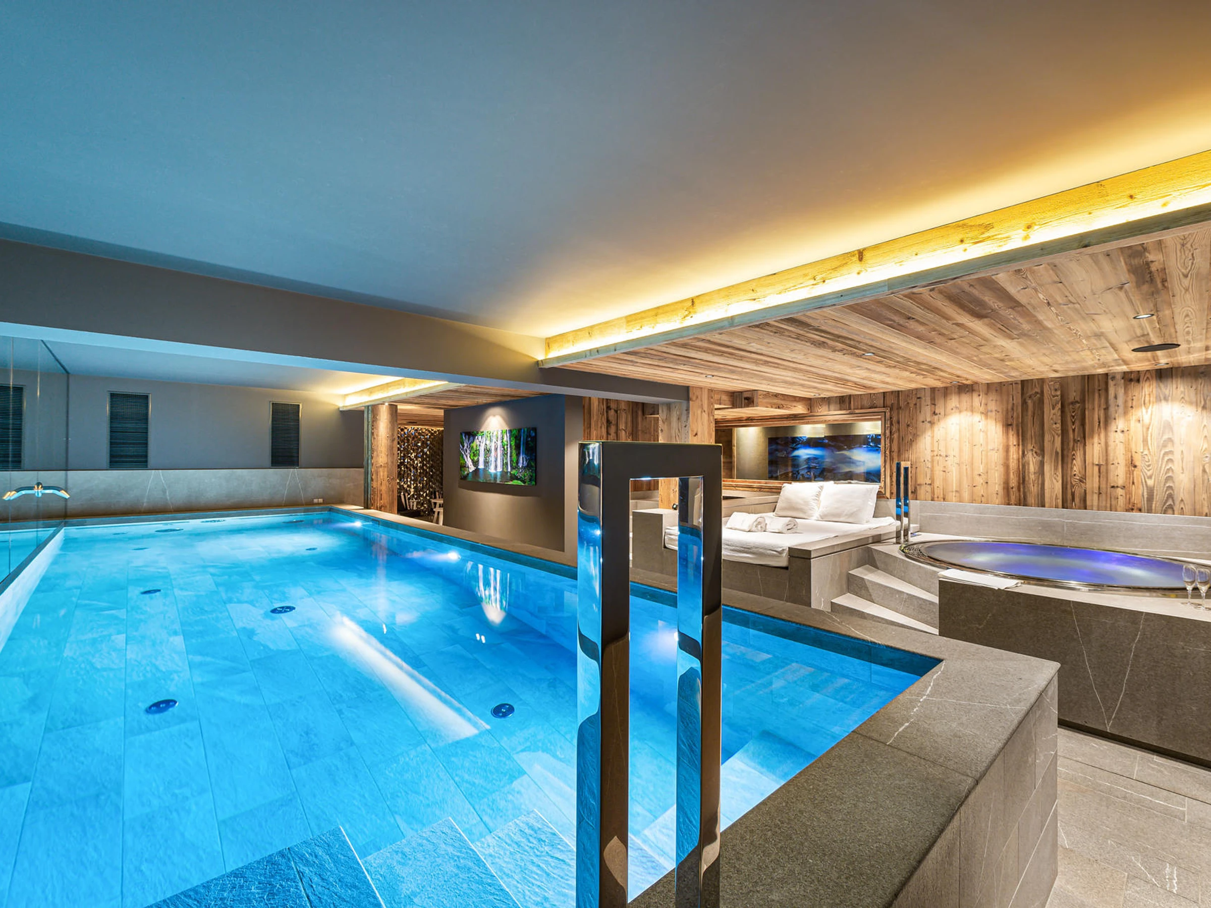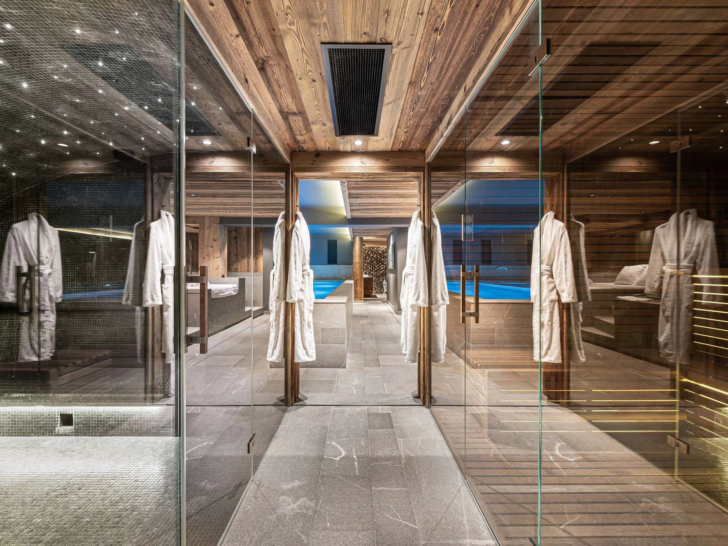 - Entspannungsbereich: Swimmingpool, Kaltwasserbecken Whirlpool, Sauna, Hamam, Massageraum, Dusche und WC