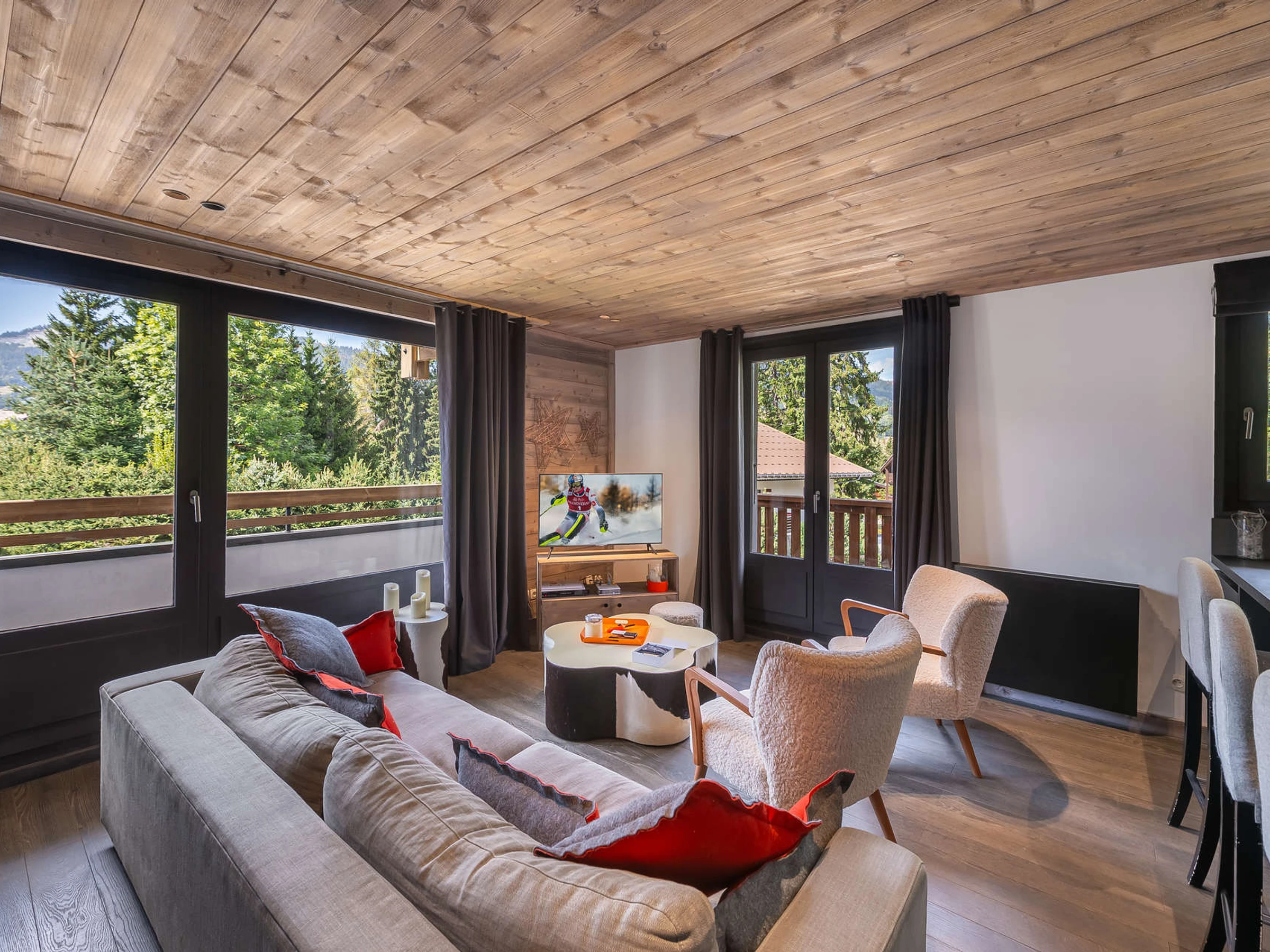 - Wohnzimmer mit TV-Lounge und Zugang zu Balkon und Terrasse mit Gartenmöbeln