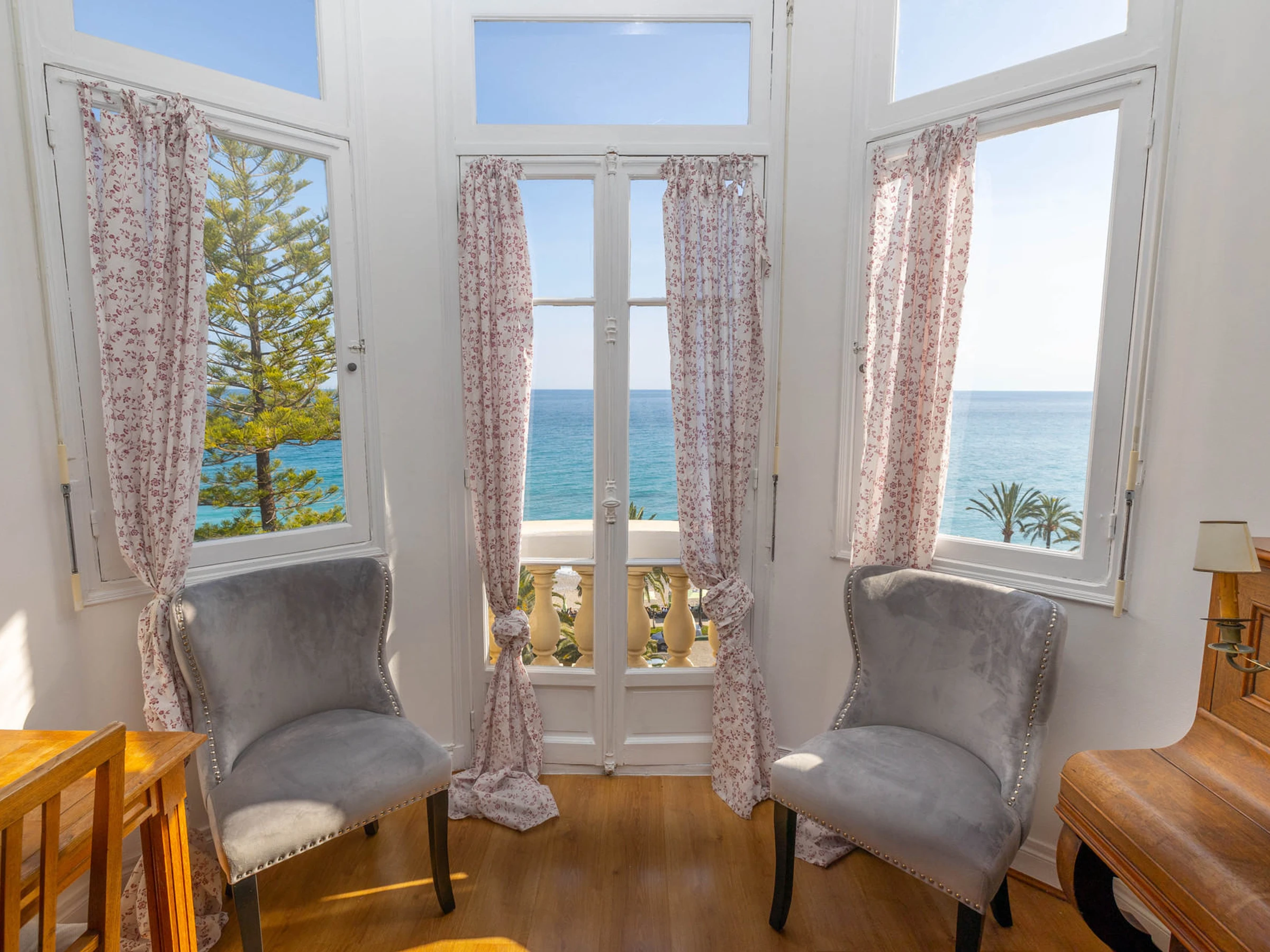 Schlafzimmer mit Bett und Zugang zum Balkon mit Meerblick.