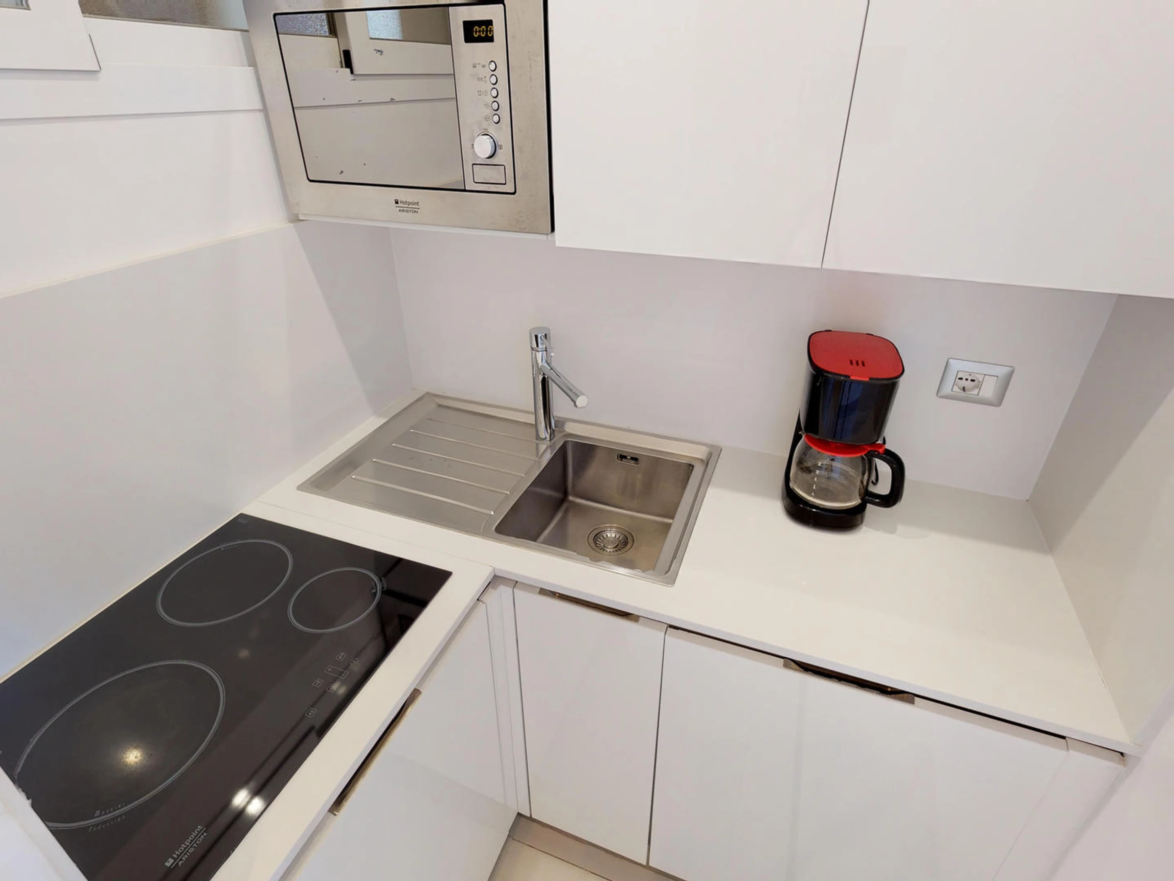 Separate Küchenecke mit Waschmaschine, Induktionskochfeldern und Mikrowelle.