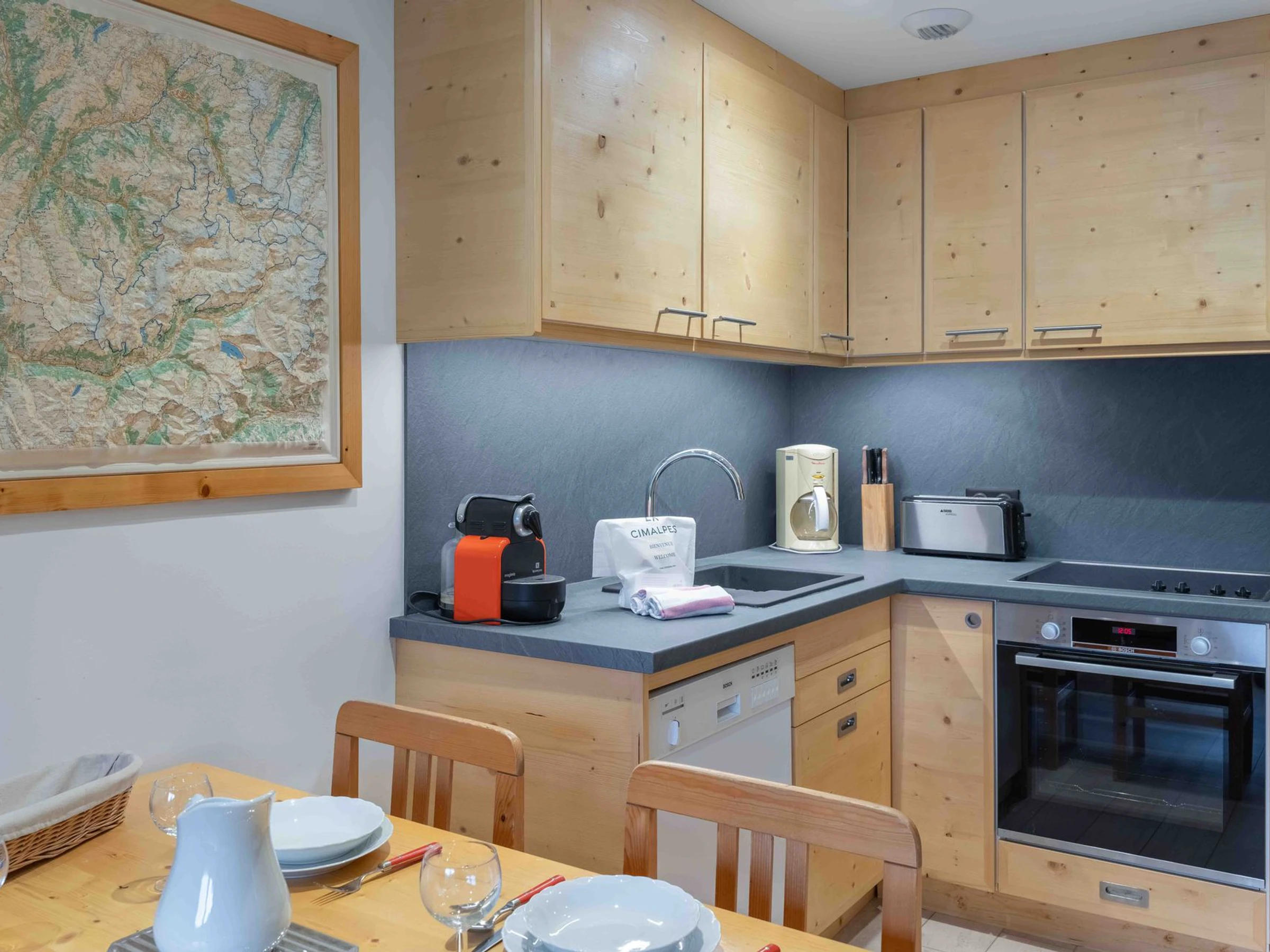 - Offene Küche: Kühlschrank, Backofen, Mikrowelle, Geschirrspüler, Cerankochfeld, Waschmaschine, Wasserkocher, Toaster, Nespresso-Maschine, Filterkaffeemaschine, Raclette-, Fondue- und Pierrade-Sets