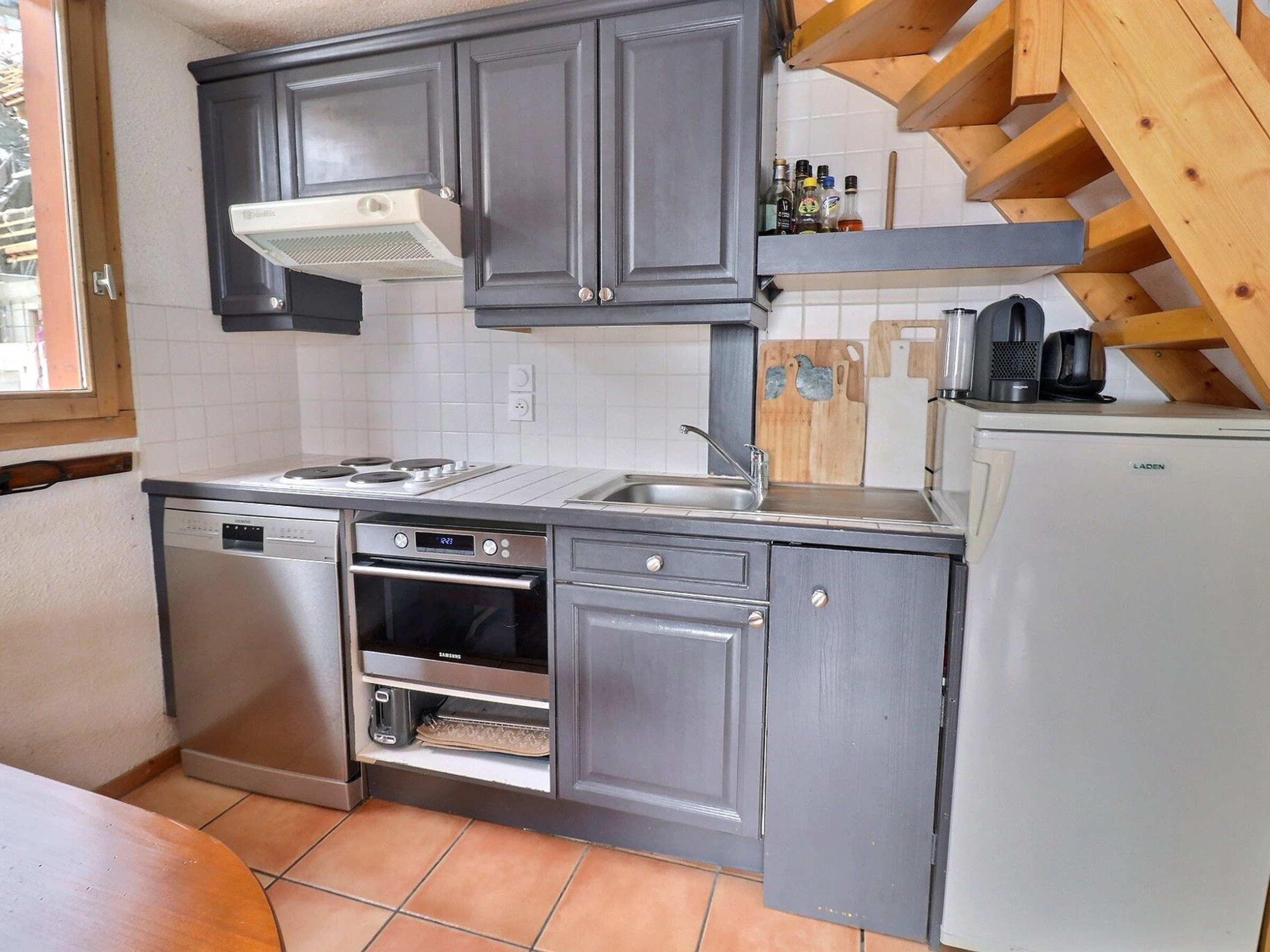 Küchenzeile: Kombi-Mikrowelle, Kühlschrank, Geschirrspüler, 4 Kochplatten, NESPRESSO-Kaffeemaschine, Toaster, Wasserkocher