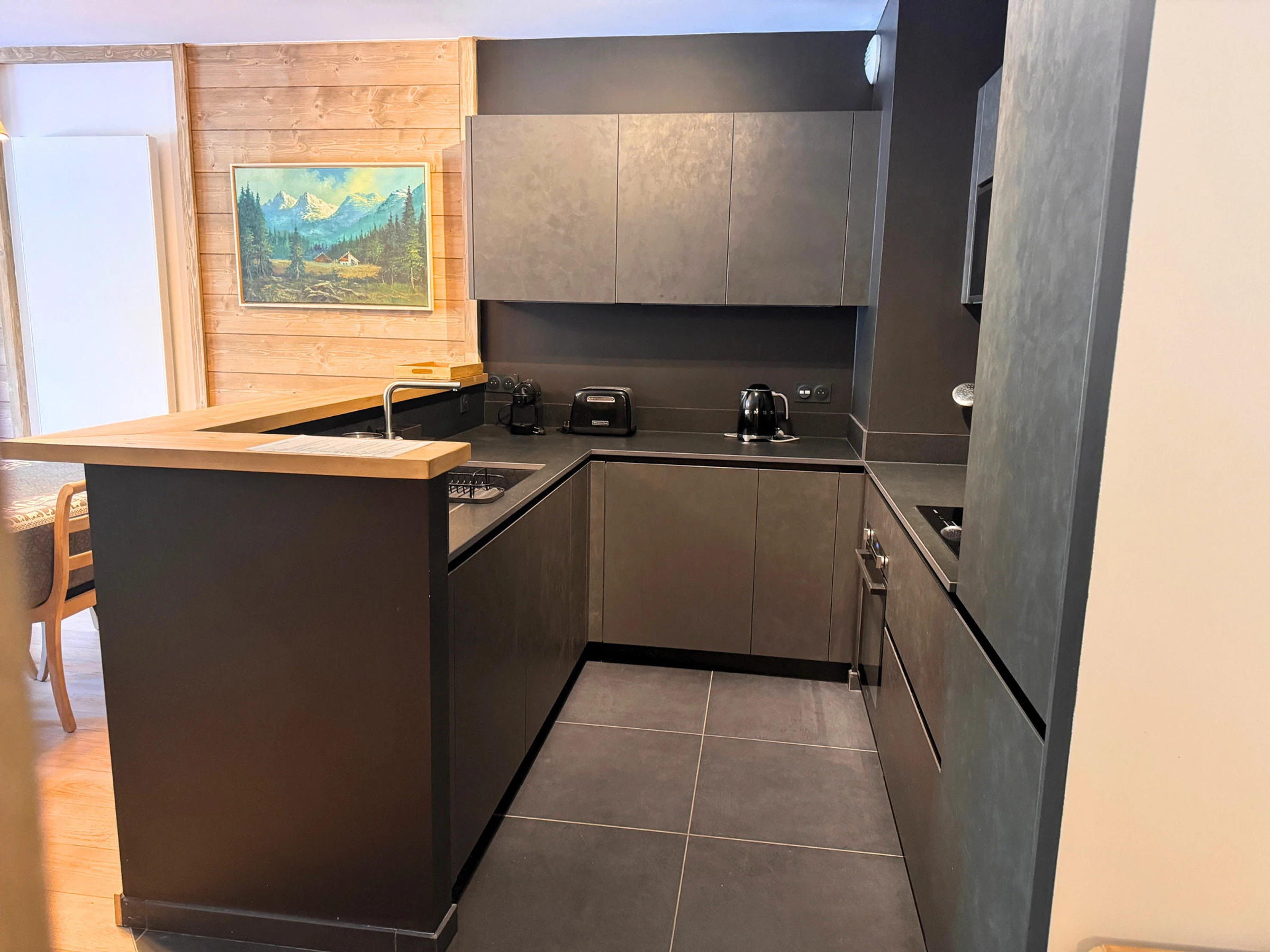 Eine voll ausgestattete Küche mit Induktionskochfeldern, Backofen, Mikrowelle, Geschirrspüler, Waschmaschine, Kühlschrank und Gefrierschrank.