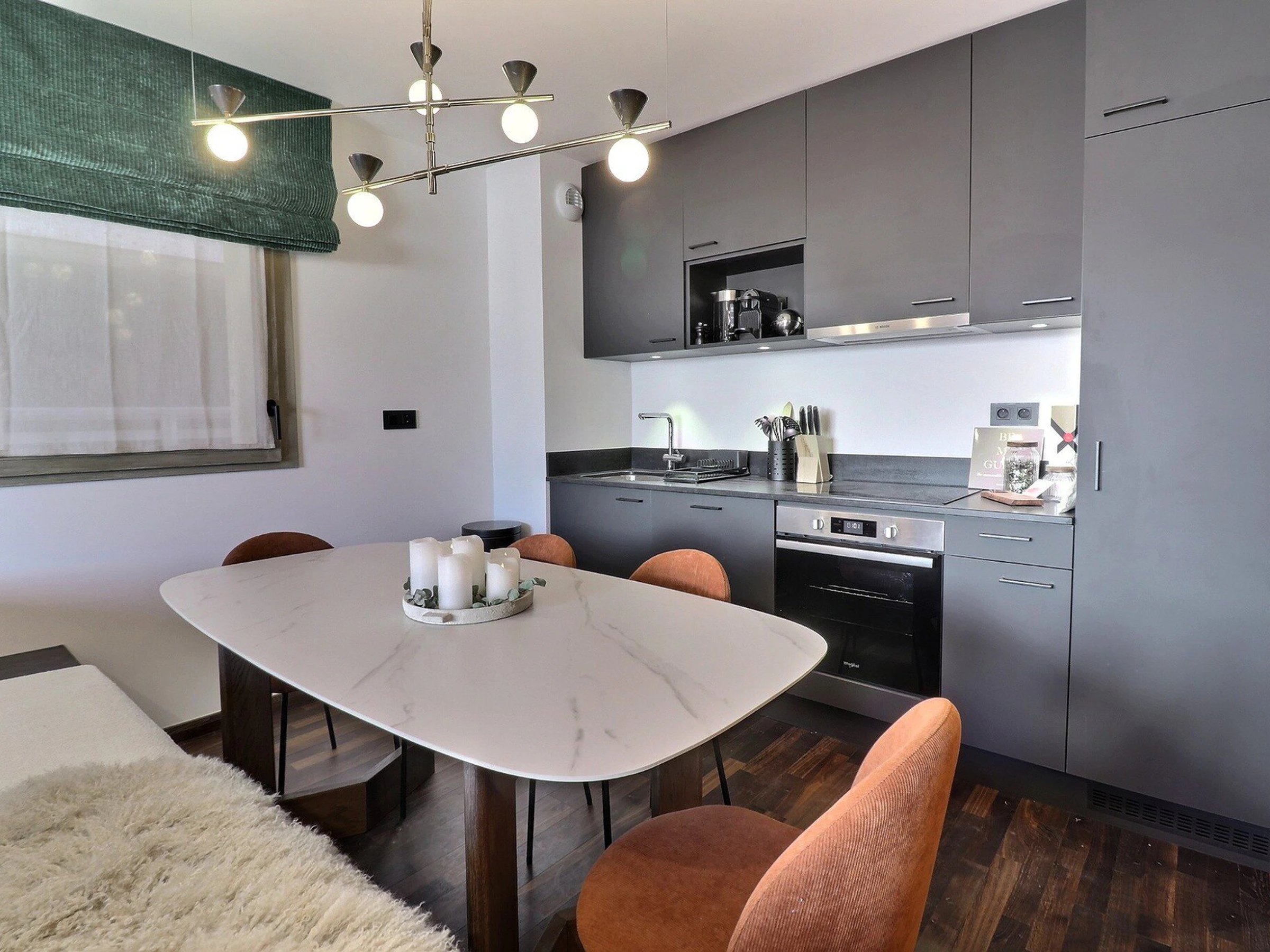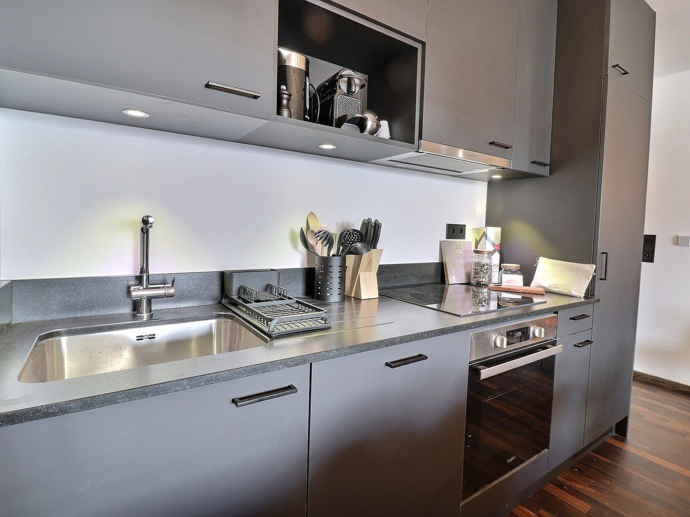 Offene Küche: Backofen, Geschirrspüler, Kühlschrank, 4-Kochfelder (Induktion), Dunstabzugshaube, Filterkaffeemaschine, Toaster, Wasserkocher
