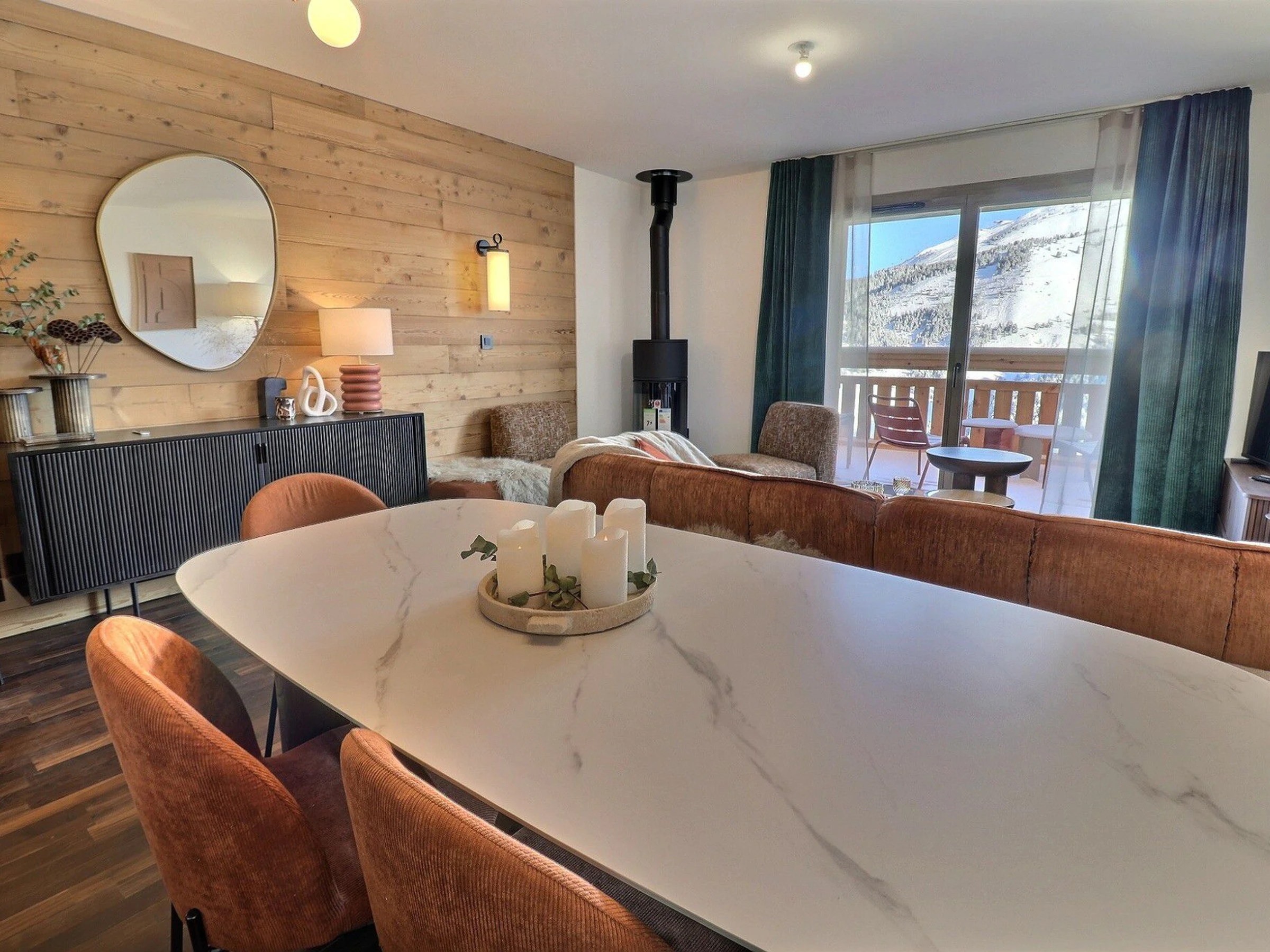 Wohnbereich: 1 Sofa und Essbereich, 1 Kaminofen (Holz nicht inklusive)