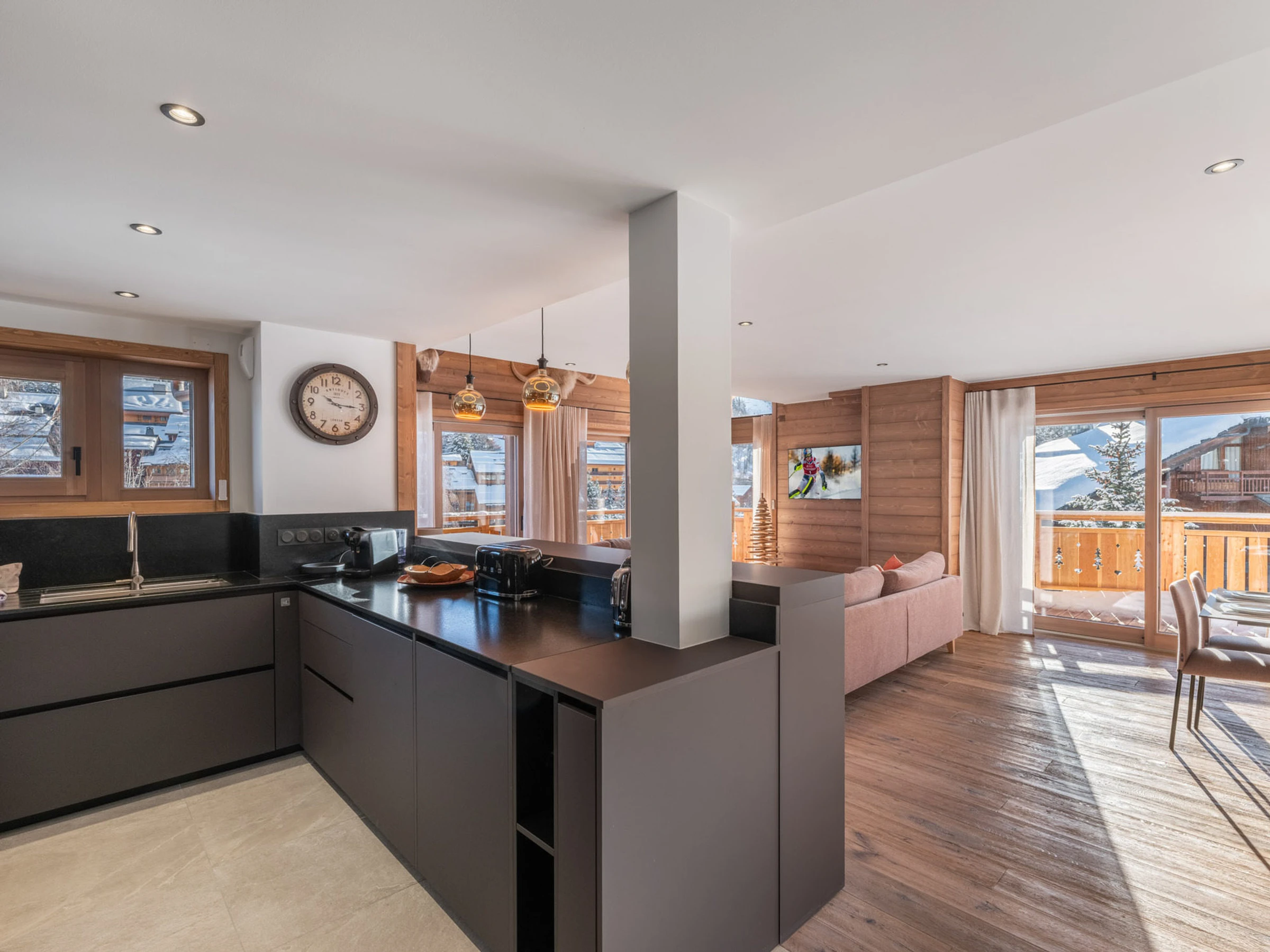 - Küche mit Zugang zum Wohn- und Essbereich mit TV und Balkon mit Gartenmöbeln.