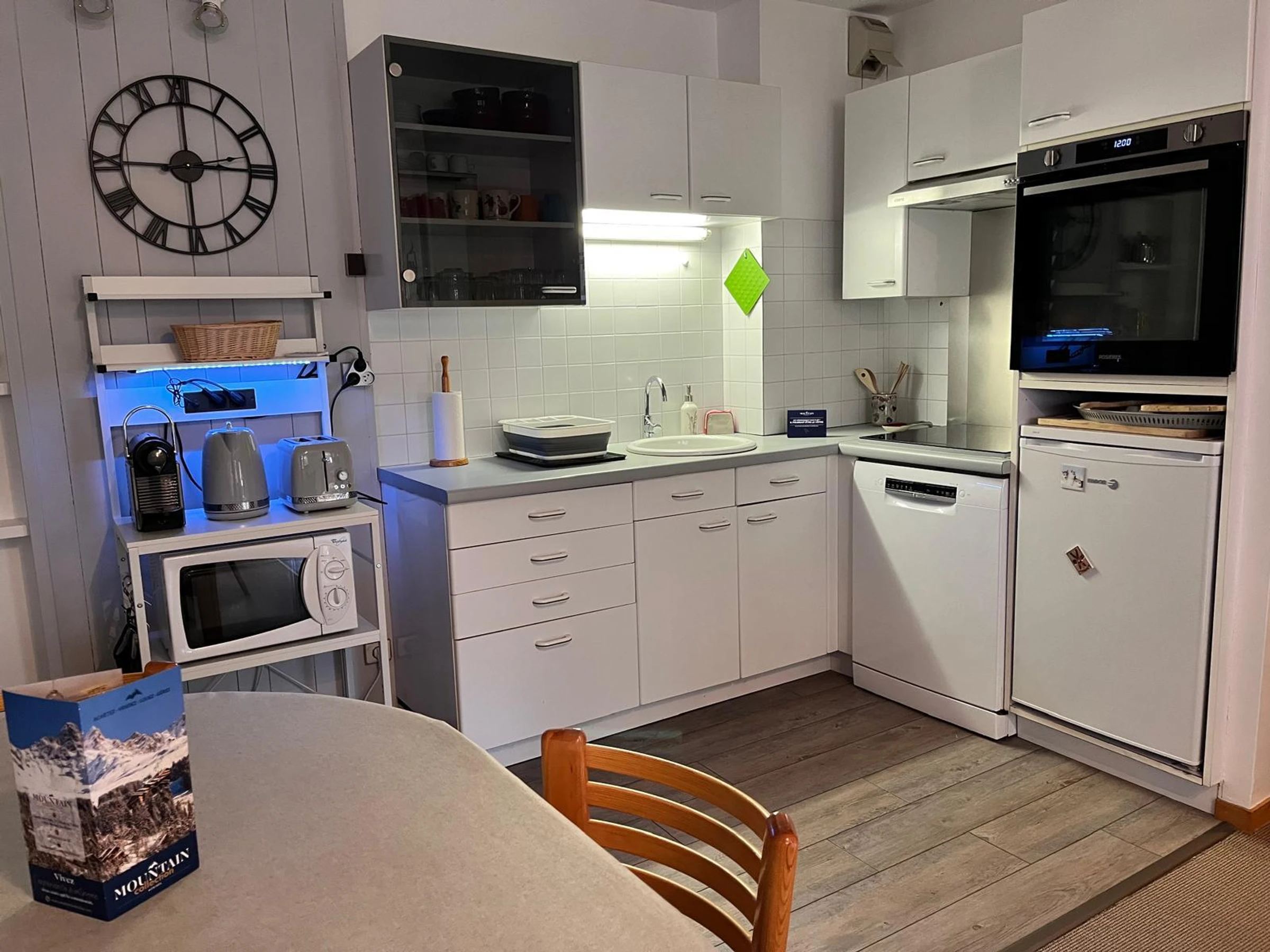 Offene Küche ausgestattet mit 4 Elektroherdplatten, Wasserkocher, Toaster, Nespresso-Maschine, Geschirrspüler, Ofen und Mikrowelle