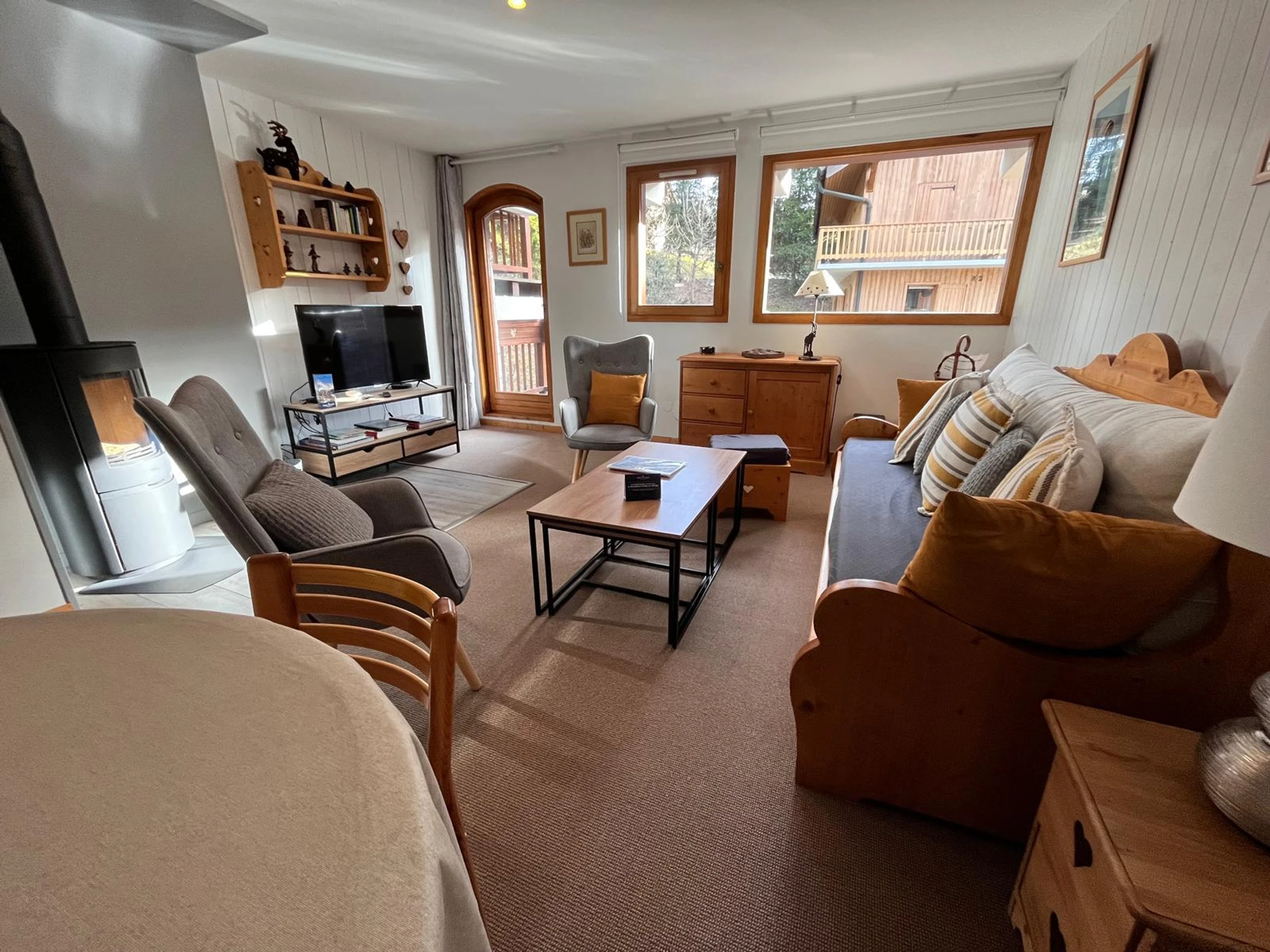 Wohnzimmer mit Flachbild-TV und direktem Zugang zum Balko, sowie seinen wunderschönen, nagelneuen Holzofen, um nach einem herrlichen Skitag eine gemütliche Ecke zu genießen