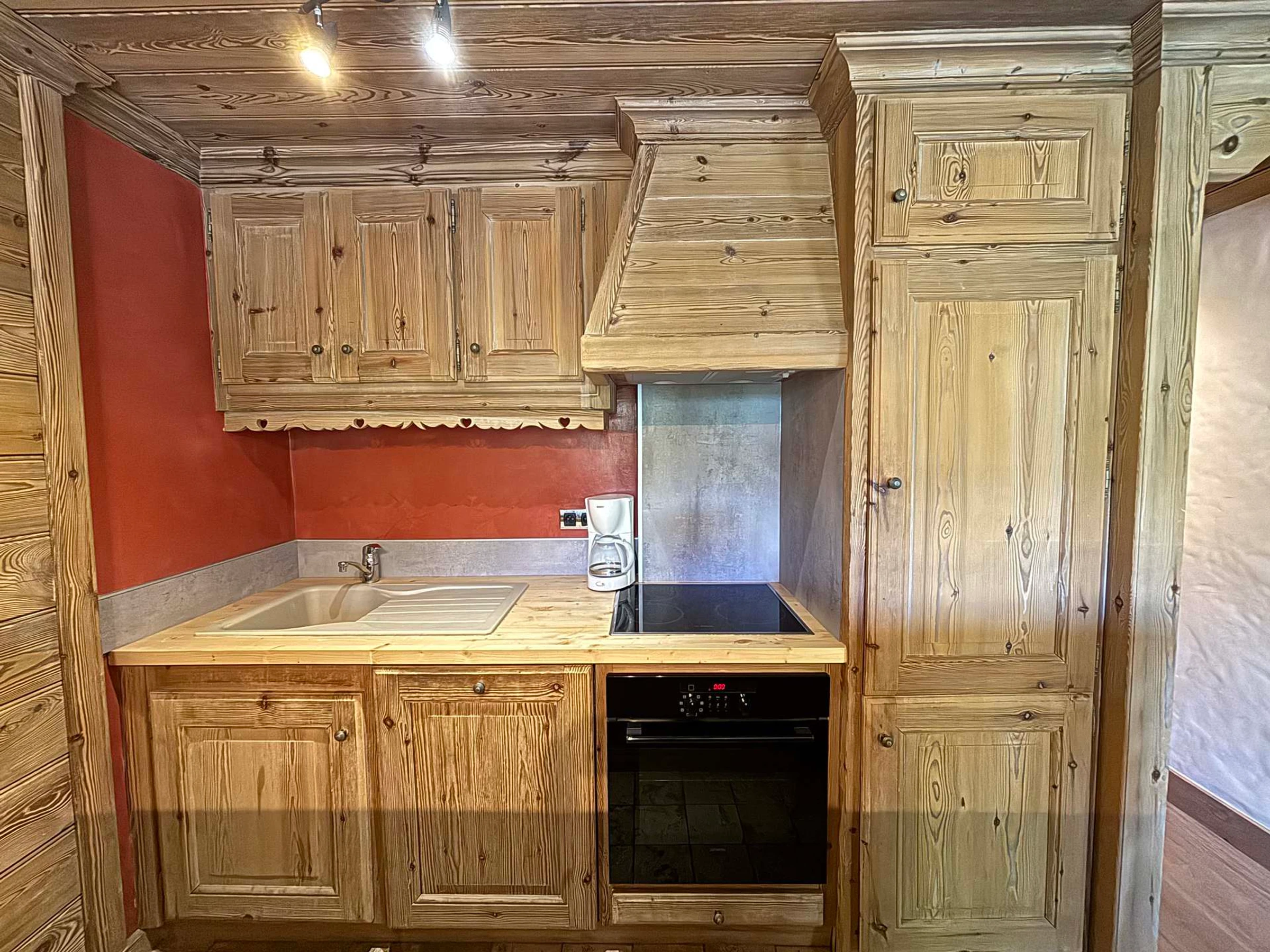 Ausgestattet mit Herdplatte, Backofen und Kühlschrank.
