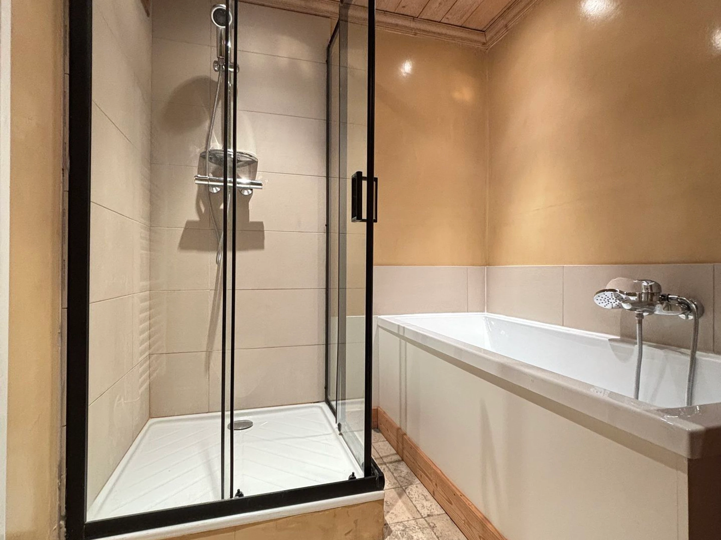 Badezimmer mit Badewanne, Dusche und WC. Ein Duschbad mit WC grenzt an Schlafzimmer 1 an.