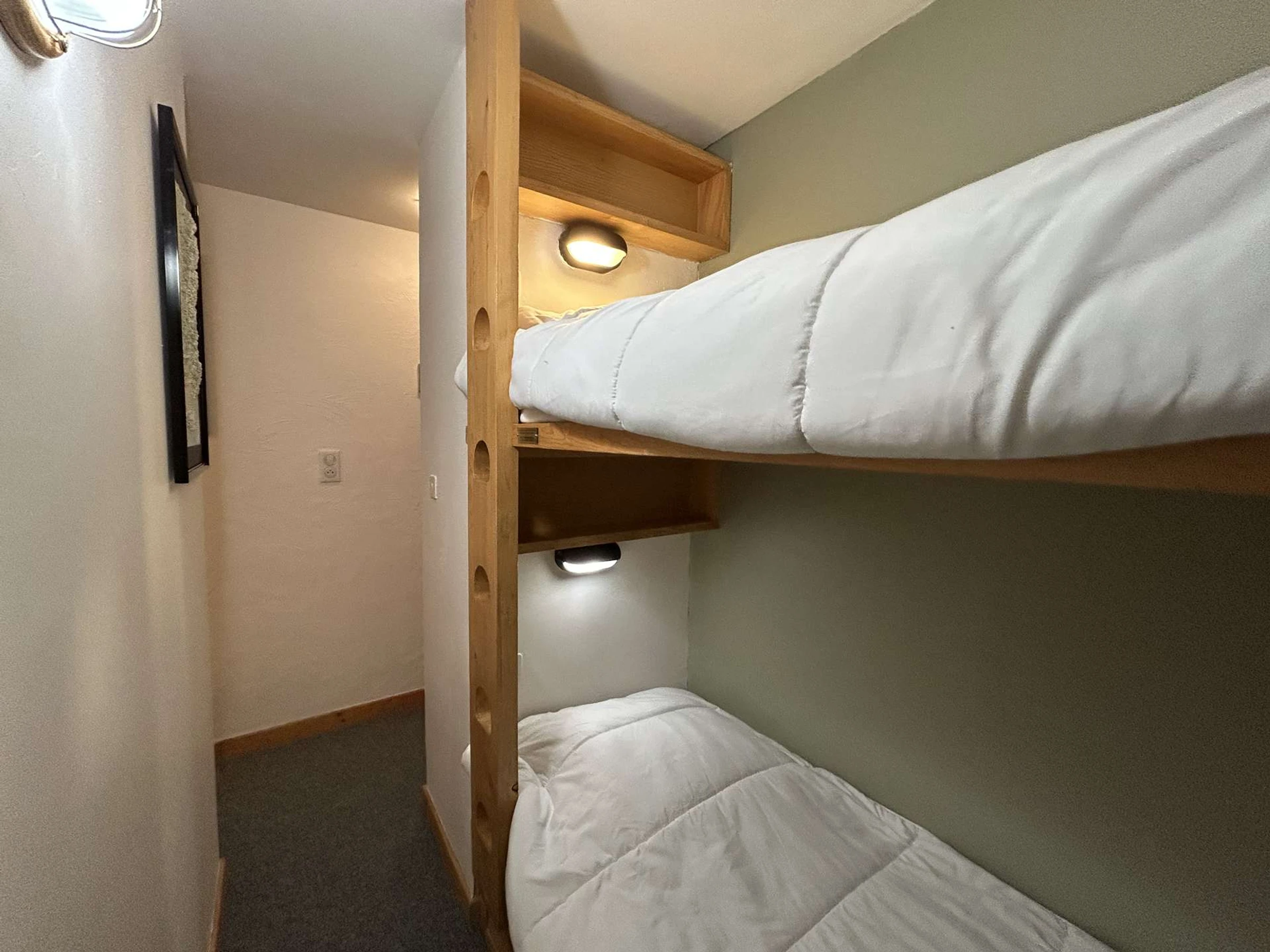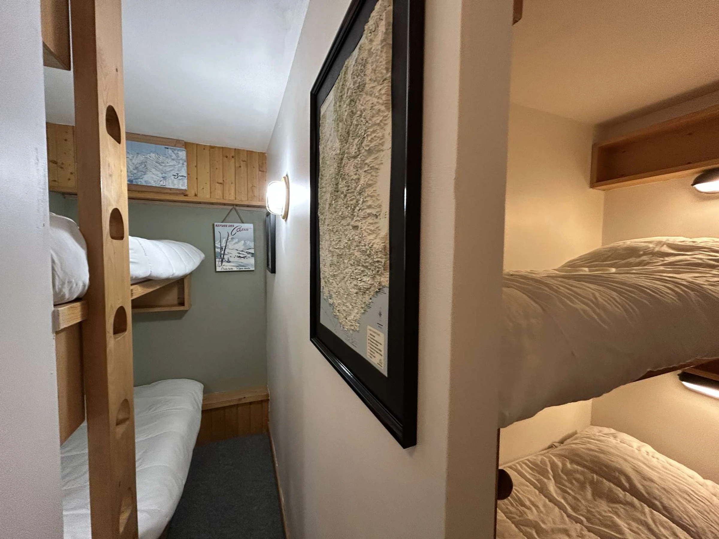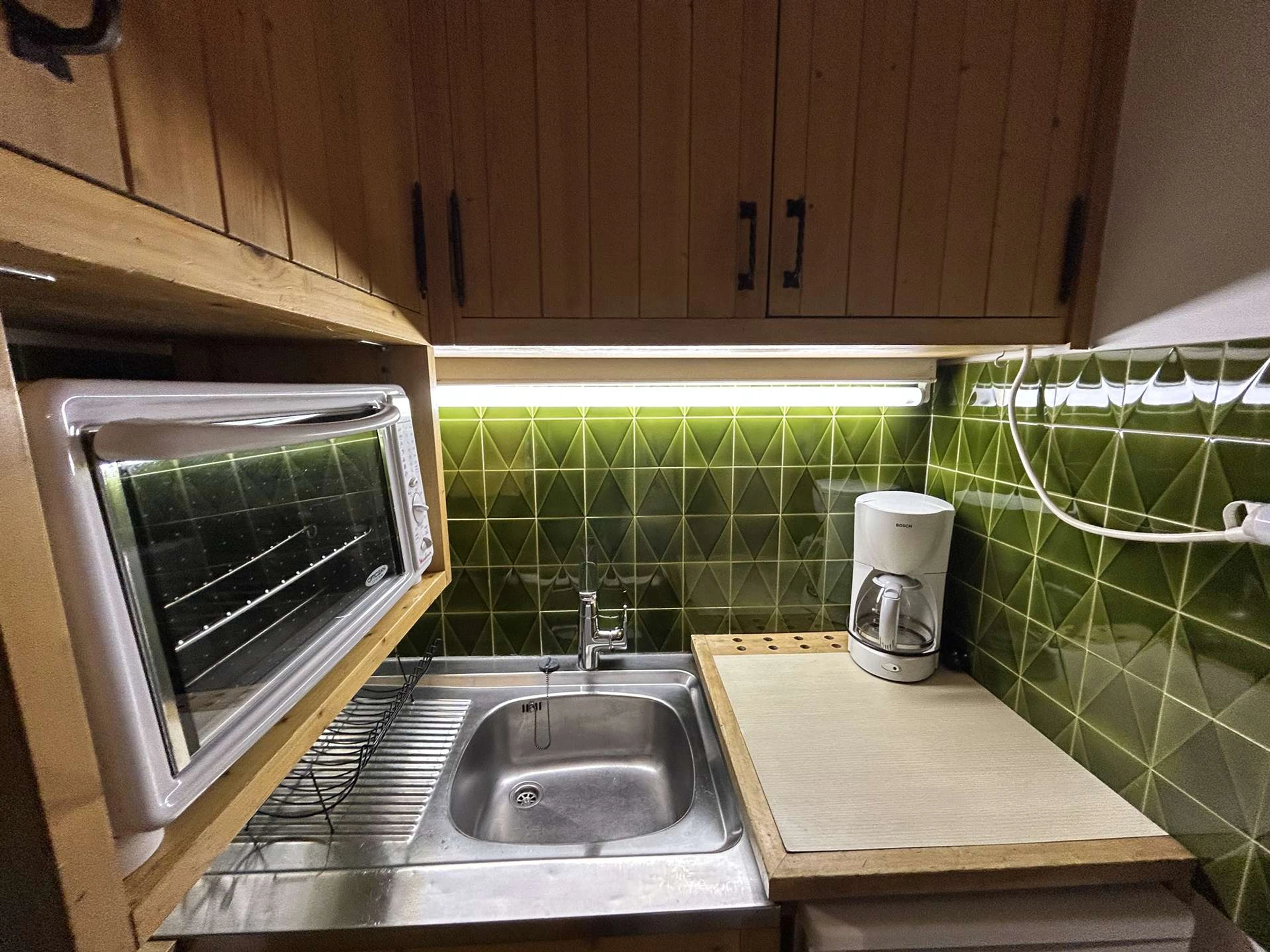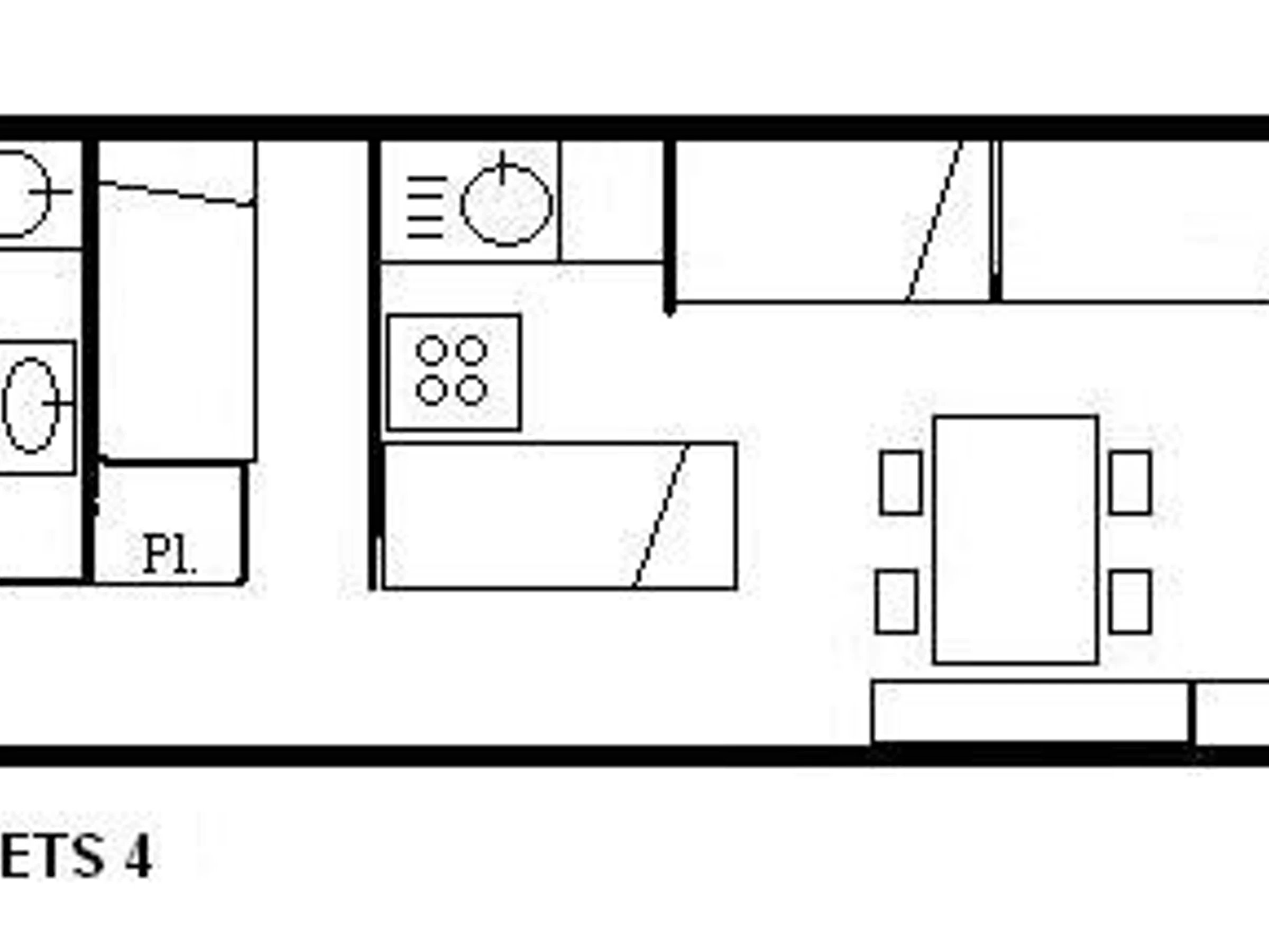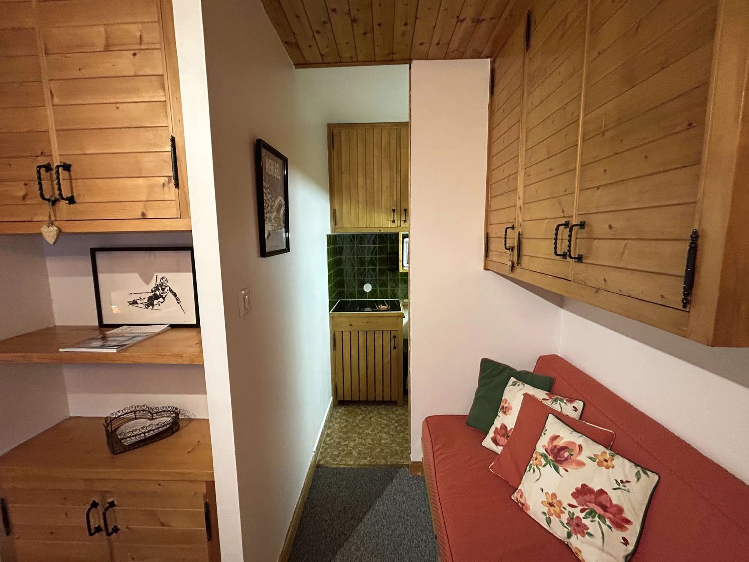 Dieses Bergstudio im Erdgeschoss verfügt über ein Wohnzimmer mit zwei Einzelbetten (80 x 180) und einem Fernseher, eine kleine, zum Wohnzimmer offene Küche, eine Nische mit einem niedrigen Einzelbett (80 x 180) und einem niedrigen Einzelbett (80 x 180) im Flur, ein Badezimmer und ein separates WC.