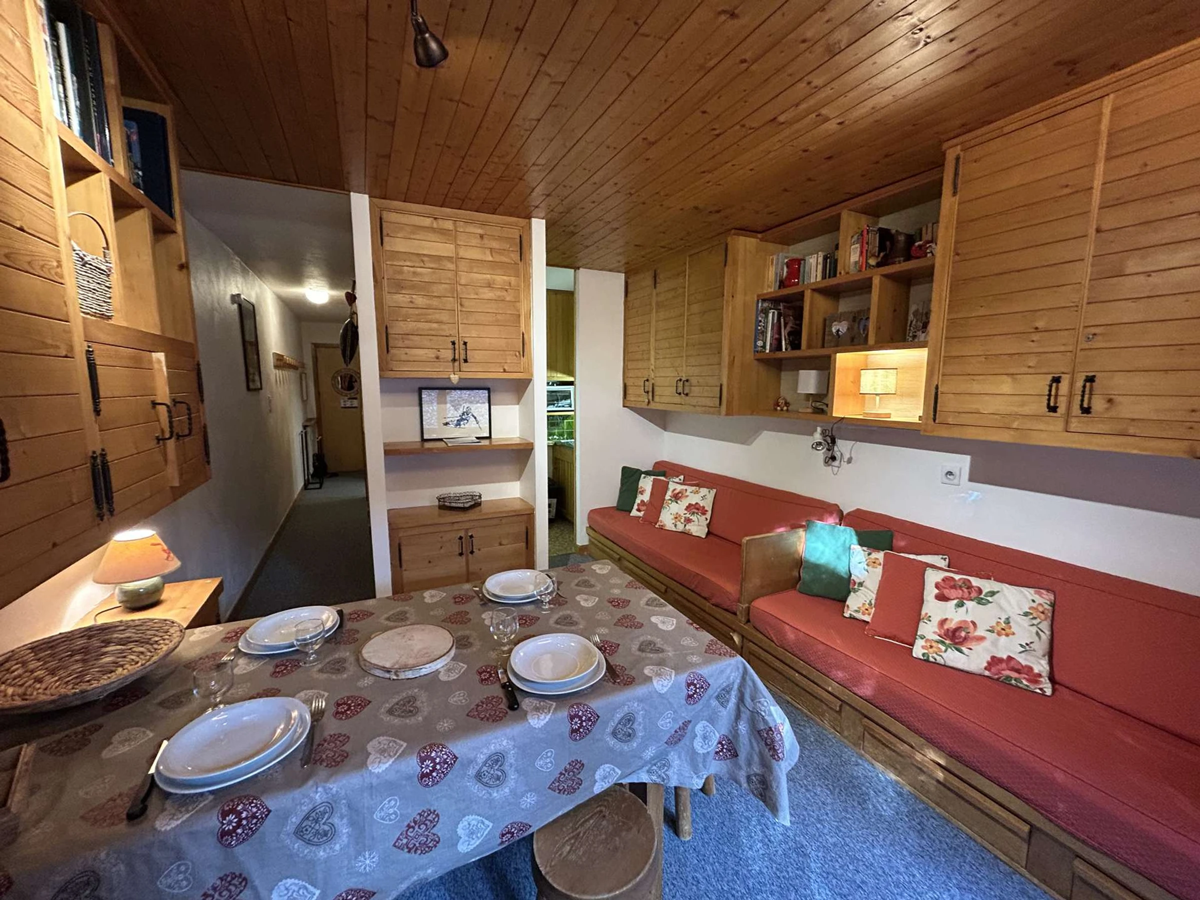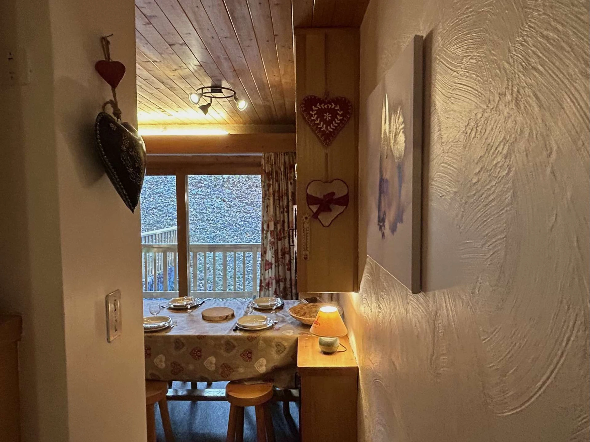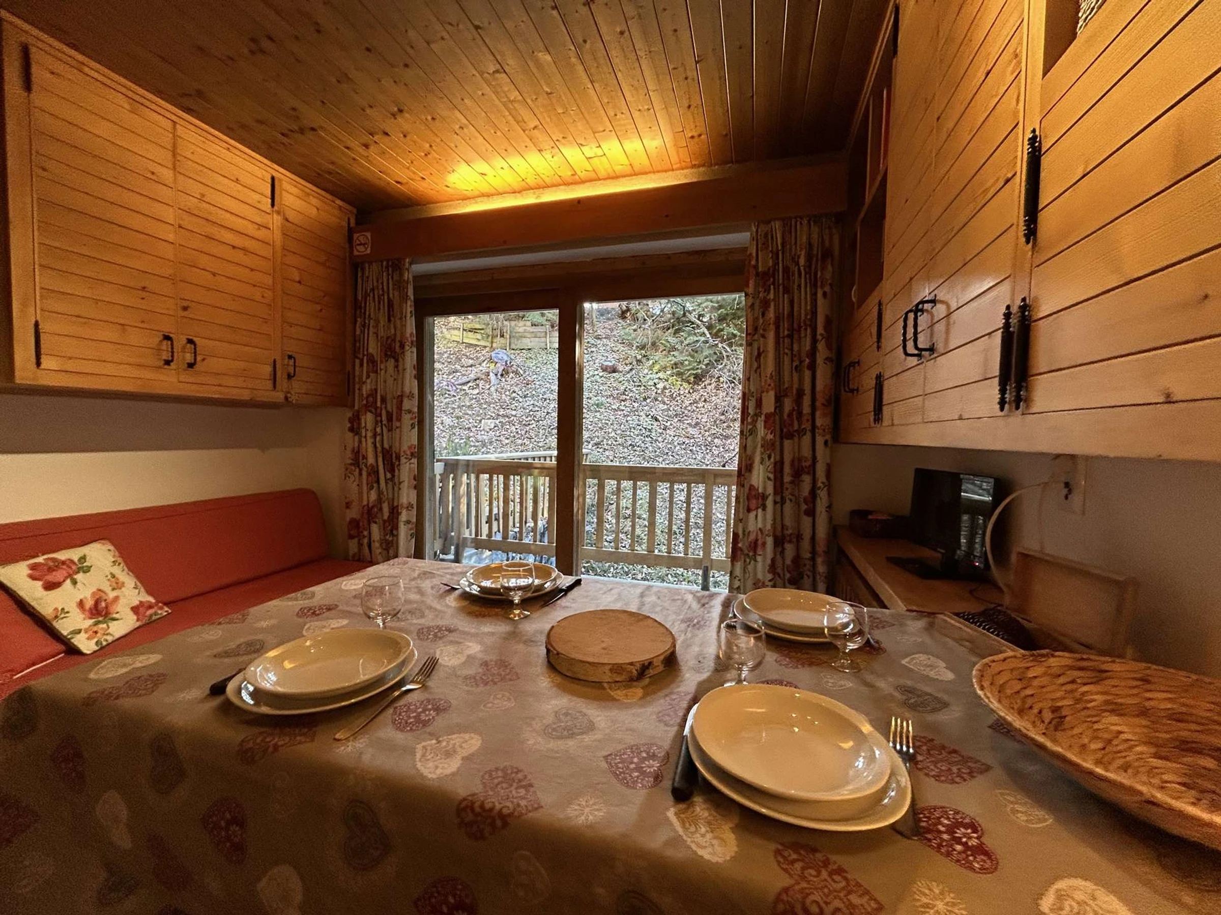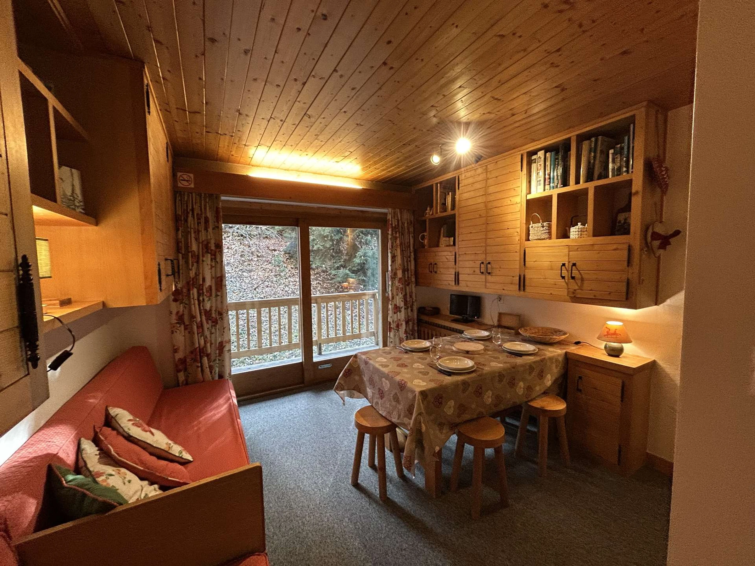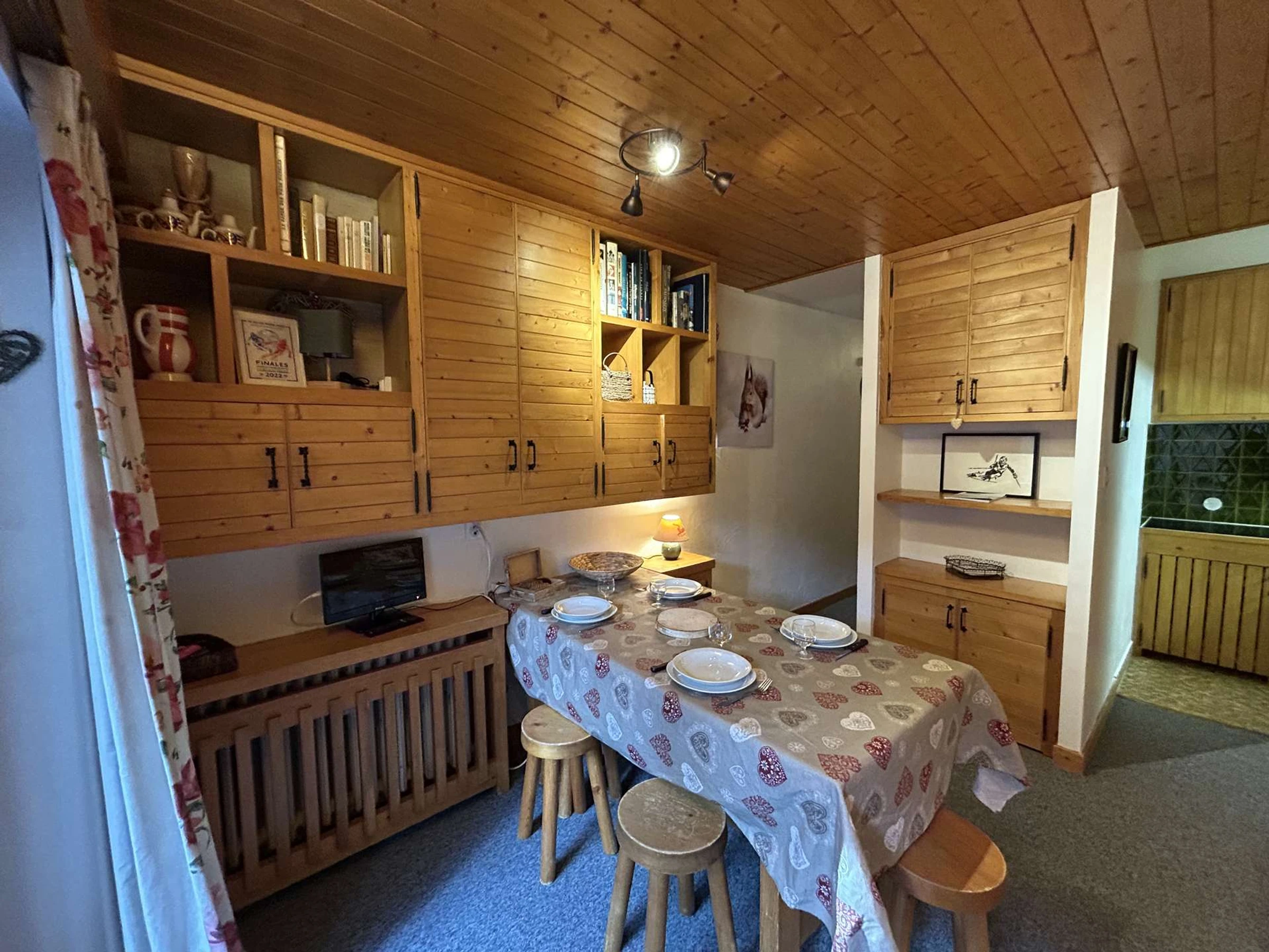 Dieses Bergstudio im Erdgeschoss verfügt über ein Wohnzimmer mit zwei Einzelbetten (80 x 180) und einem Fernseher, eine kleine, zum Wohnzimmer offene Küche, eine Nische mit einem niedrigen Einzelbett (80 x 180) und einem niedrigen Einzelbett (80 x 180) im Flur, ein Badezimmer und ein separates WC.