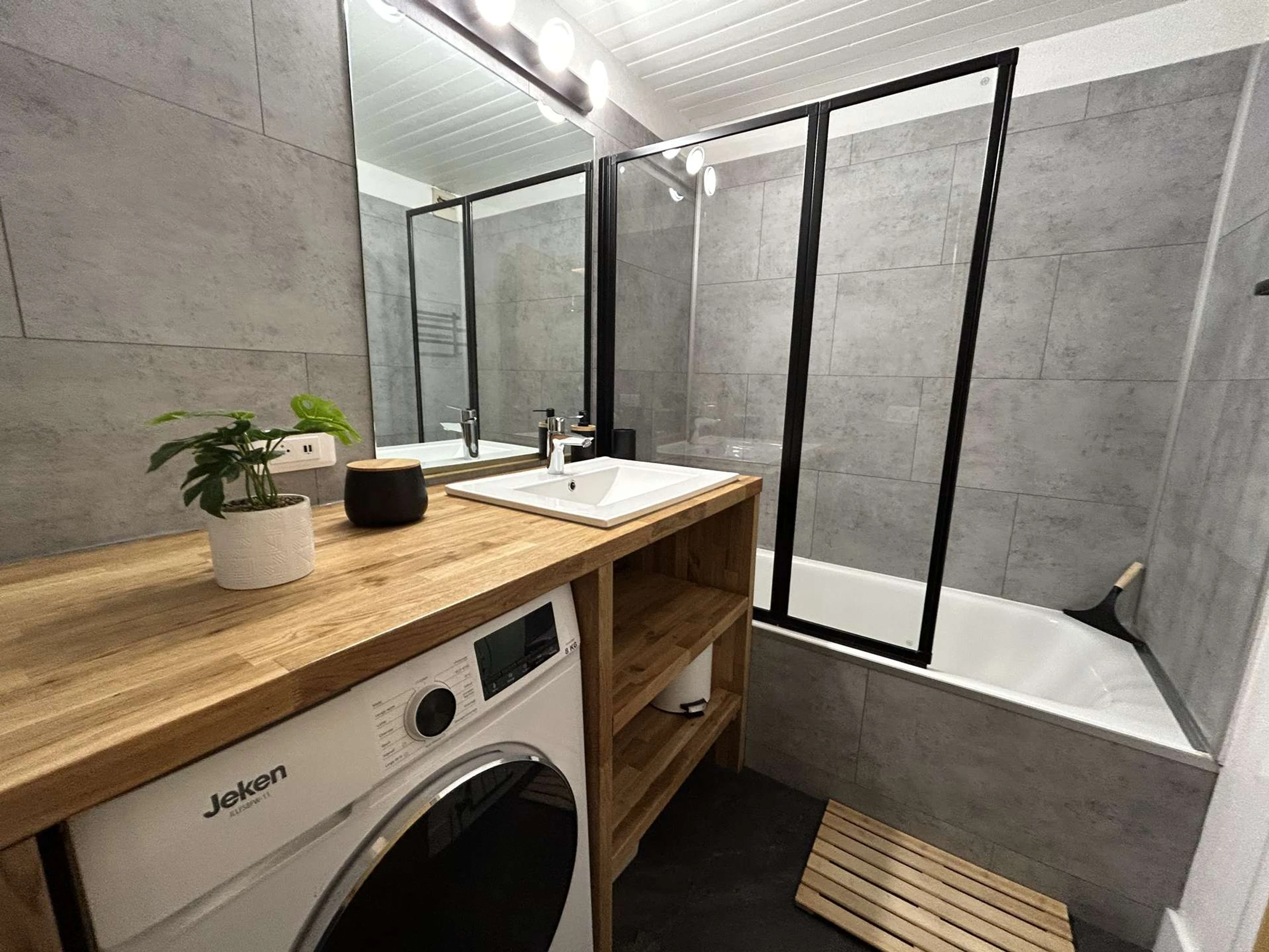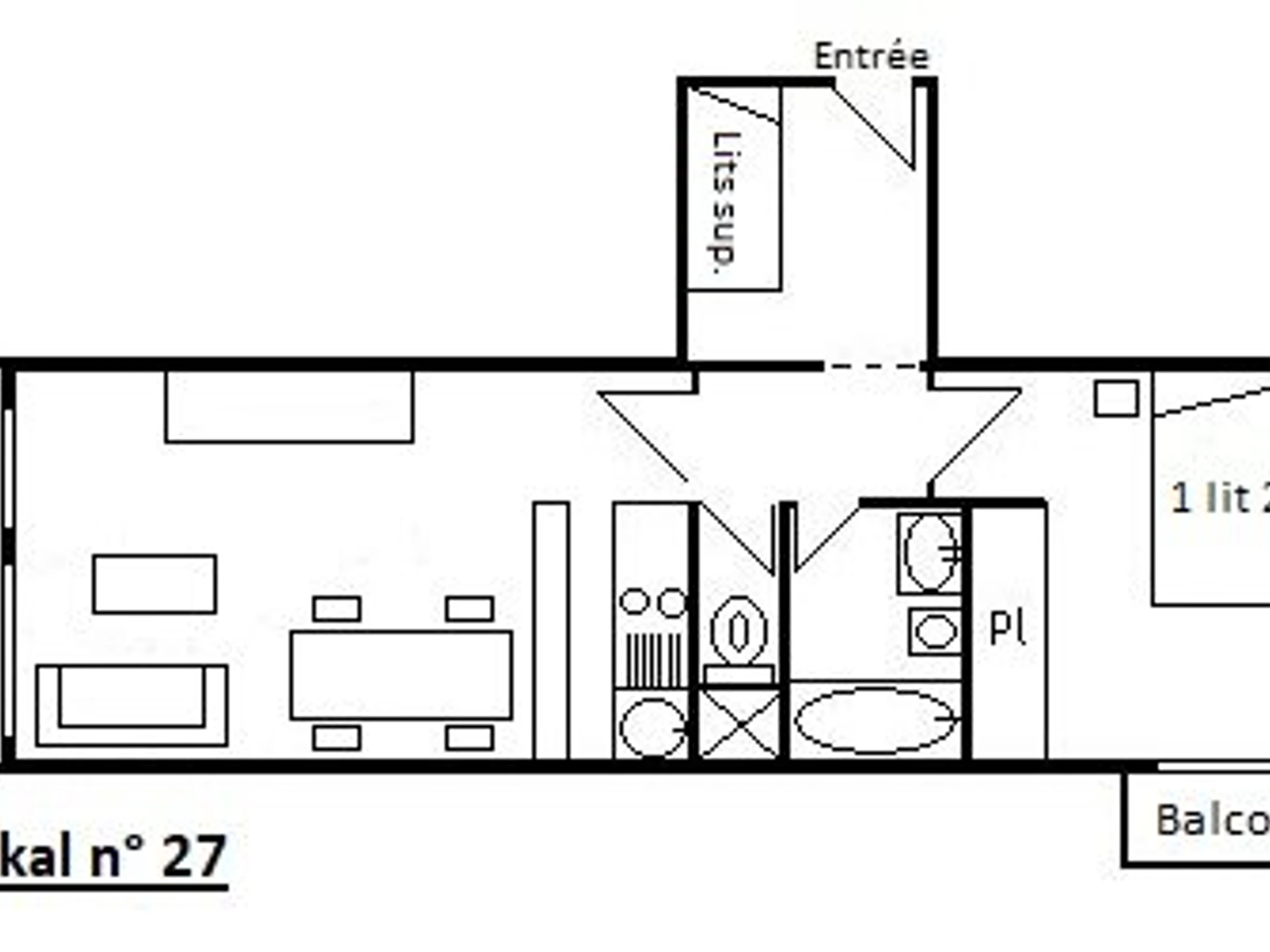 Dieses Apartment im 2. Stock verfügt über eine voll ausgestattete Küche mit Geschirrspüler, die zum Wohnzimmer mit Schlafcouch (140 x 190 cm), Fernseher und Südbalkon hin offen ist. Außerdem gibt es eine Schlafnische im Eingangsbereich mit einem Etagenbett (80 x 190 cm), ein Schlafzimmer mit Doppelbett (140 x 190 cm), ein separates Badezimmer mit Waschmaschine und ein separates WC.