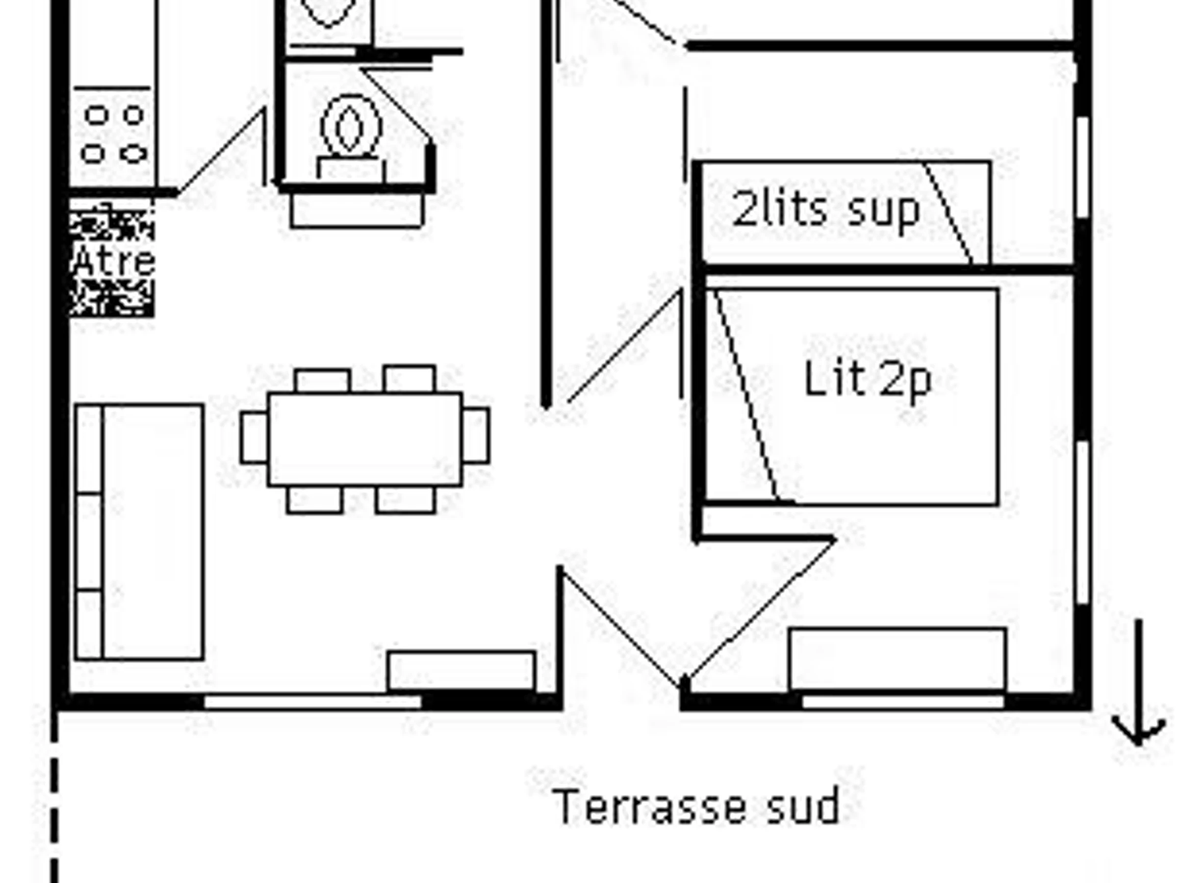 Dieses Bergapartment im Hochparterre mit Aufzug verfügt über eine Küche, ein Wohnzimmer mit Essbereich, Kamin und Fernseher sowie eine große Südterrasse. Es bietet außerdem ein Schlafzimmer mit einem Doppelbett (140 x 190) in Süd-Ost-Ausrichtung, ein Schlafzimmer mit einem Etagenbett (80 x 190) und ein Schlafzimmer mit einem Etagenbett (80 x 190) in Ost-Ausrichtung mit Waschbecken, ein Badezimmer und ein separates WC.
