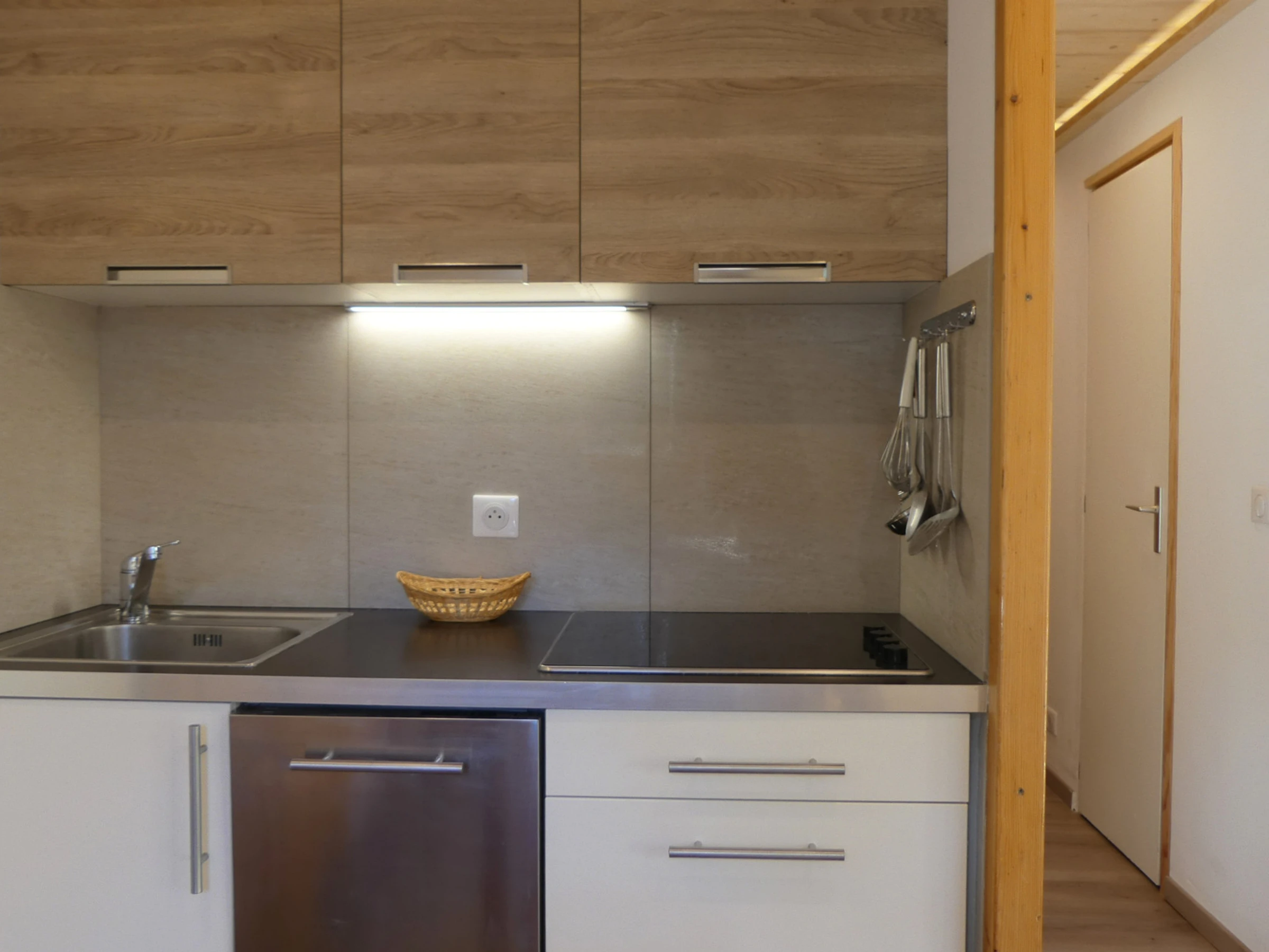 Küchenzeile: Backofen mit Mikrowelle und Grillfunktion, Kühlschrank, Geschirrspüler, 4 Cerankochplatten, Dunstabzugshaube, Filterkaffeemaschine, Toaster, Wasserkocher