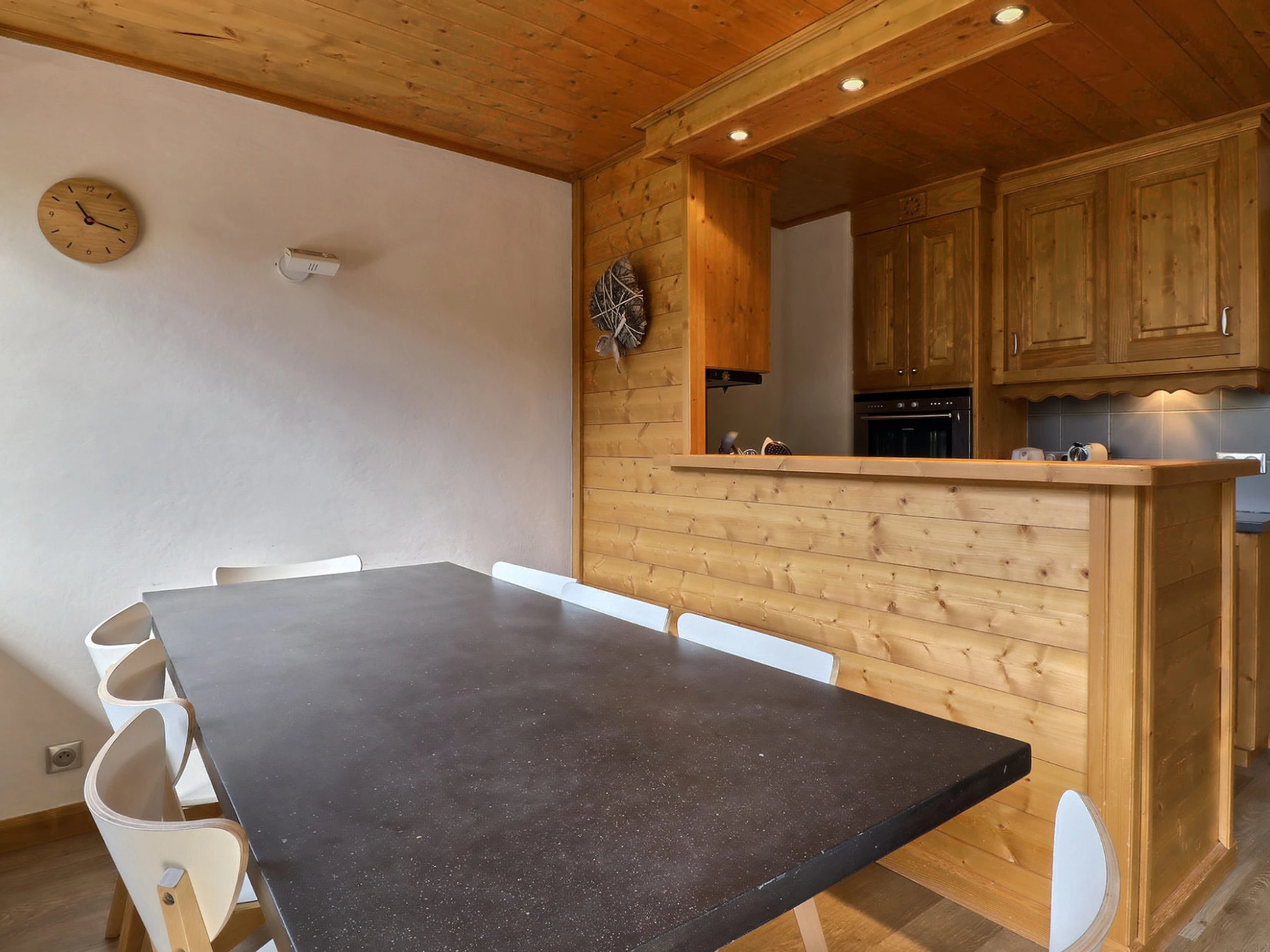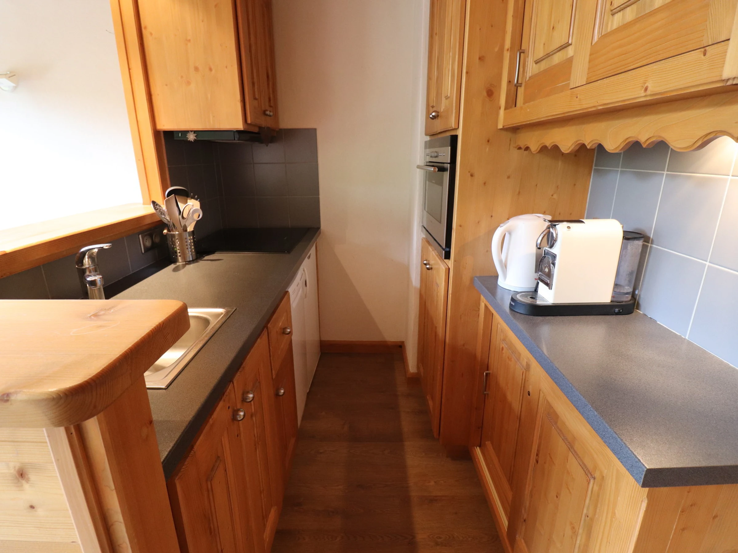 Offene Küche: Kombi-Backofen und Mikrowelle, kleiner Kühlschrank, 4 Cerankochplatten, 45-cm-Geschirrspüler, Nespresso-Kaffeemaschine, Filterkaffeemaschine, Toaster, Wasserkocher, Dunstabzugshaube