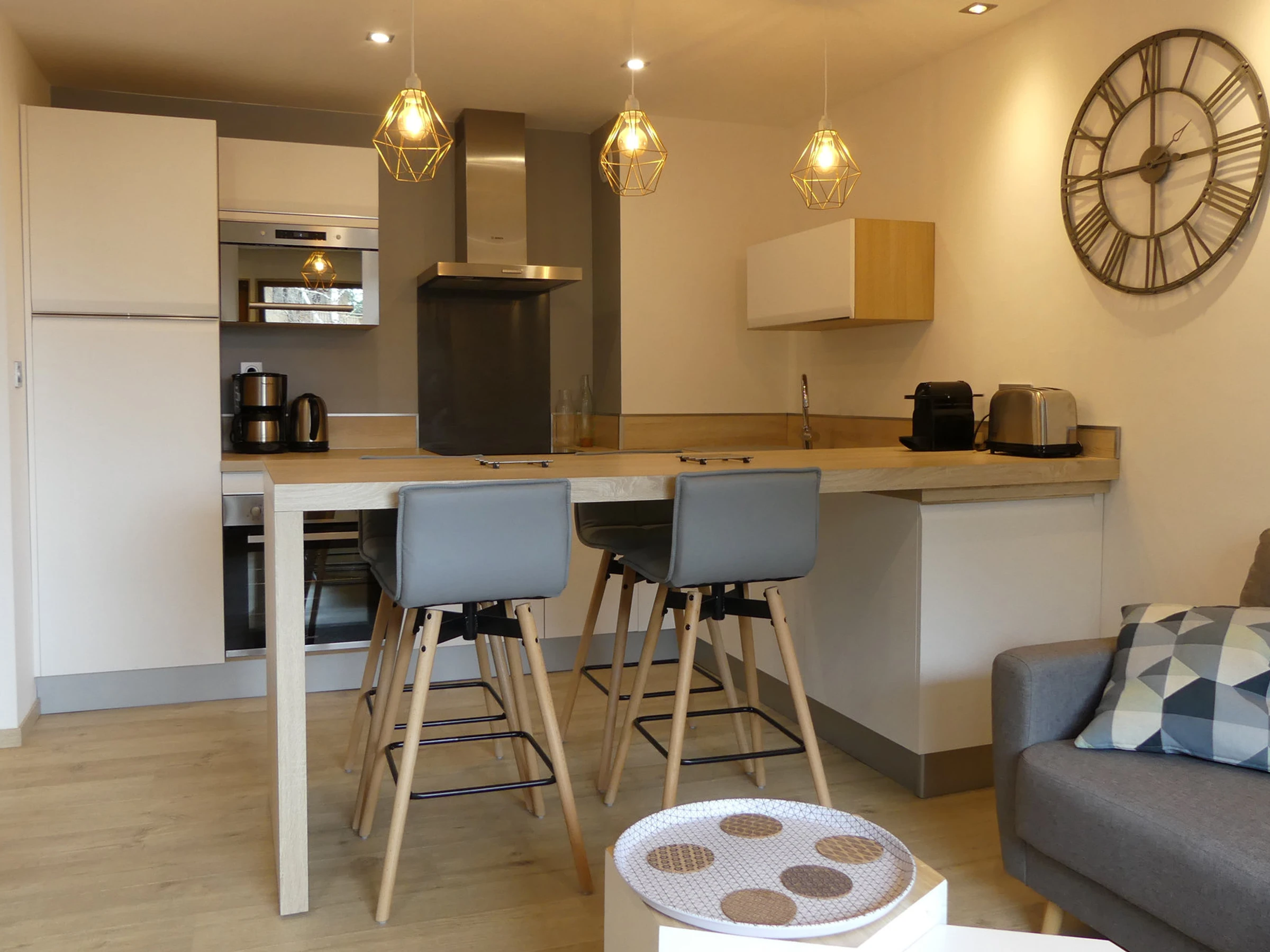 Offene Küche: Mikrowelle, Backofen, Kühlschrank, Geschirrspüler, 4-Platten-Cerankochfeld, Nespresso-Kaffeemaschine, Filterkaffeemaschine, Toaster, Wasserkocher, Dunstabzugshaube
