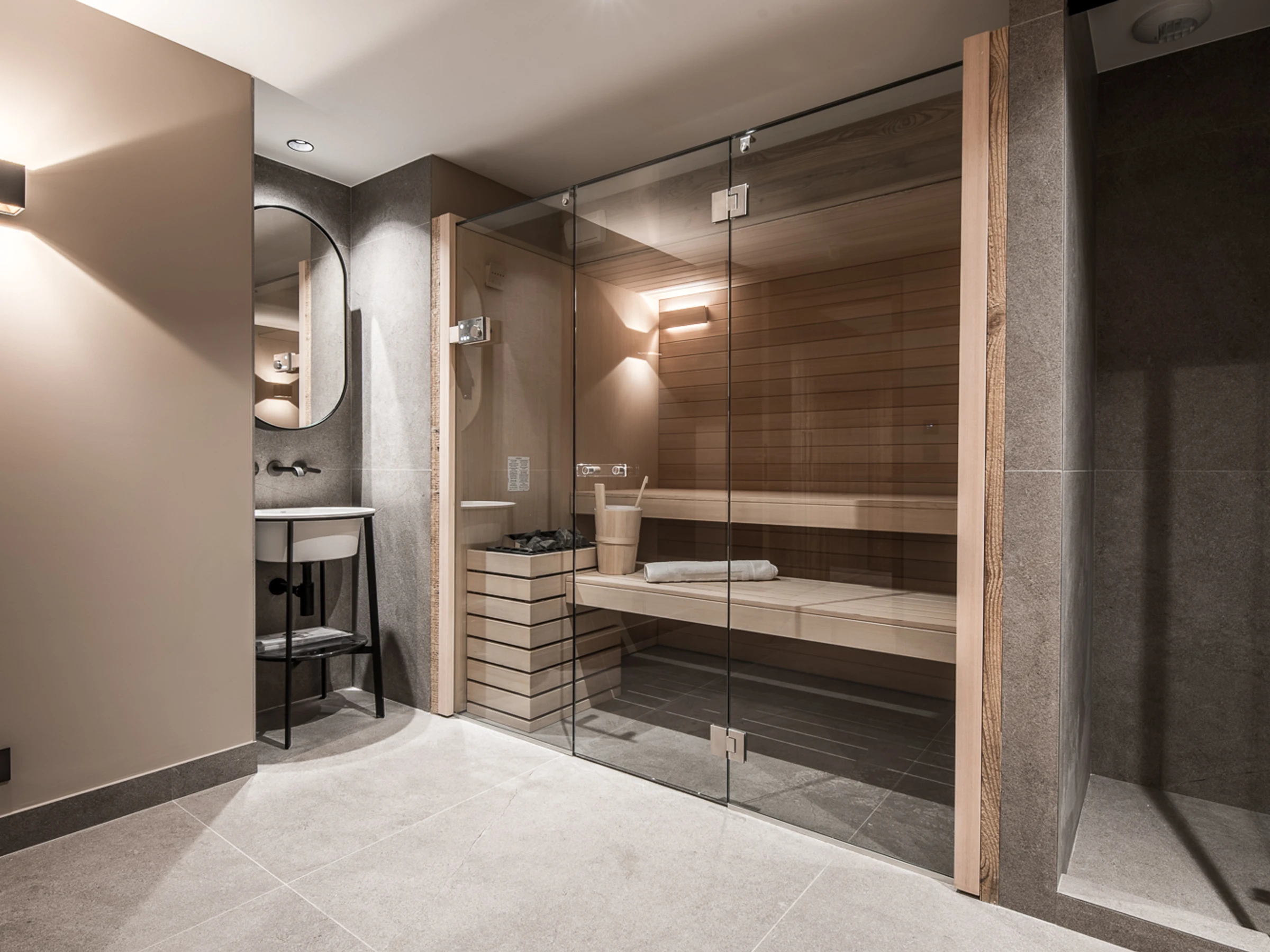 - Entspannungsbereich mit Sauna, Dusche und Waschbecken.