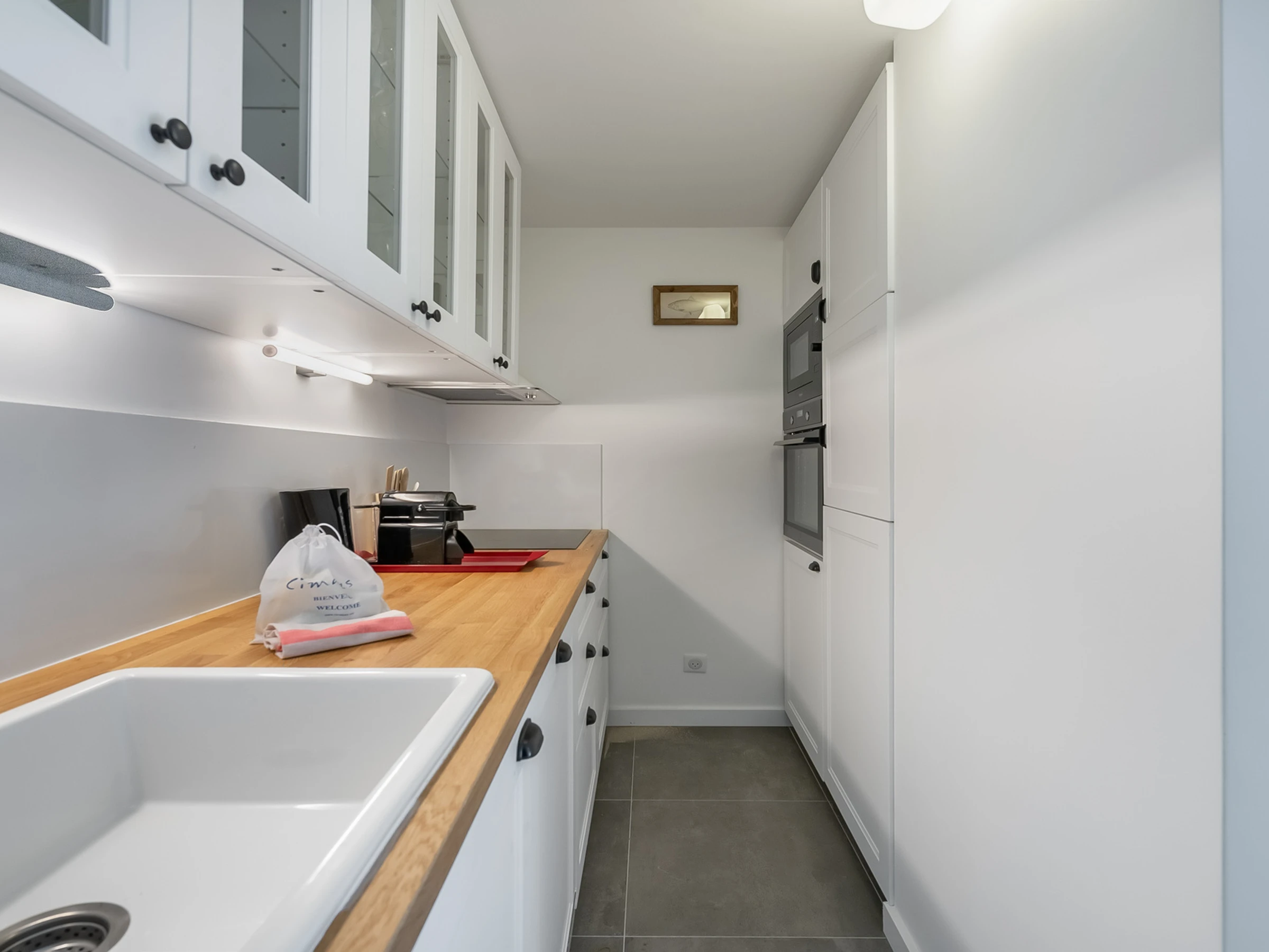 - Offene Küche: Kühlschrank, Backofen, Mikrowelle, Geschirrspüler, Induktionskochfeld, Toaster, Wasserkocher und Nespresso-Maschine