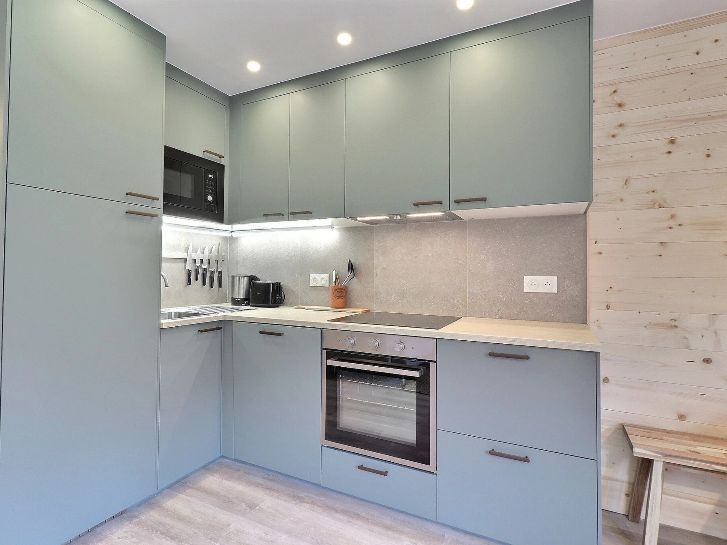 Offene Küche: Mikrowelle, Backofen, Geschirrspüler, Kühlschrank, 4-Platten-Cerankochfeld, Dunstabzugshaube