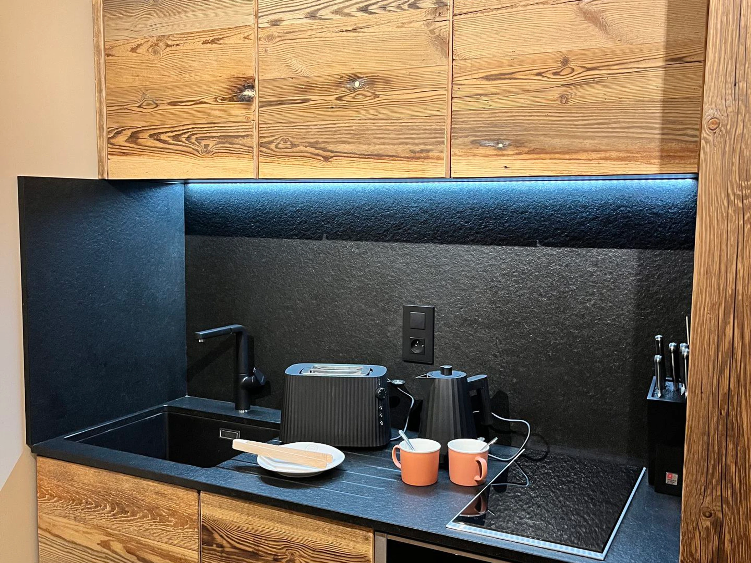 Offene Küche: 2 Cerankochfelder, traditioneller Ofen, Geschirrspüler, Raclette-Gerät, Crêpe-Maker, Wasserkocher, Nespresso-Maschine, Toaster