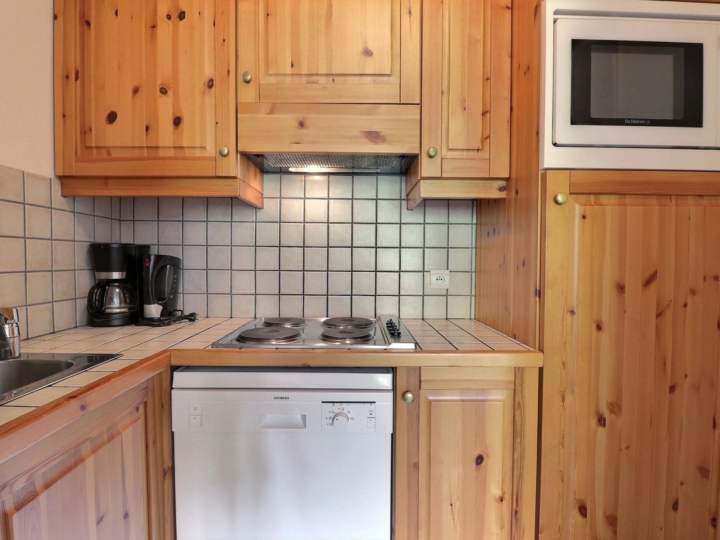 Küchenzeile: Backofen mit Mikrowelle, Kühlschrank, Geschirrspüler, 4 Kochplatten, Dunstabzugshaube, Filterkaffeemaschine, Toaster, Wasserkocher