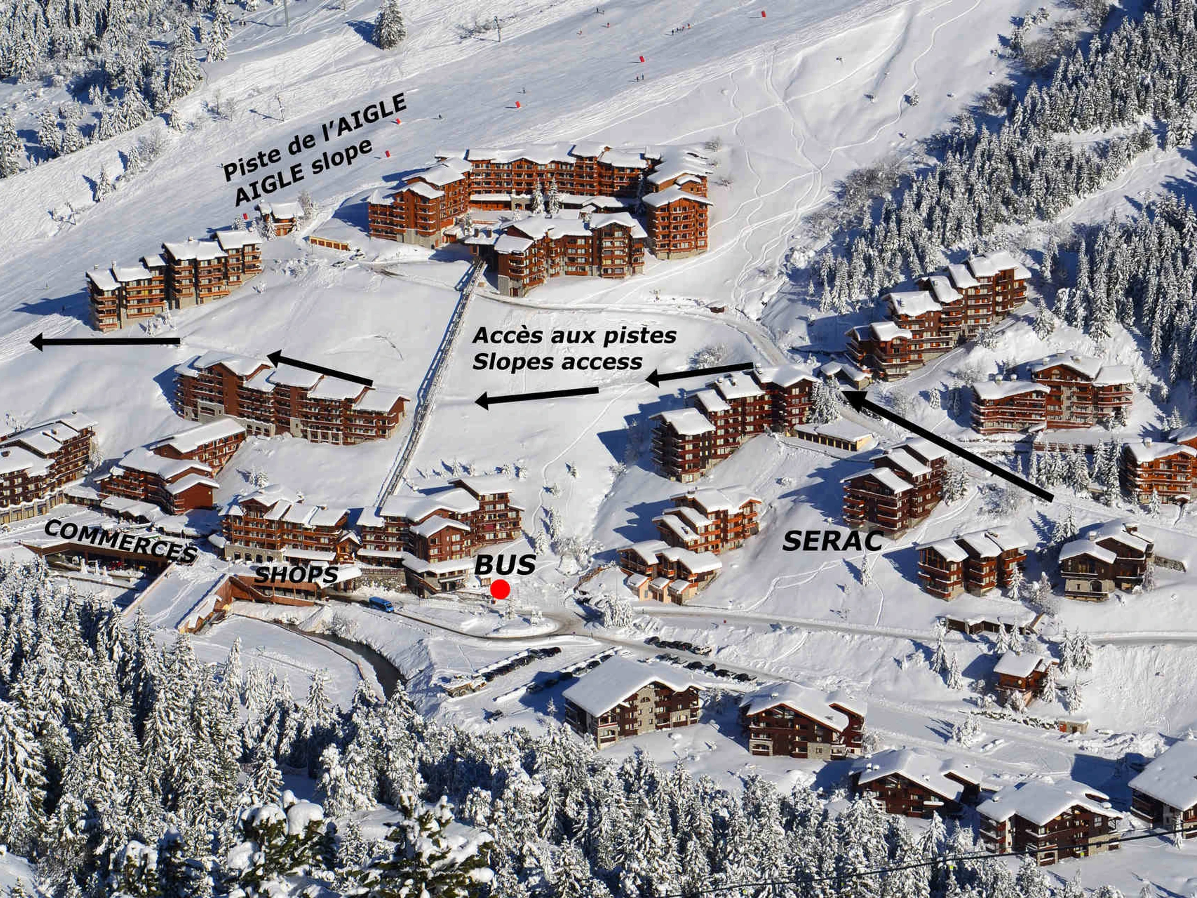 Um zu den Pisten zu gelangen, gehen Sie 1 Minute (100 Meter) die Straße hinauf und benutzen Sie den Schneeweg, um zur blauen Piste zu gelangen (kann benutzt werden, wenn die Schneedecke dick genug ist). Alternativ können Sie 300 m hinauf in Richtung der Residenz Plattières gehen, um die Aigle-Piste hinunterzufahren und zur Abfahrt der Lifte zu gelangen. Die nächste Bushaltestelle befindet sich vor dem Geschäftszentrum von Chatelet, 5 Gehminuten von der Bushaltestelle „Chatelet“ entfernt.