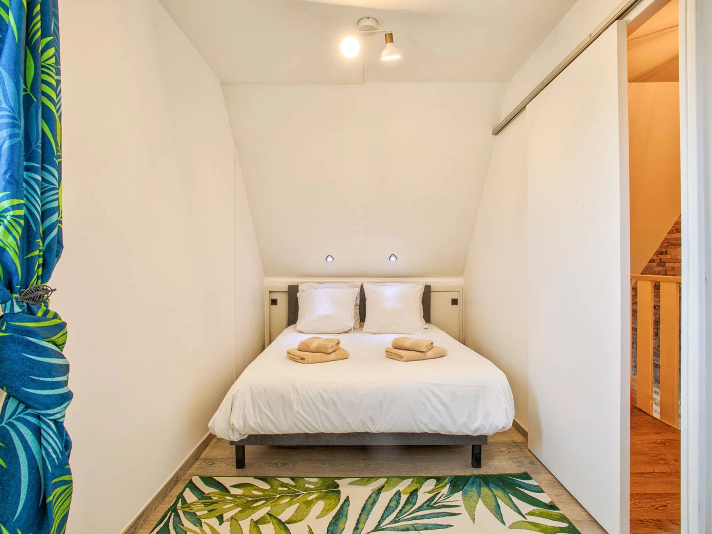 Im Obergeschoss führt ein kleiner Flur zu einem privaten, geschmackvoll eingerichteten Schlafzimmer. Es verfügt über ein Doppelbett und einen großen Kleiderschrank, in dem Sie Ihre Sachen bequem verstauen können.