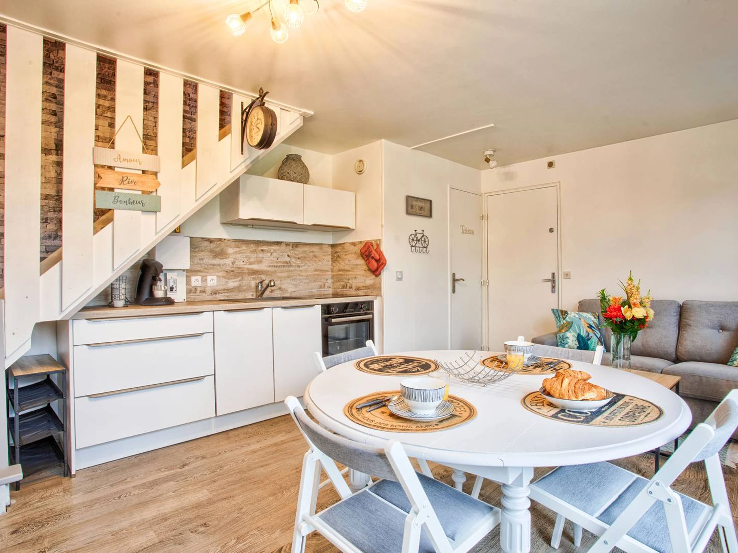 Entdecken Sie dieses gemütliche Apartment im ersten Stock eines der Gebäude der Wohnanlage „Côte Fleurie“ in Merville-Franceville-Plage – der ideale Ort für einen entspannten Urlaub am Meer. Schon beim Betreten werden Sie von einem warmen und geschmackvoll eingerichteten Wohnbereich empfangen.