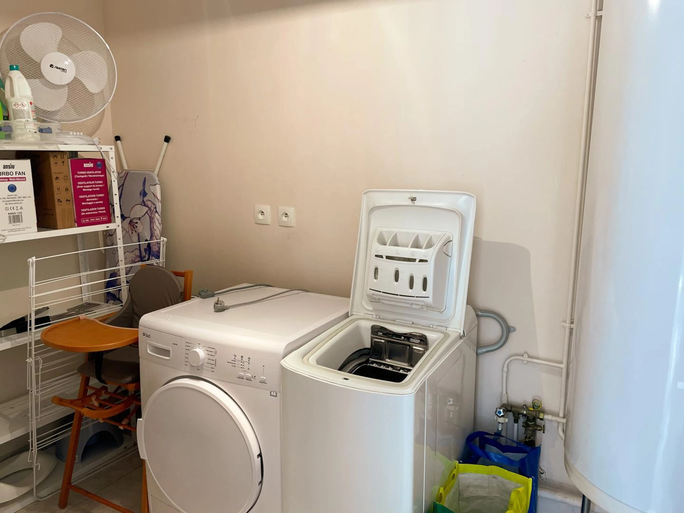 Im Erdgeschoss. : ausgestattete Küche und Tisch. Hintere Küche mit Reinigungsgeräten, Waschmaschine, Trockner usw. Wohnzimmer (TV). WC.