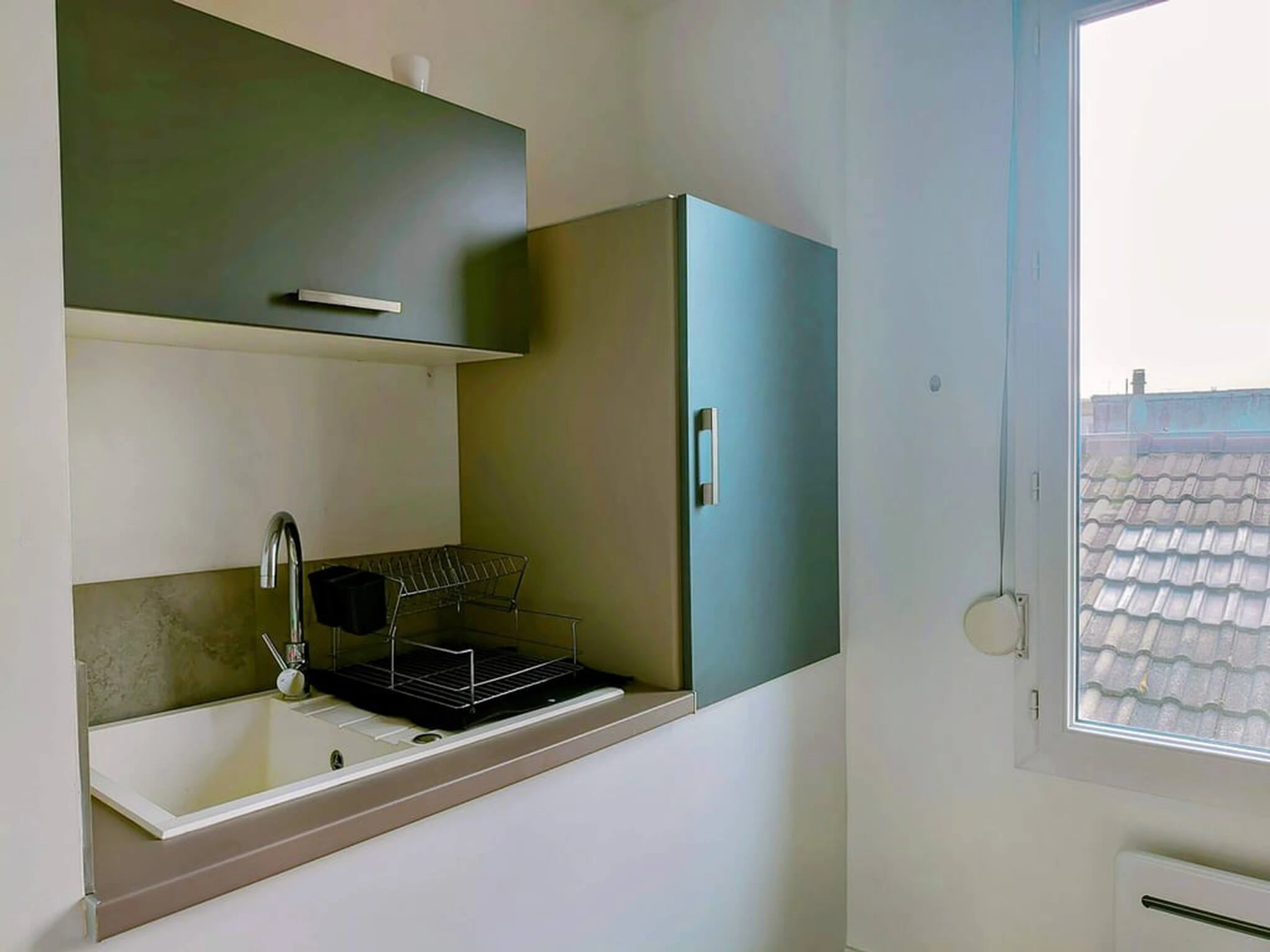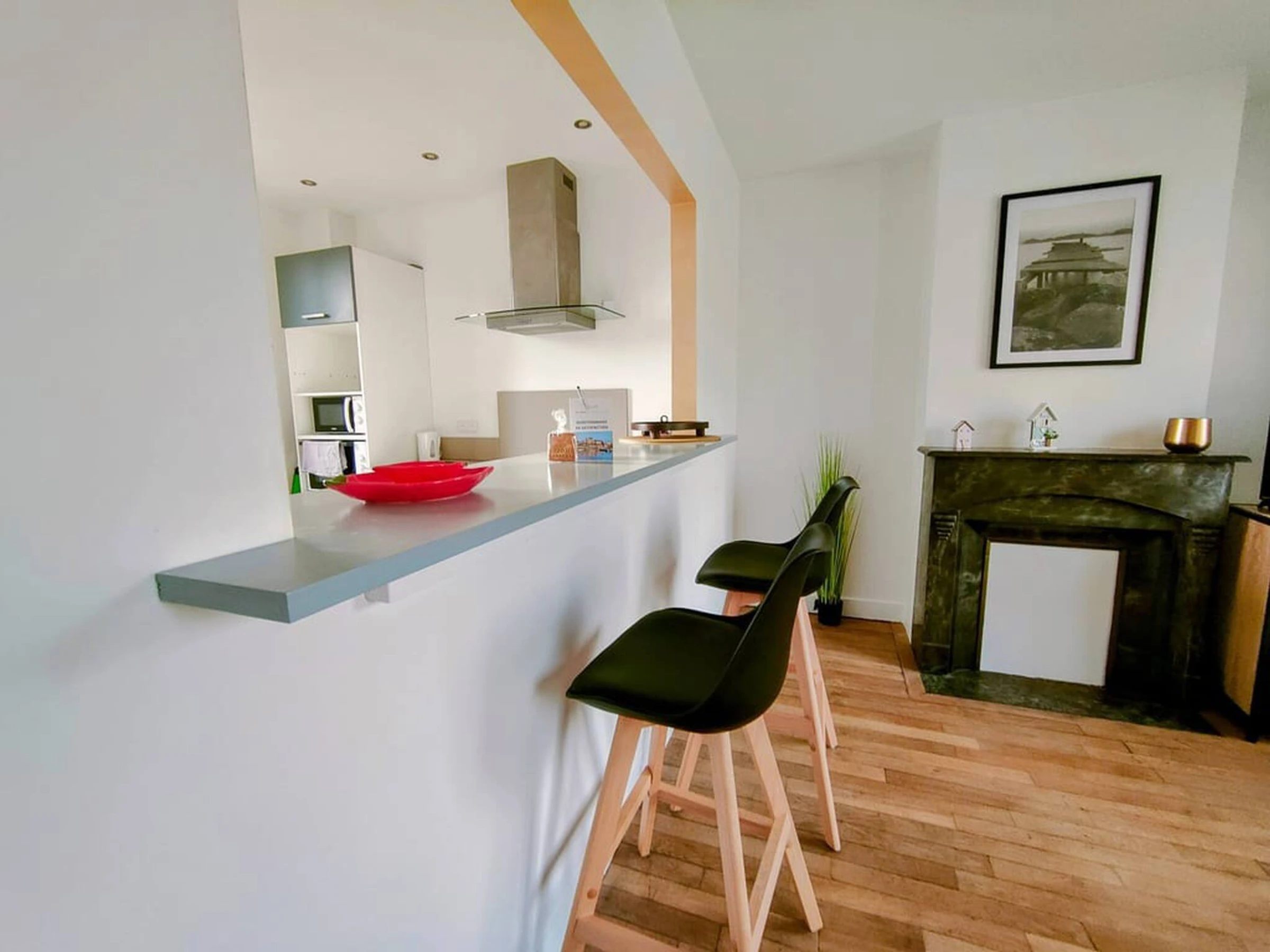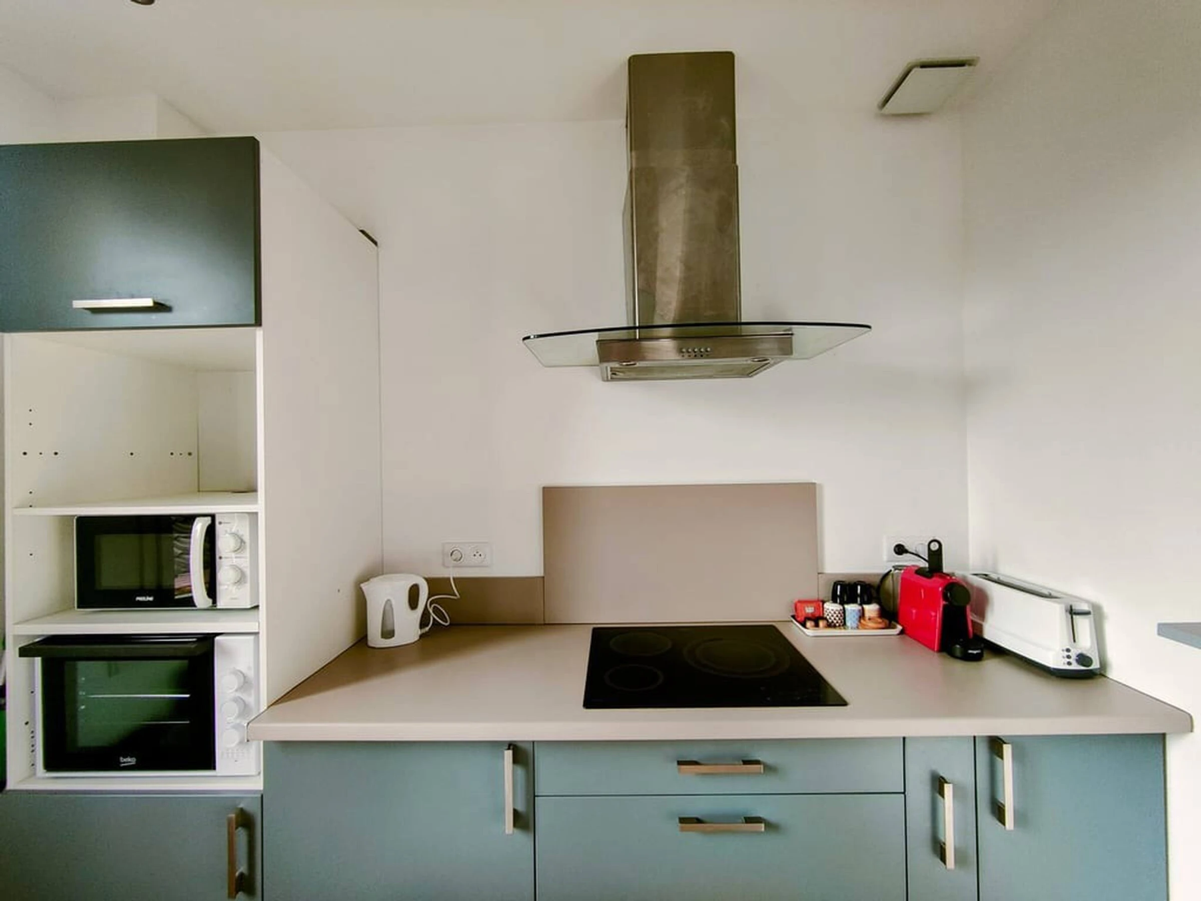Dieses offene küche, elektrisches kochfeld, ist ausgestattet in kühlschrank, mikrowelle, backofen, geschirr/besteck, kochutensilien, kaffeemaschine, toaster und wasserkocher.