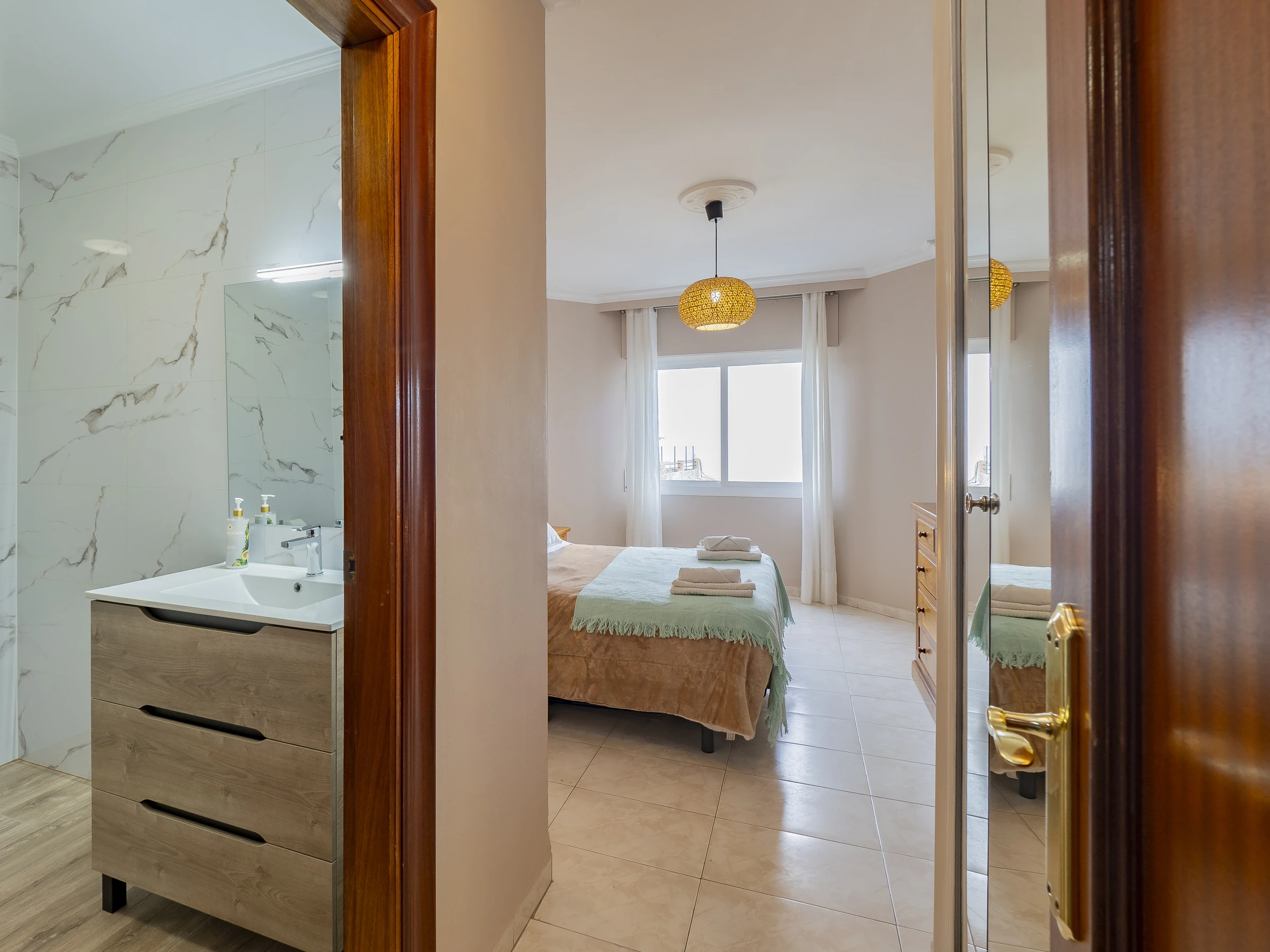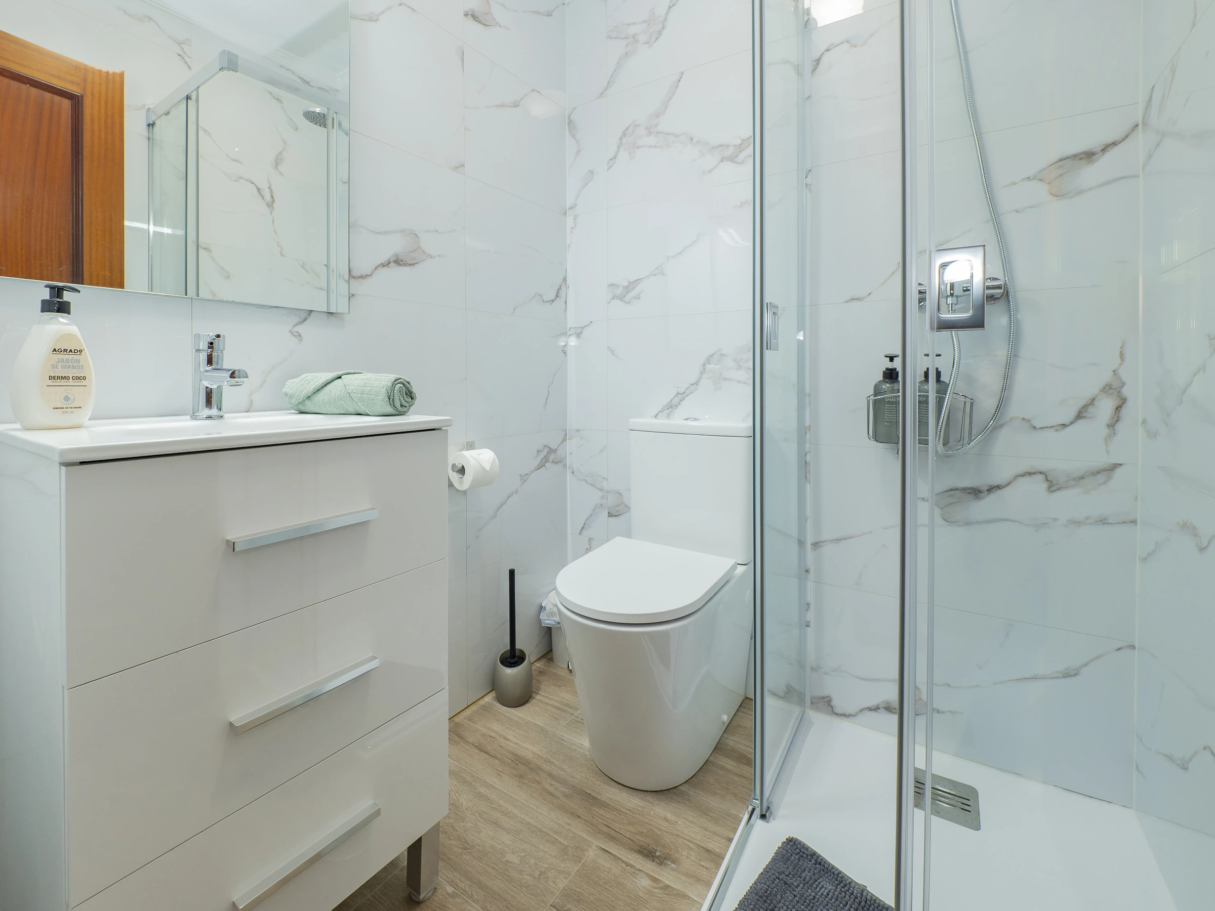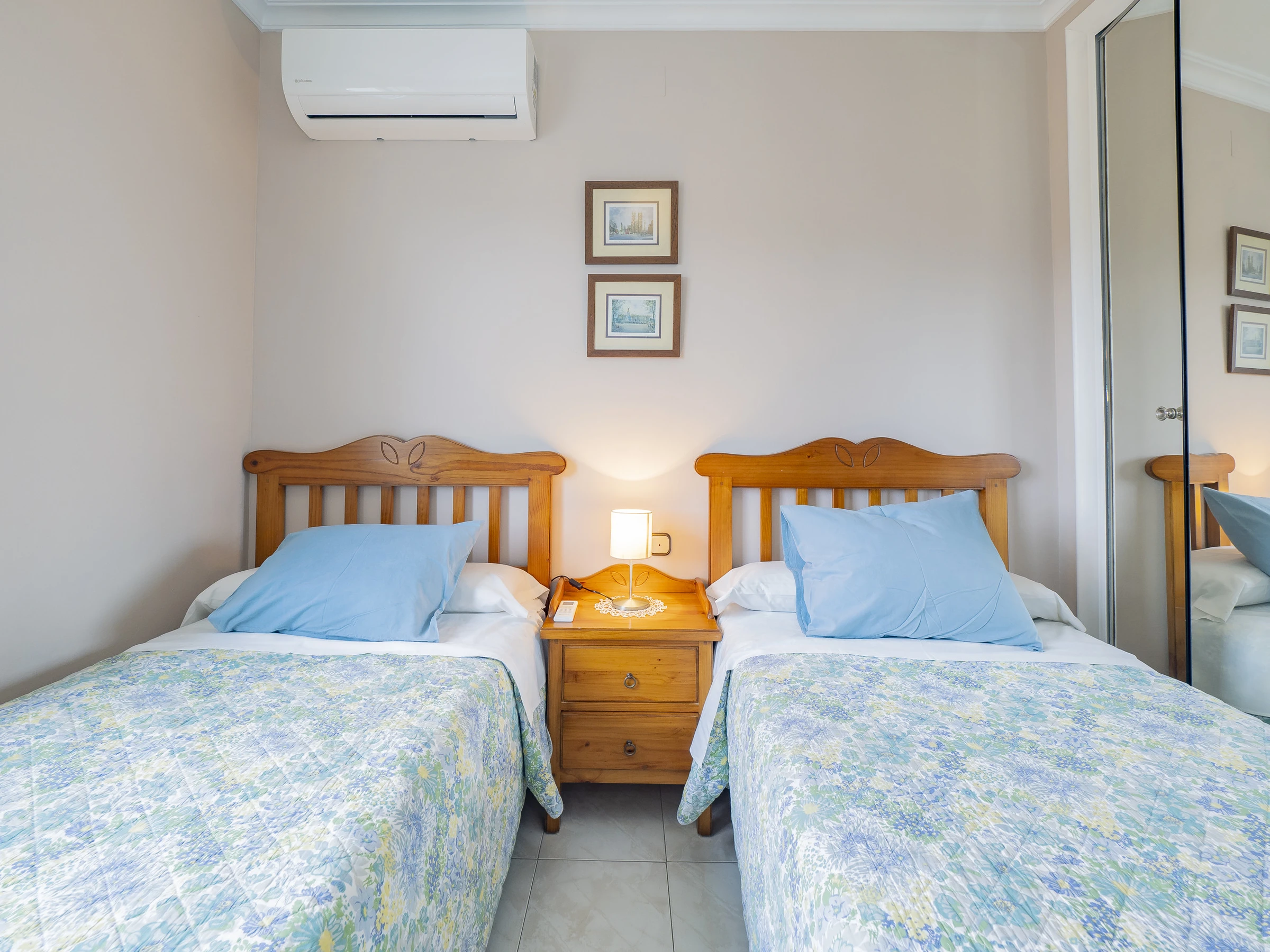 Die Verteilung umfasst ein Hauptschlafzimmer mit einem Doppelbett und einem Badezimmer en suite für maximale Privatsphäre, ein zweites Schlafzimmer mit zwei Einzelbetten, ideal für Freunde oder Kinder, und ein zusätzliches vollständiges Badezimmer mit Dusche für mehr Komfort.