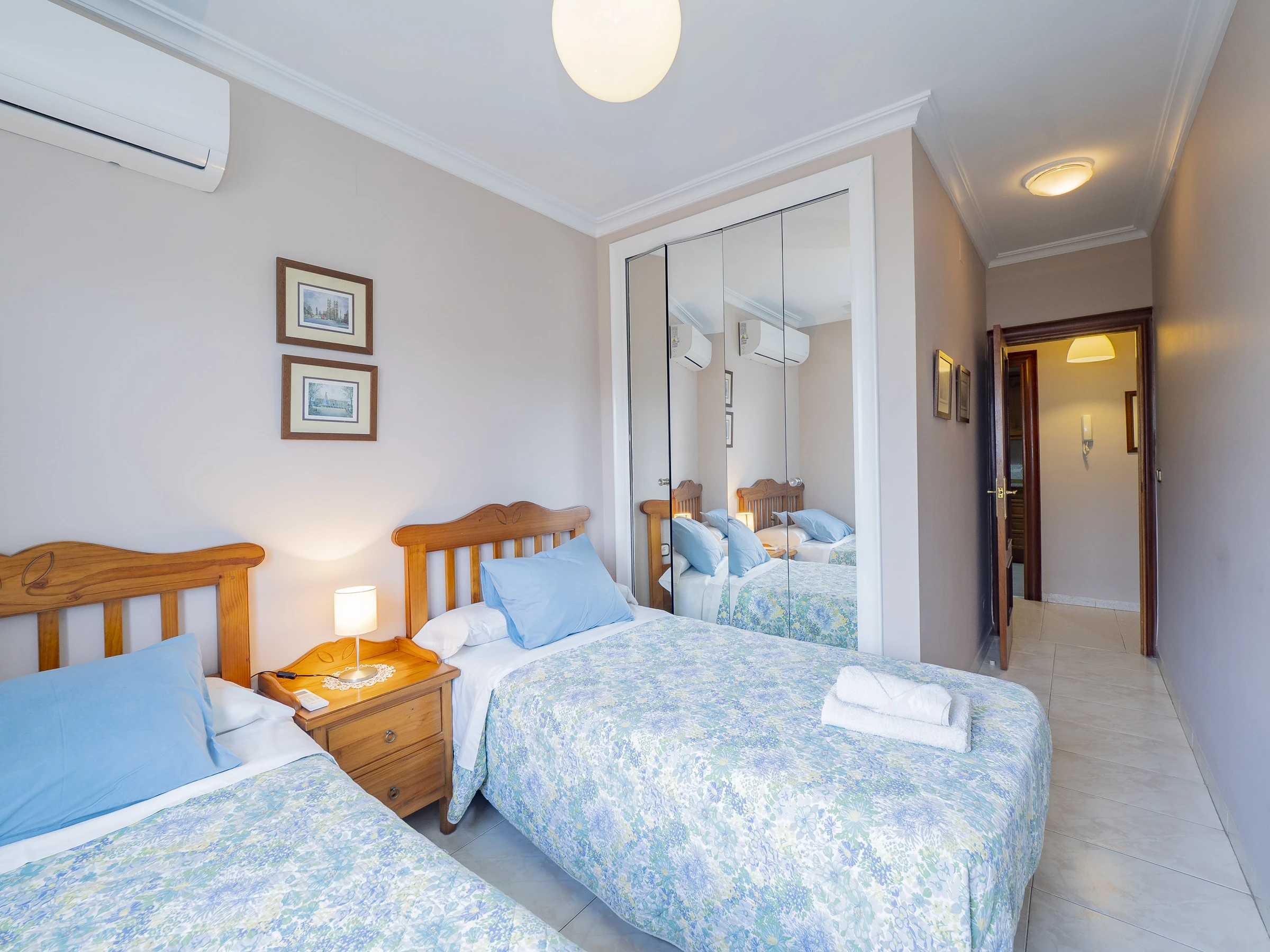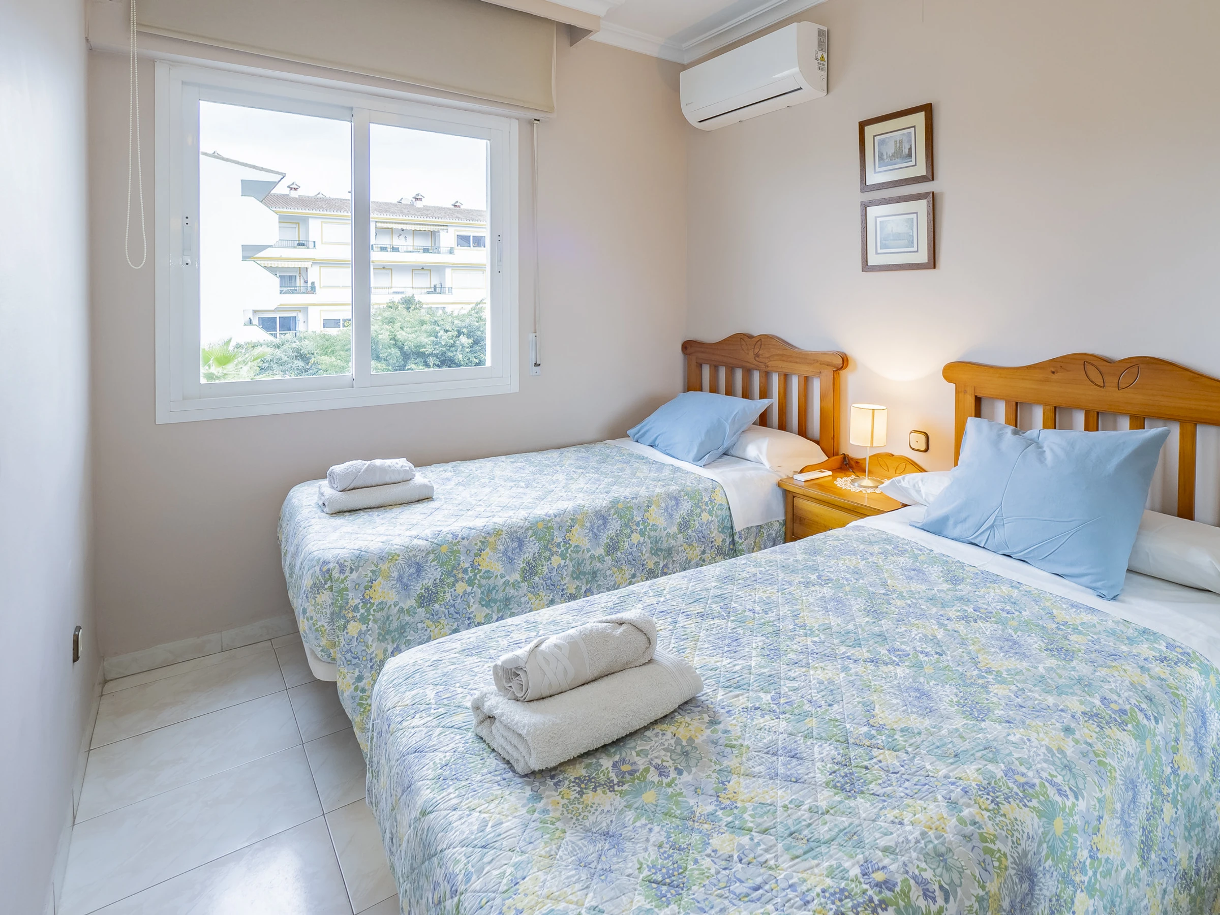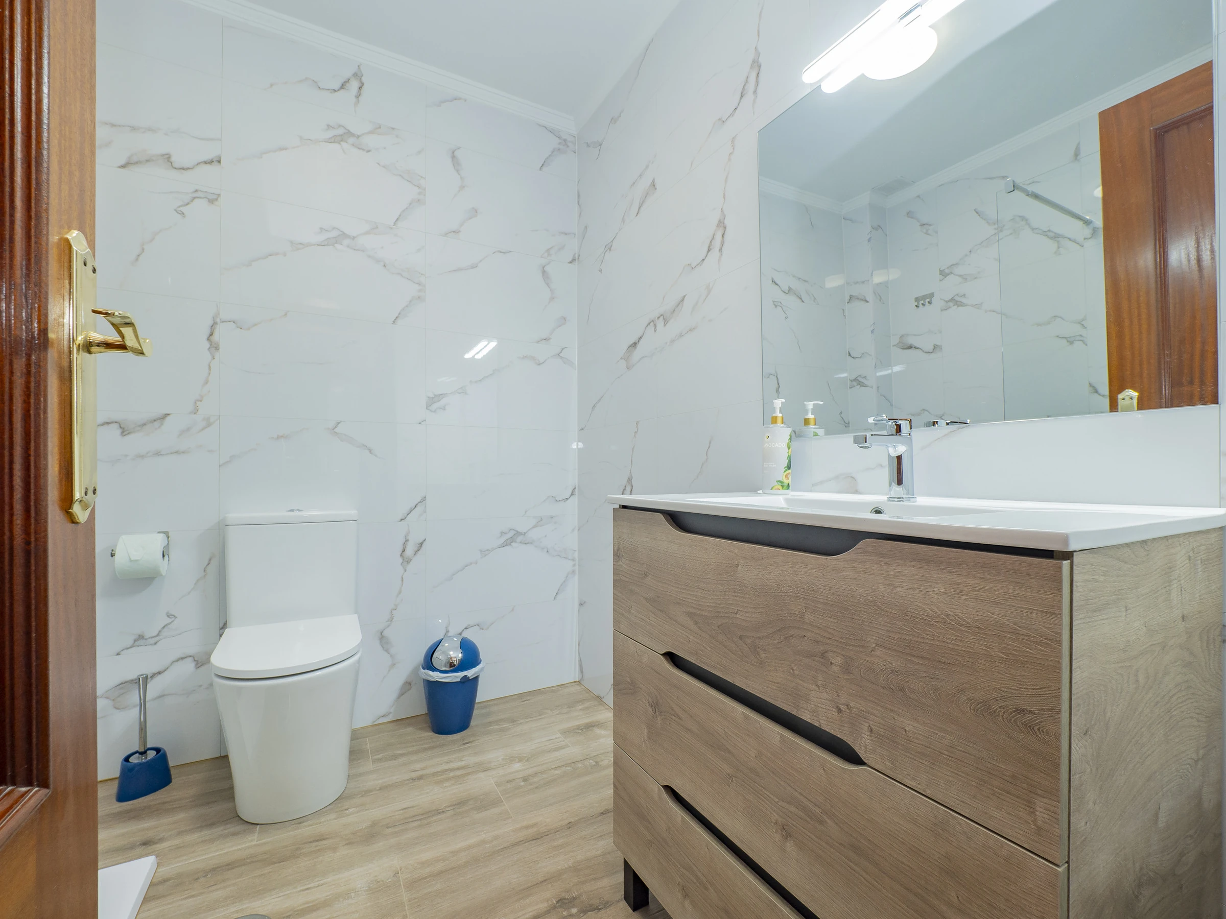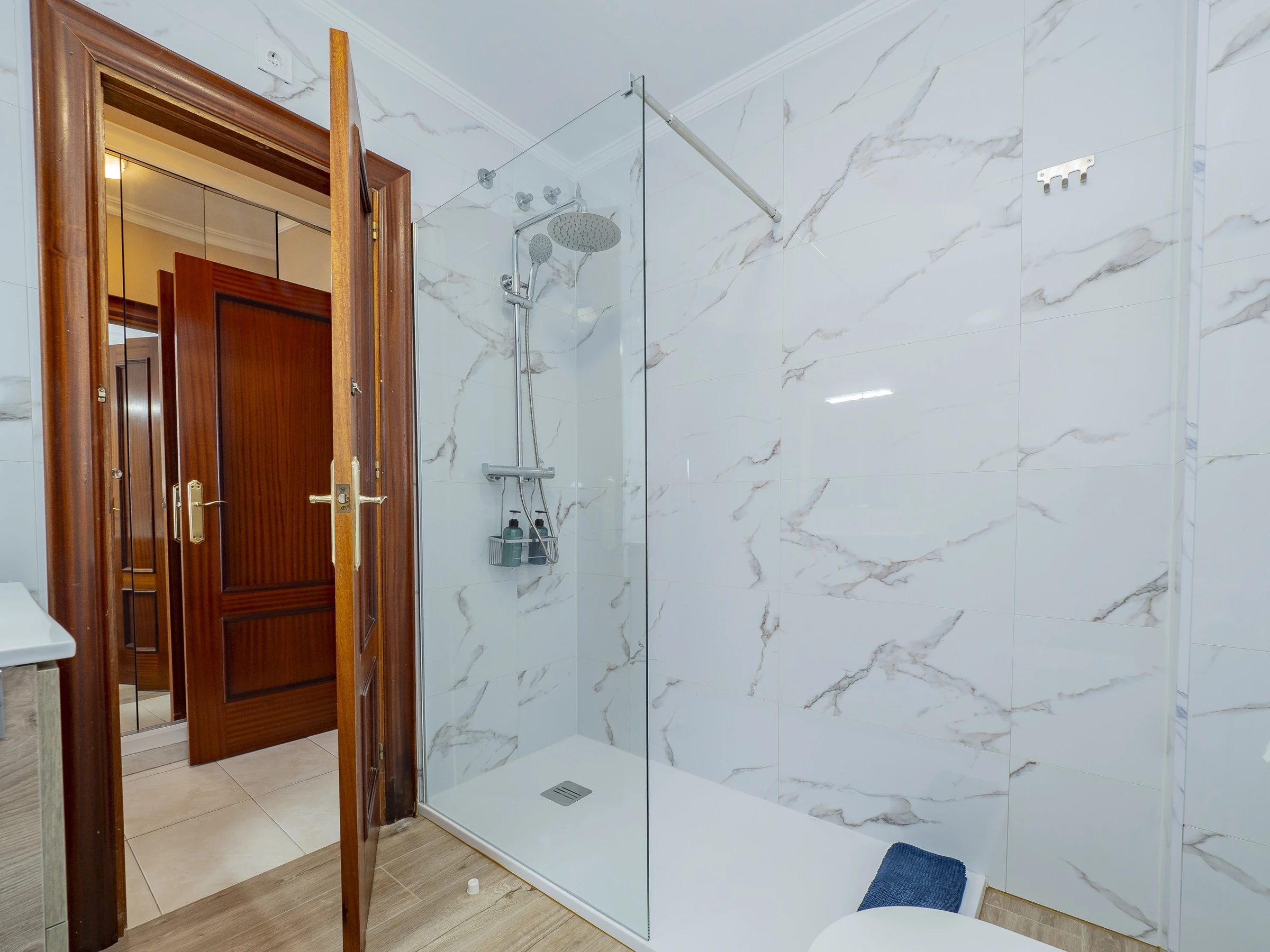 Die Verteilung umfasst ein Hauptschlafzimmer mit einem Doppelbett und einem Badezimmer en suite für maximale Privatsphäre, ein zweites Schlafzimmer mit zwei Einzelbetten, ideal für Freunde oder Kinder, und ein zusätzliches vollständiges Badezimmer mit Dusche für mehr Komfort.