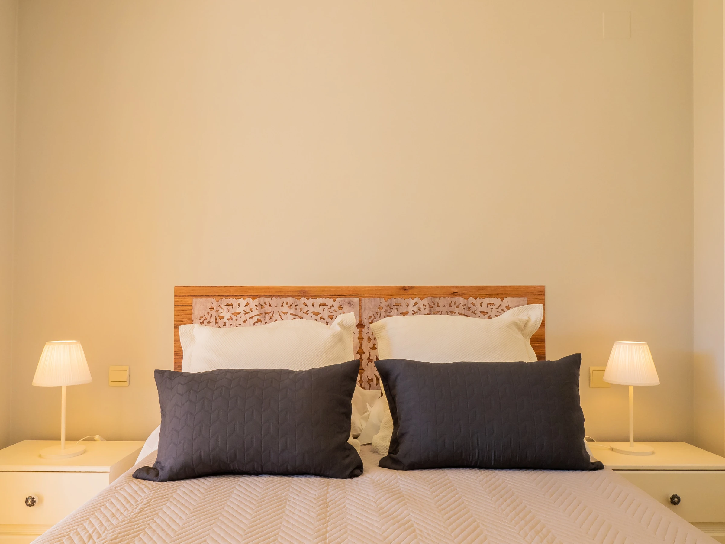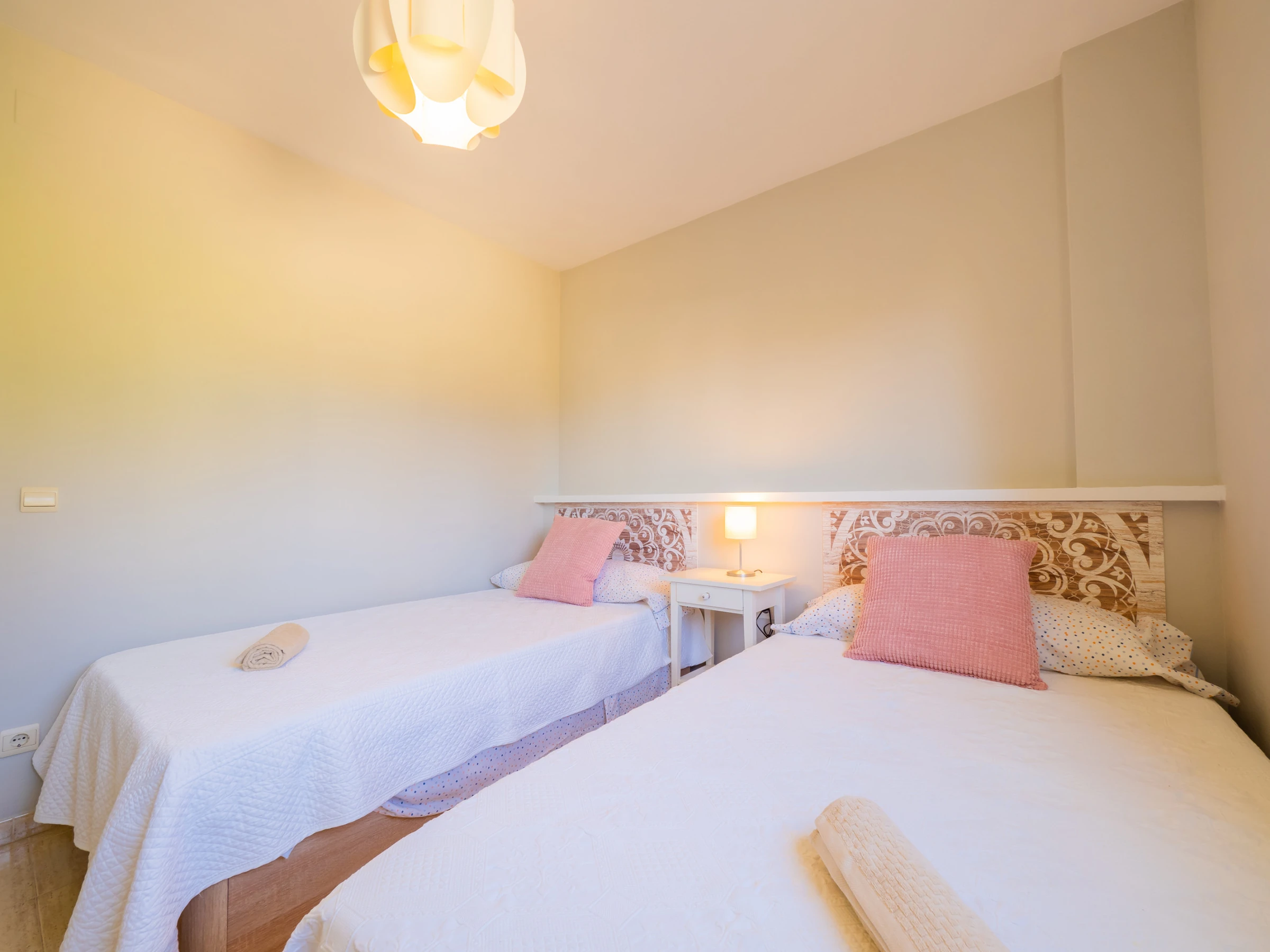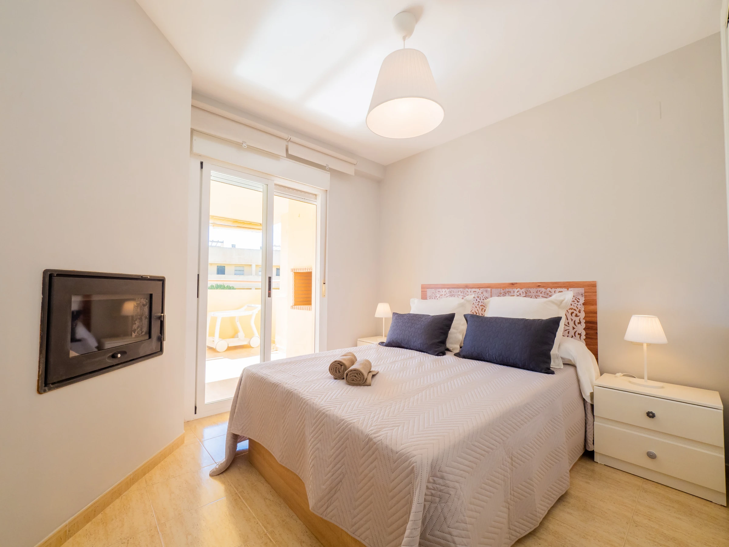 Zur Erholung bietet die Ferienwohnung zwei Schlafzimmer: eines mit Doppelbett und Kamin, um eine gemütliche und romantische Atmosphäre zu schaffen, und ein anderes mit zwei Einzelbetten. Beide Schlafzimmer verfügen über ausreichend Platz, um Ihr Gepäck bequem zu verstauen, und haben Außenfenster, die natürliches Licht hereinlassen 🛏️✨.