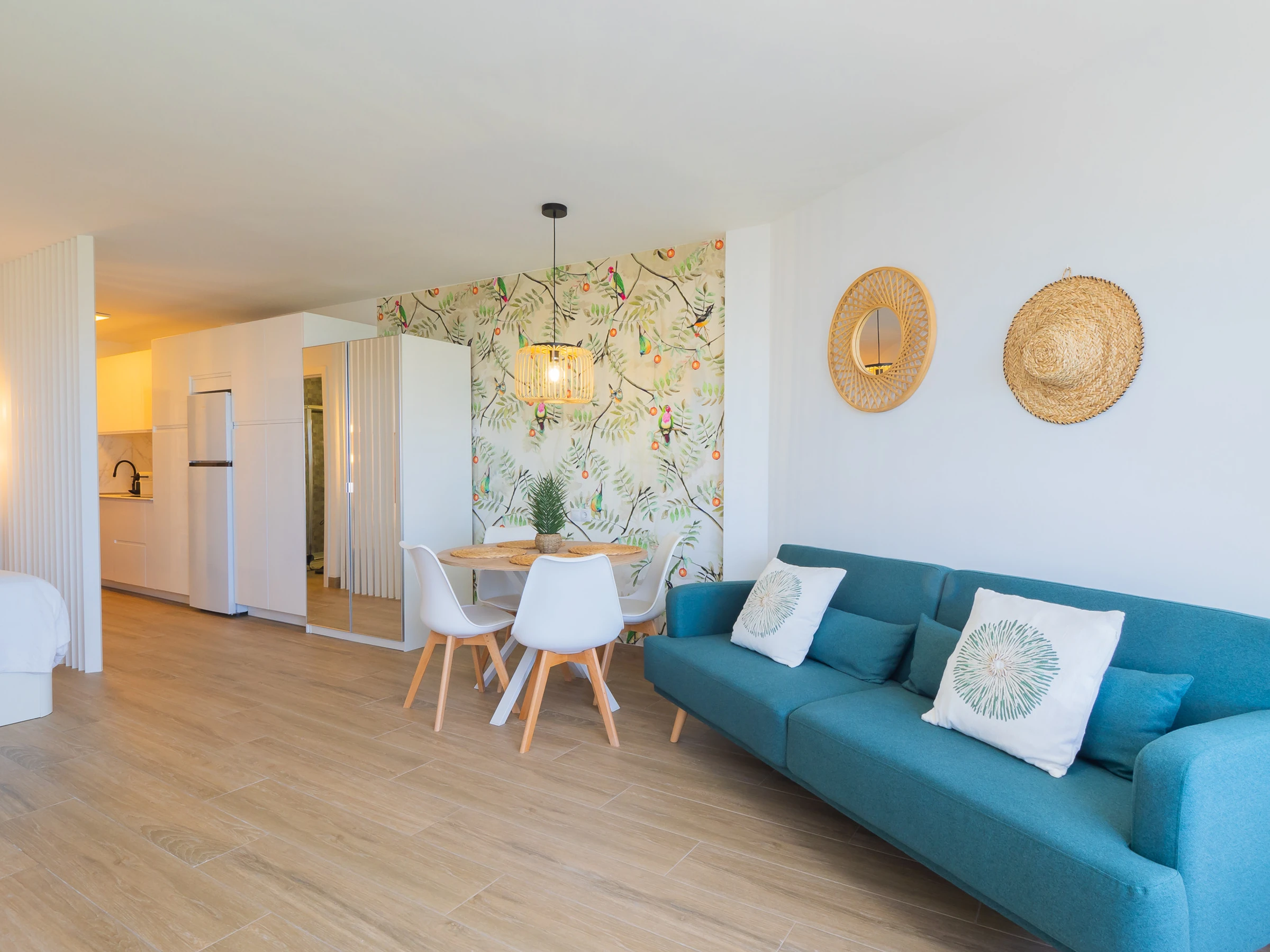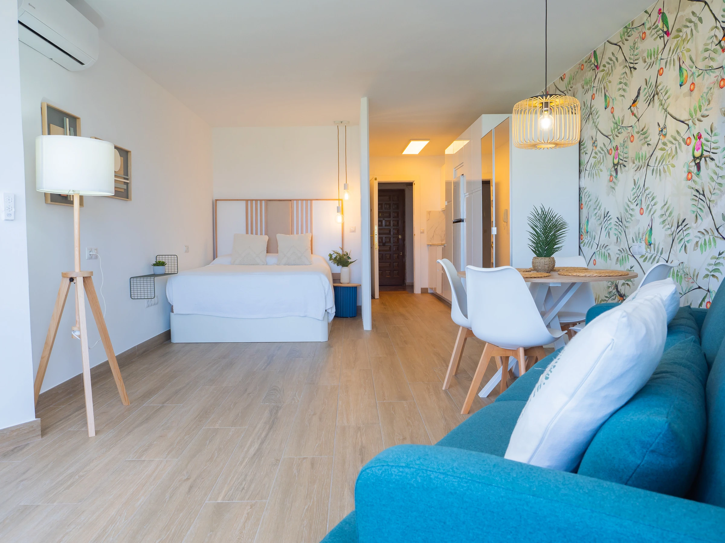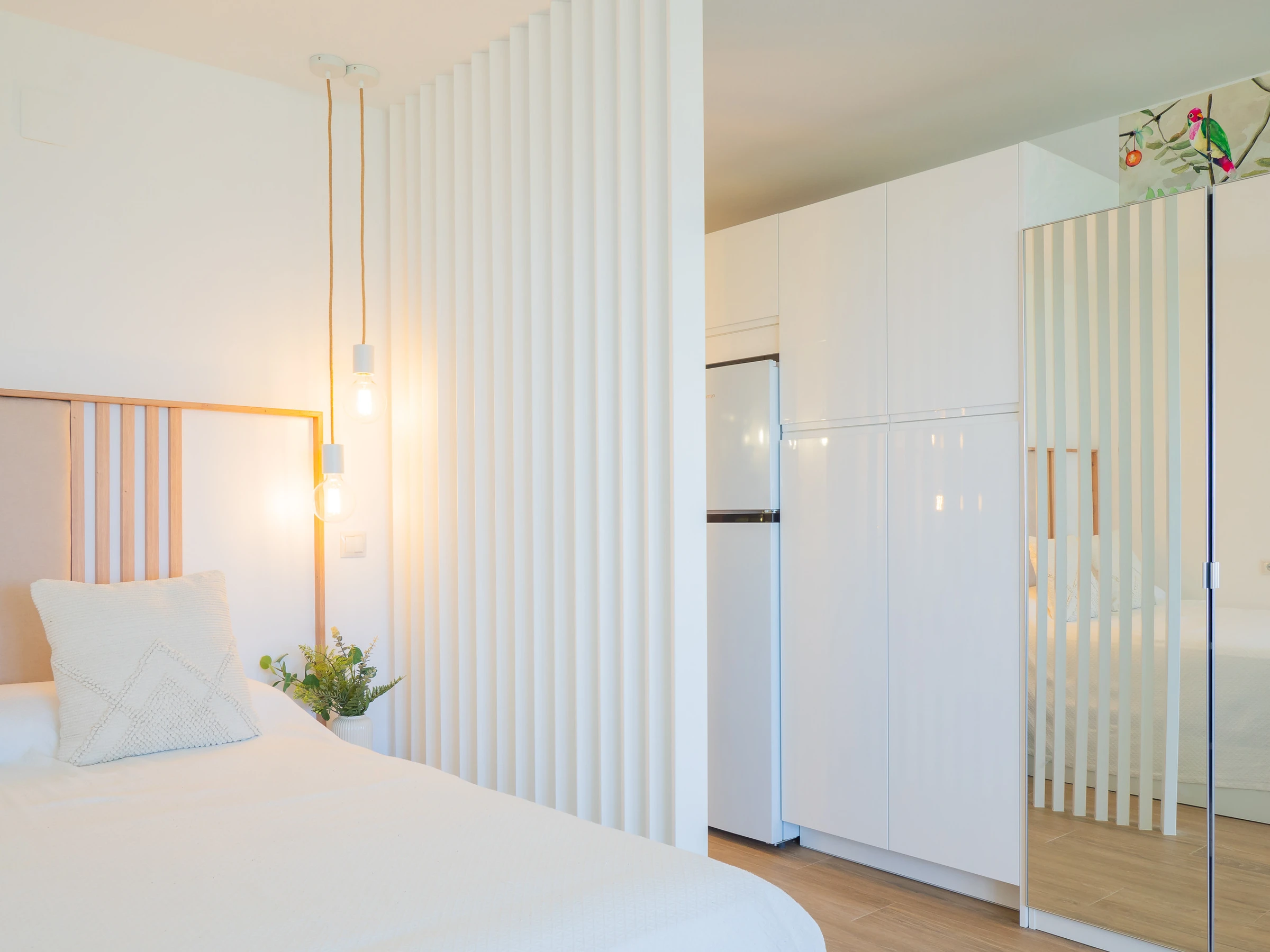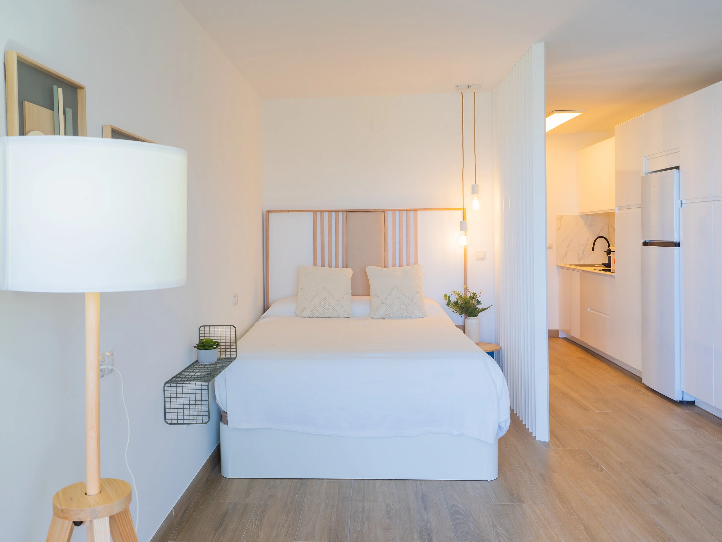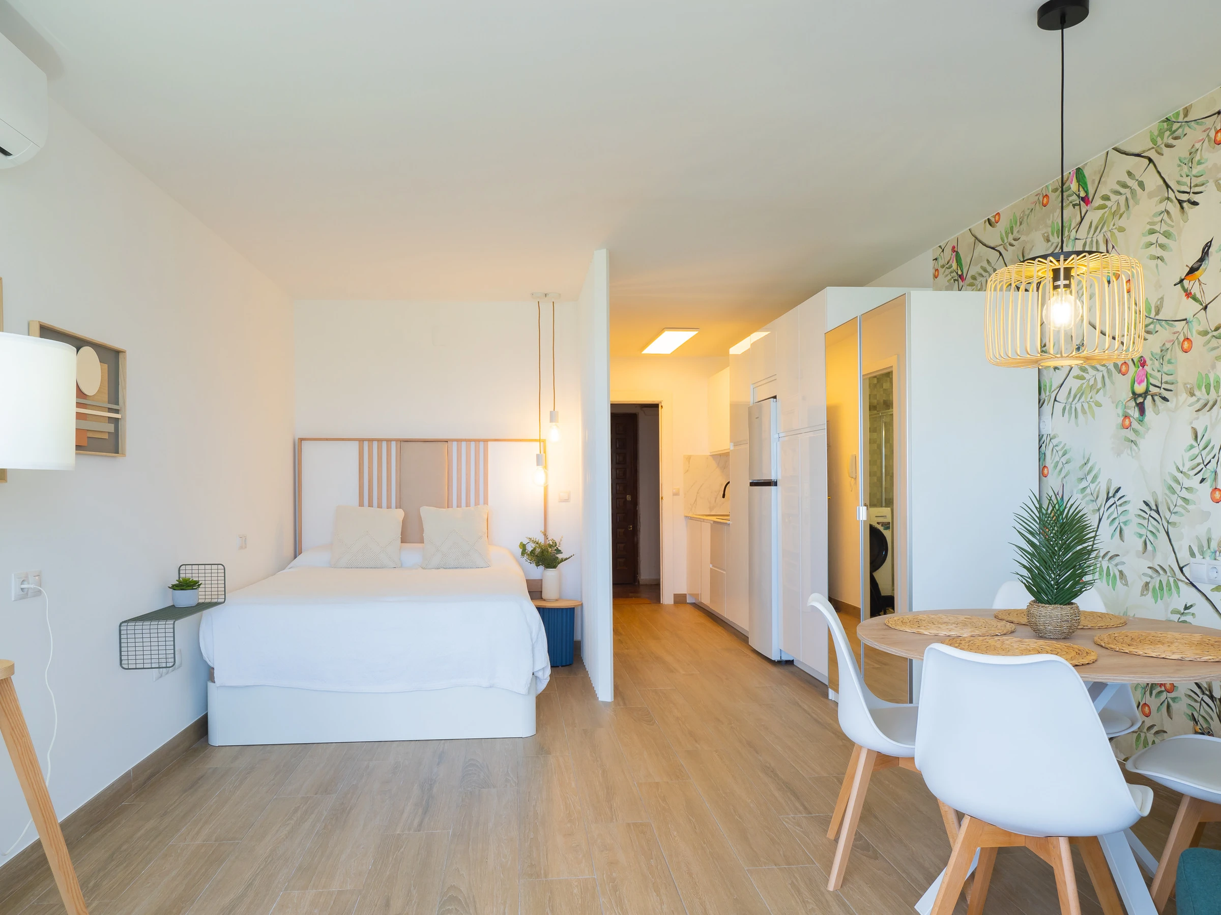 Mit 35 m² geschmackvoll und im modernen Stil eingerichtet, integriert der Raum Wohn-Esszimmer, offene Küche und Schlafbereich mit einem bequemen Doppelbett. Er verfügt über Klimaanlage, Heizung mit Wärmepumpe, WLAN, Smart-TV, Ventilator, Waschmaschine, Trockner und Bügeleisen, um einen komfortablen und funktionalen Aufenthalt zu gewährleisten. Die Küche ist ausgestattet mit Glaskeramikkochfeld, Kühlschrank, Mikrowelle, Gefrierschrank, Geschirrspüler, Küchenutensilien und Kaffeemaschine, damit Sie Ihre Mahlzeiten problemlos zubereiten können.